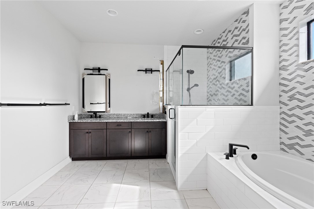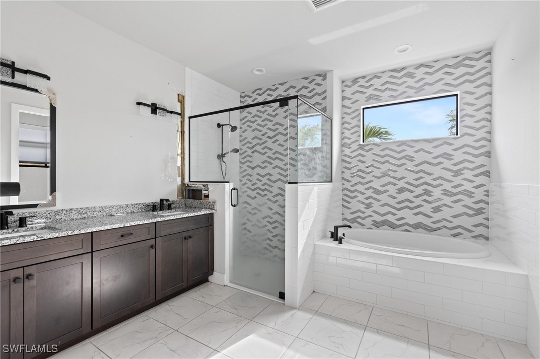 The master suite is a true retreat, featuring its own private entry, dual walk-in closets, a coffered ceiling, and sliding glass doors that lead to the pool. The spa-like master bath is your personal sanctuary, boasting a luxurious Kohler soaking tub, ideal for unwinding after a long day.