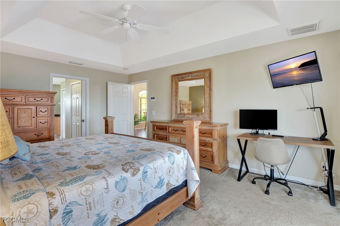This home features a split floorplan, with a large master bedroom and en-suite master bath. The master bath has dual sinks, granite countertops, and a separate shower and tub.