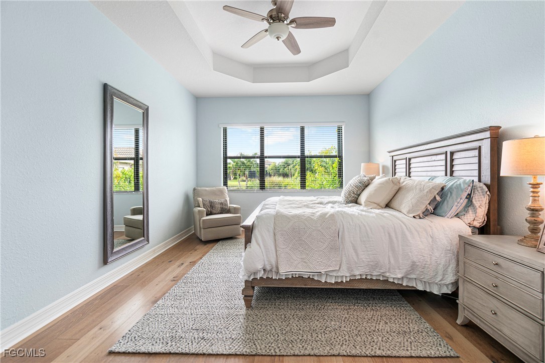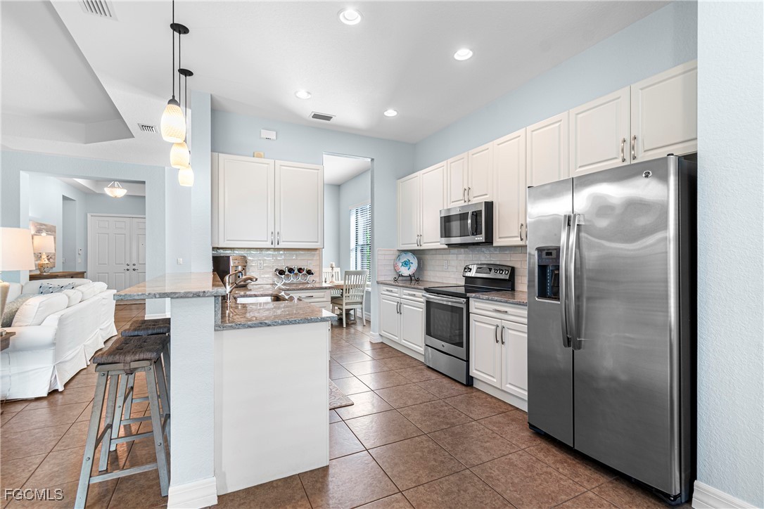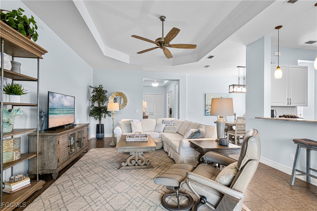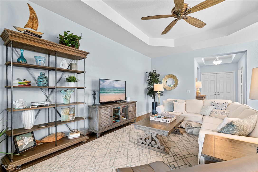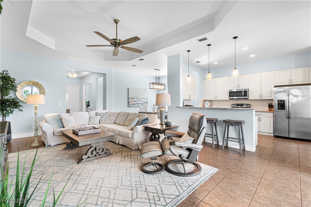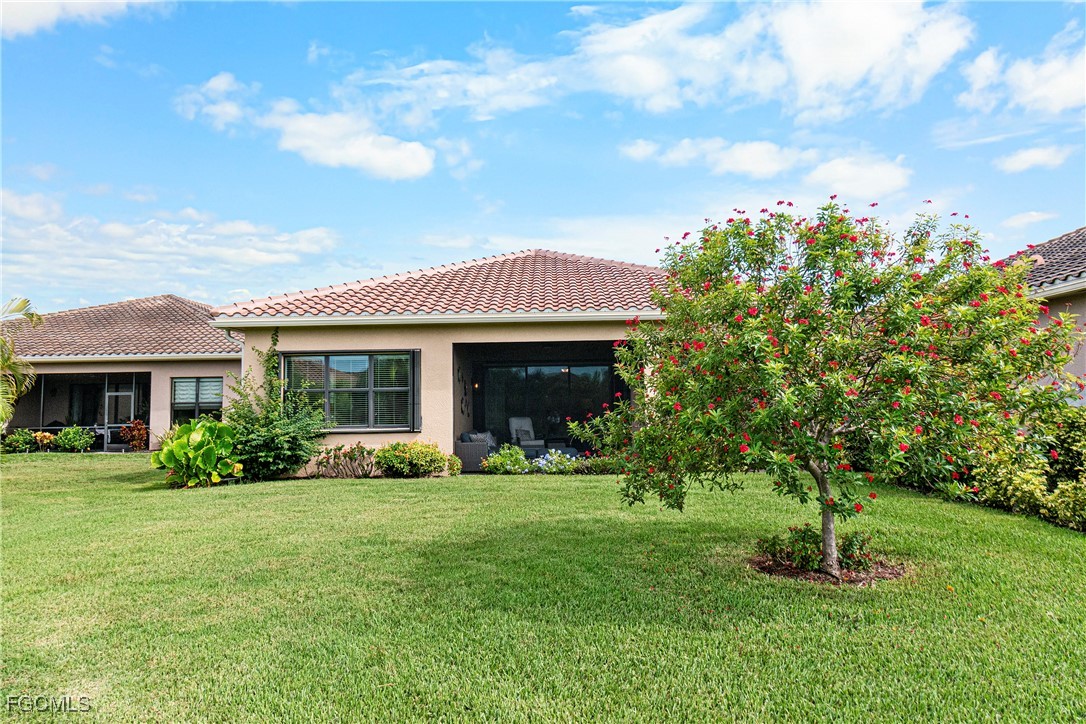 Welcome home to this stunning Grenada model by GL Homes, perfectly situated on a quiet cul-de-sac! Meticulously maintained with thoughtful upgrades, this home offers over 2,100 square feet with three bedrooms, a den, three full bathrooms, serene lake views, a rare THREE-car garage, and a long driveway for plenty of parking. Highly desirable southern exposure means the home is filled with natural light all day long. The spacious kitchen is a dream for both cooking and entertaining, featuring abundant cabinetry, a pantry, stainless steel appliances, quartz countertops, a tile backsplash, and a breakfast bar. The open layout flows seamlessly into the dining and family rooms, perfect for gatherings and everyday living. The primary suite is a peaceful retreat with dual sinks, a soaking tub, and separate shower. The split-bedroom floor plan ensures guests have privacy, while the versatile den with French doors is ideal for a home office, study, or even a fourth bedroom. Additional highlights include tile floors, engineered hardwood in the bedrooms, tray ceilings, an oversized laundry room with cabinetry and sink, accordion hurricane shutters, and a brand-new roof. Enjoy tranquil lake views from the spacious screened lanai, surrounded by lush tropical landscaping. Take advantage of the larger backyard, ideal for pets, play, or entertaining. All of this is located in Marina Bay, a resort-style community for all ages. You’ll have access to a clubhouse, fitness center, resort and lap pools, splash zone, playground, tennis, pickleball, basketball, and more. Plus, you’re just minutes from beaches, shopping, dining, entertainment, hospitals, and I-75. This home truly has it all, don’t miss your chance to make it yours!