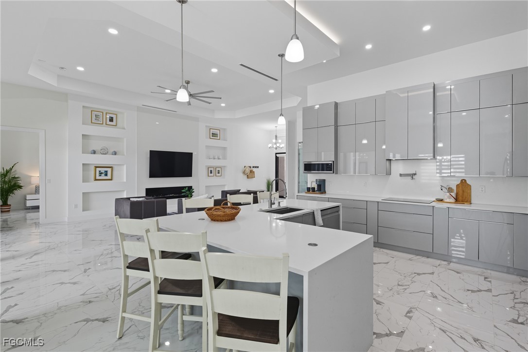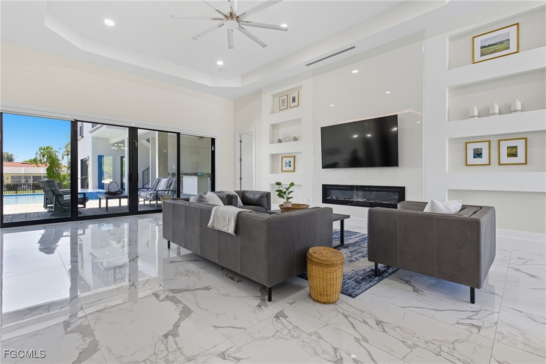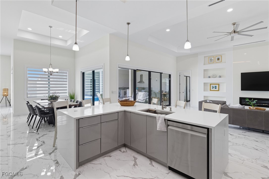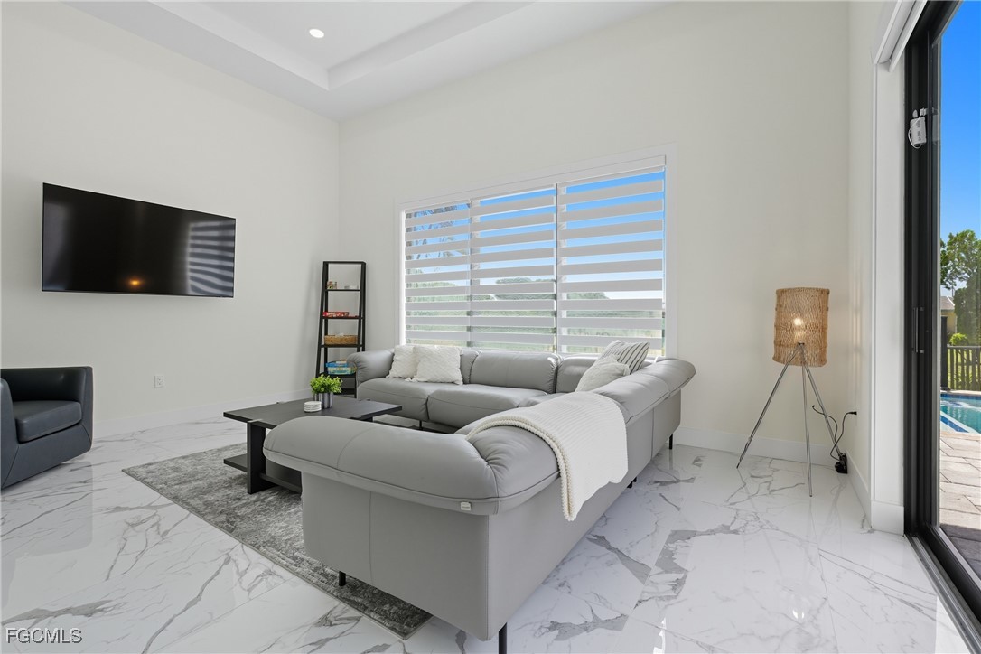 The backyard is pure entertainment: oversized pool and spa, outdoor kitchen, living and dining areas, all overlooking the water. Think poolside dinners, game days, and sunsets that steal the show.