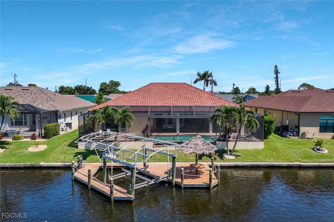 Step outside to your private tropical retreat featuring a heated infinity saltwater pool with spa, 10,000 lb boat lift with canopy, and a custom tiki hut—ideal for waterfront relaxation and entertaining. The tile roof adds lasting beauty and durability, and the western rear exposure lets you enjoy spectacular Florida sunsets from your own backyard oasis.