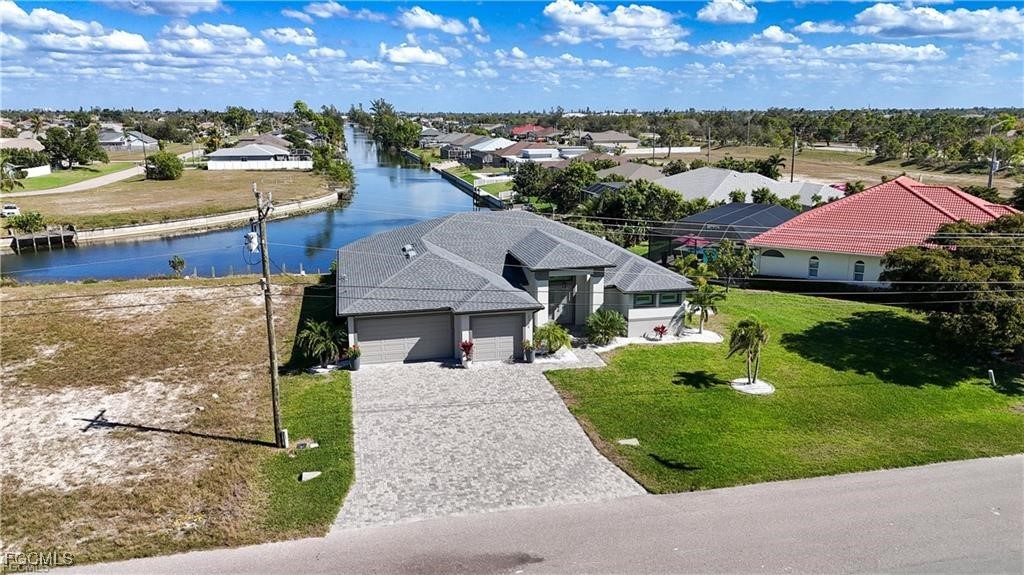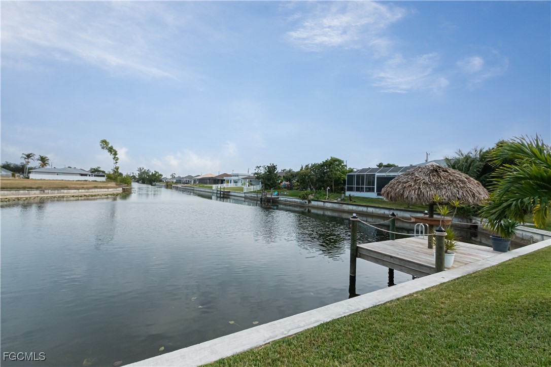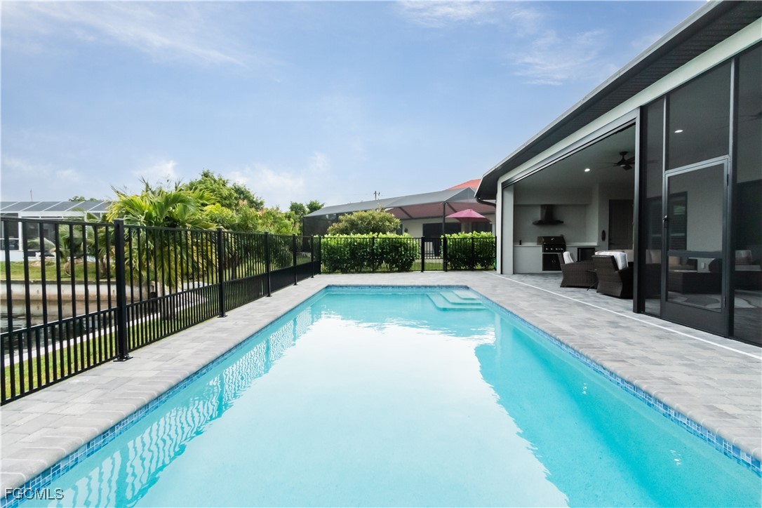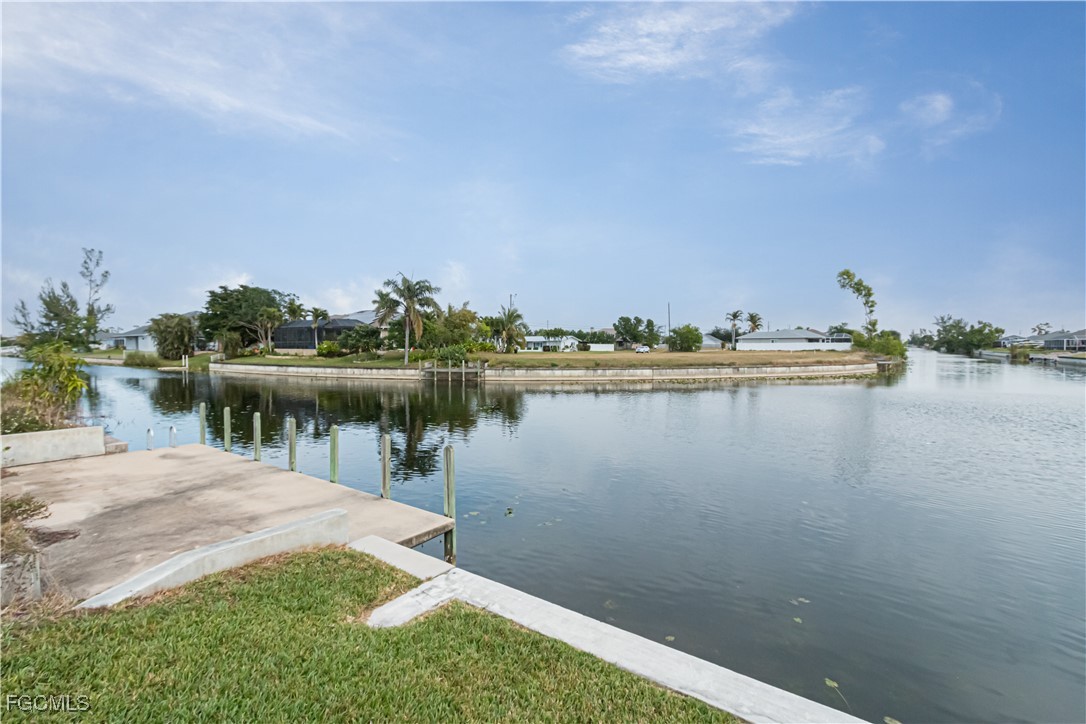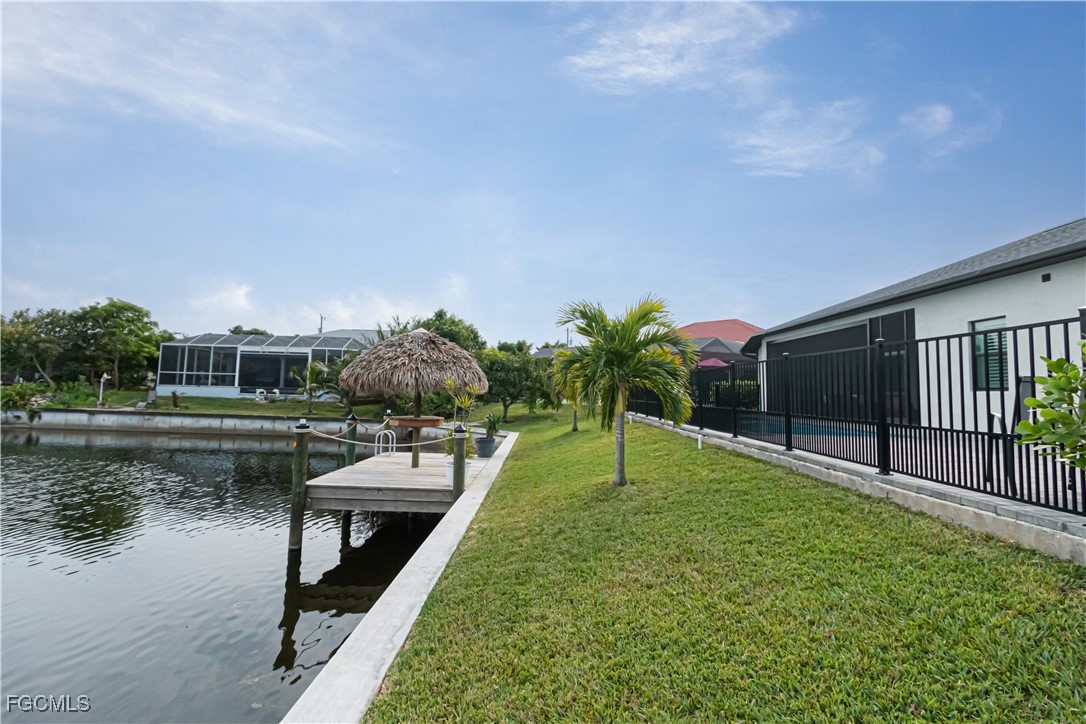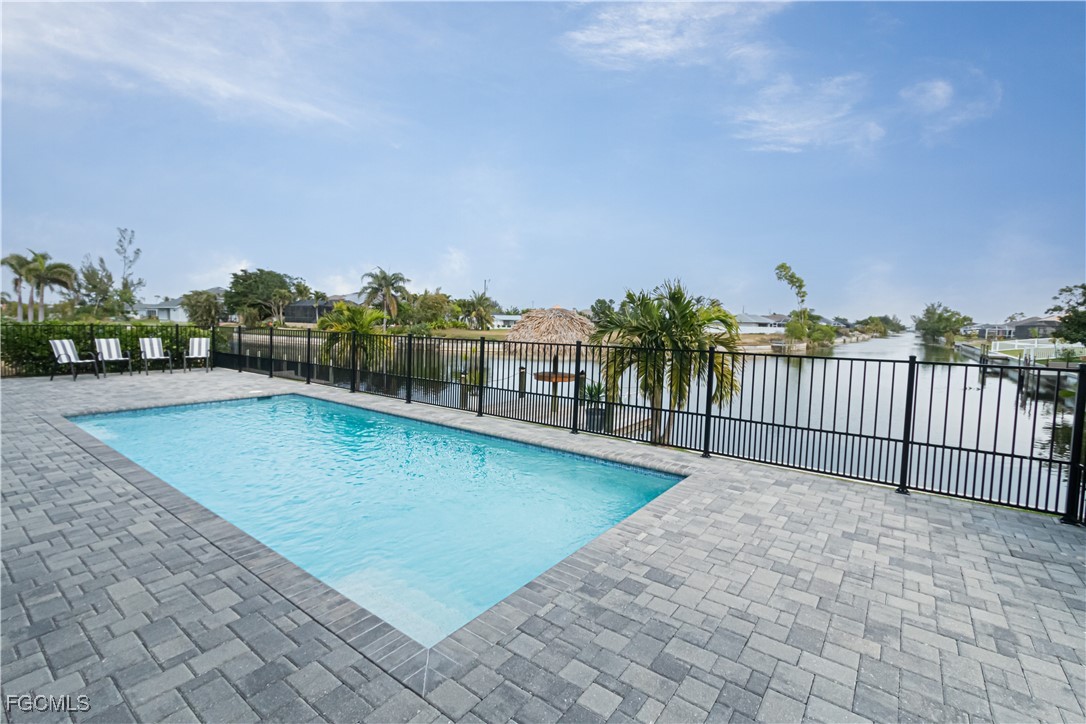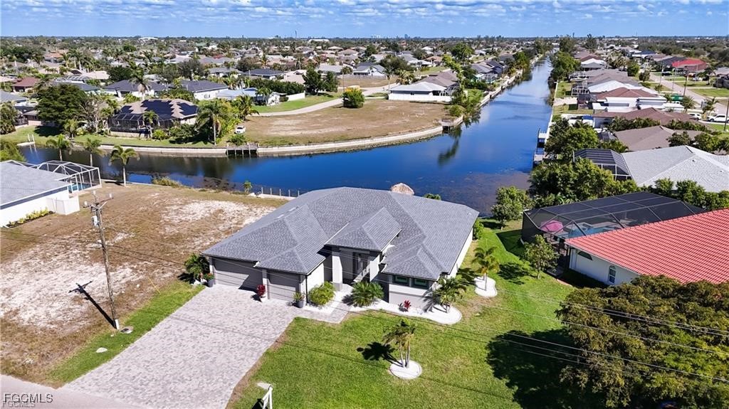 This exceptional Waterfront FURNSIHED optional home in Cape Coral, offering almost 2,300 square feet of beautifully designed living space with a comprehensive CAMERA security system for peace of mind. Featuring 3 bedrooms plus a den, 2 full bathrooms, with city water and sewer this home is ideal for those seeking both comfort and location. Just off Veterans and Chiquita, with eastern exposure, you'll enjoy sunrises over the canal right from your backyard. As you enter through the double doors, you're immediately captivated by soaring 13-foot ceilings in the living room, flooding the space with natural light and creating an inviting atmosphere perfect for relaxation and entertaining. Impact windows and six-door sliders frame stunning, unobstructed views of the canal, effortlessly blending indoor and outdoor living. The chef’s kitchen is a standout, featuring sleek quartz countertops, soft-close drawers and cabinets for both style and functionality. Your waterfront view is integrated with a dock, featuring a palm frond umbrella for shade. Outdoors, the fully equipped kitchen makes outdoor dining a breeze, while the automatic screen system quickly opens the lanai to the outdoors, allowing you to enjoy the serene surroundings in seconds. The master suite is a private retreat, complete with a carwash-style shower, a soaking tub for ultimate relaxation, and private sliders leading directly to the back lanai for easy access to the pool and waterfront views. Additional highlights include a resort-style pool with a convenient pool bath, a captain’s walk dock with a tiki hut, and a three-car garage with epoxy flooring for all your vehicles and storage needs. With pavers surrounding the home and no flood insurance required, this property offers peace of mind and significant savings. Move-in ready, this home is the ultimate Florida retreat, blending modern luxury with a prime waterfront location.