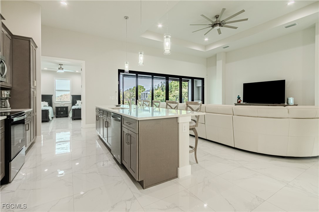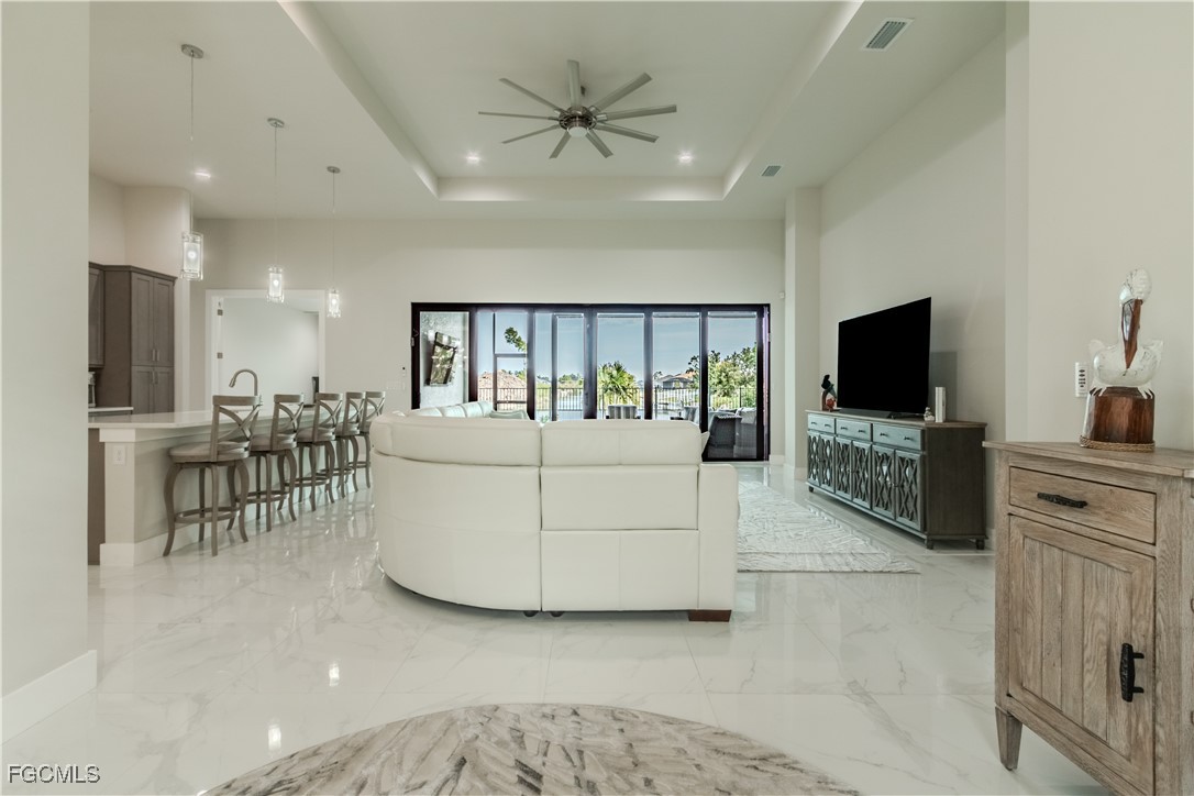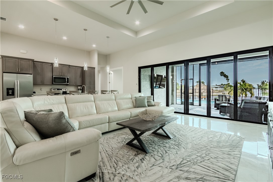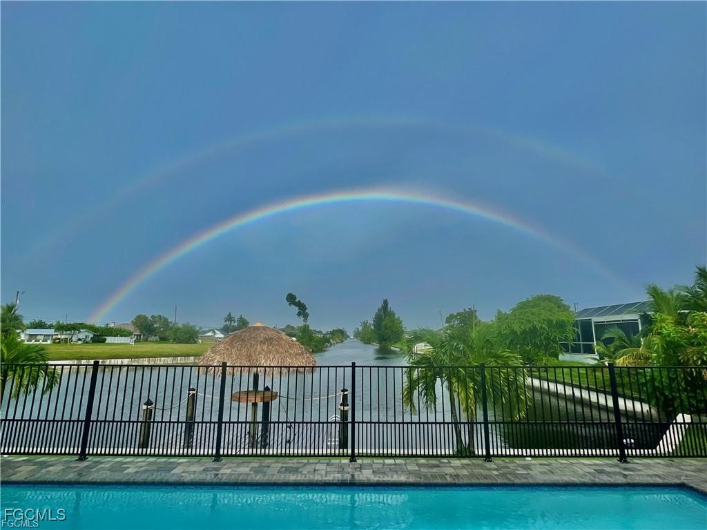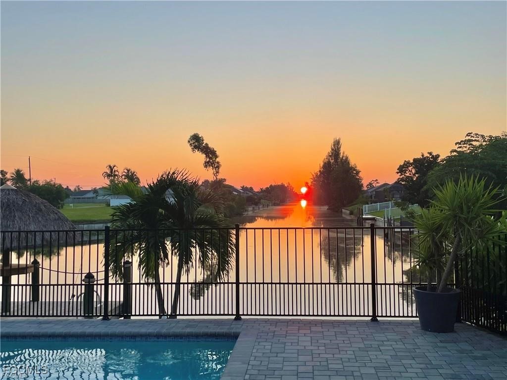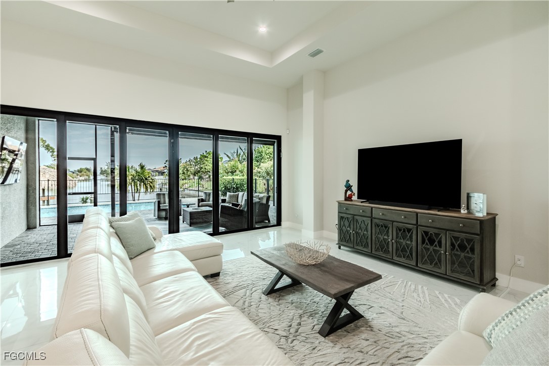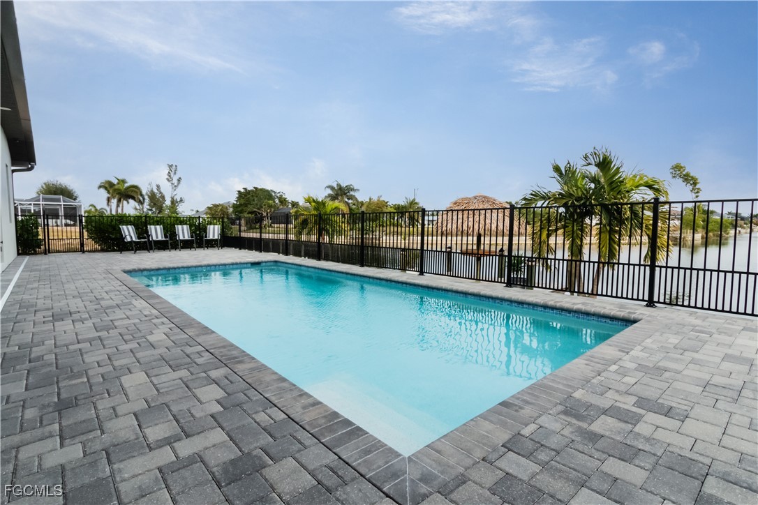 This exceptional Waterfront FURNSIHED optional home in Cape Coral, offering almost 2,300 square feet of beautifully designed living space with a comprehensive CAMERA security system for peace of mind. Featuring 3 bedrooms plus a den, 2 full bathrooms, with city water and sewer this home is ideal for those seeking both comfort and location. Just off Veterans and Chiquita, with eastern exposure, you'll enjoy sunrises over the canal right from your backyard. As you enter through the double doors, you're immediately captivated by soaring 13-foot ceilings in the living room, flooding the space with natural light and creating an inviting atmosphere perfect for relaxation and entertaining. Impact windows and six-door sliders frame stunning, unobstructed views of the canal, effortlessly blending indoor and outdoor living. The chef’s kitchen is a standout, featuring sleek quartz countertops, soft-close drawers and cabinets for both style and functionality. Your waterfront view is integrated with a dock, featuring a palm frond umbrella for shade. Outdoors, the fully equipped kitchen makes outdoor dining a breeze, while the automatic screen system quickly opens the lanai to the outdoors, allowing you to enjoy the serene surroundings in seconds. The master suite is a private retreat, complete with a carwash-style shower, a soaking tub for ultimate relaxation, and private sliders leading directly to the back lanai for easy access to the pool and waterfront views. Additional highlights include a resort-style pool with a convenient pool bath, a captain’s walk dock with a tiki hut, and a three-car garage with epoxy flooring for all your vehicles and storage needs. With pavers surrounding the home and no flood insurance required, this property offers peace of mind and significant savings. Move-in ready, this home is the ultimate Florida retreat, blending modern luxury with a prime waterfront location.