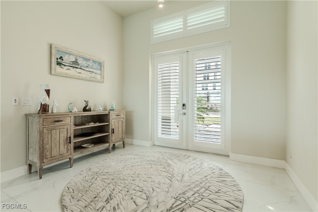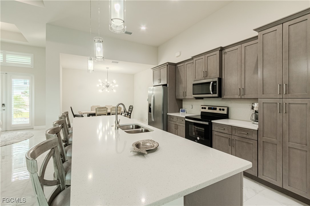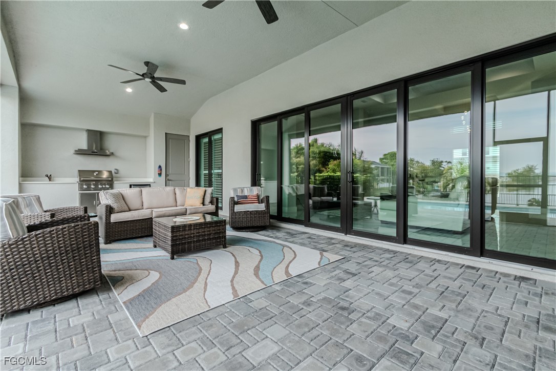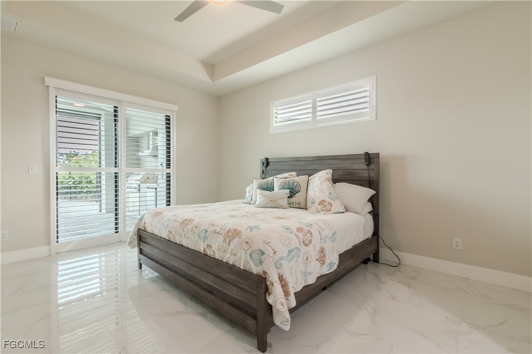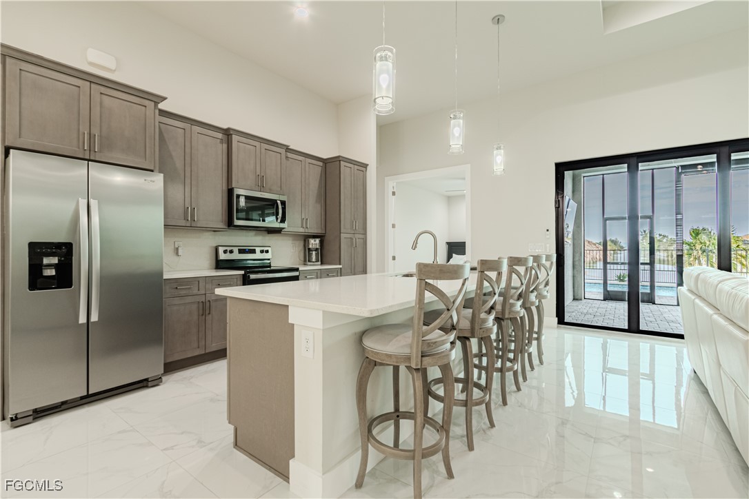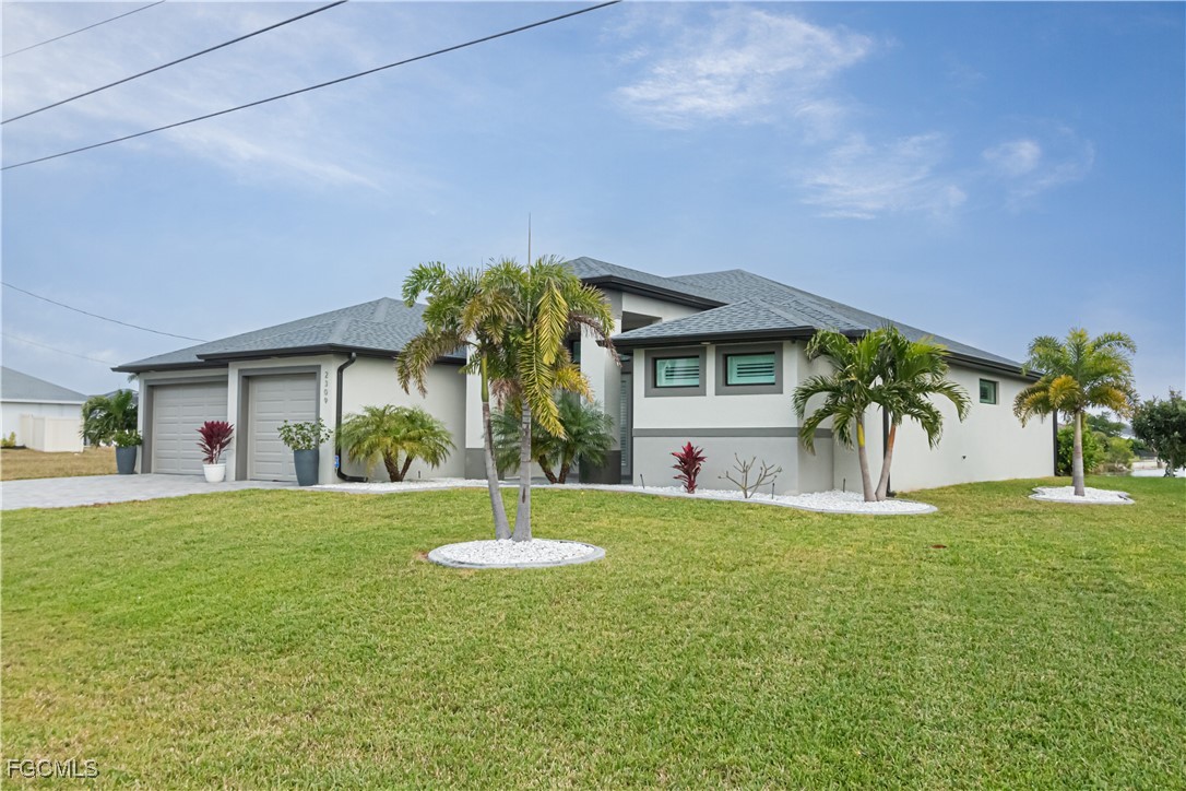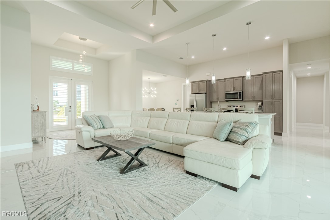 This exceptional Waterfront FURNSIHED optional home in Cape Coral, offering almost 2,300 square feet of beautifully designed living space with a comprehensive CAMERA security system for peace of mind. Featuring 3 bedrooms plus a den, 2 full bathrooms, with city water and sewer this home is ideal for those seeking both comfort and location. Just off Veterans and Chiquita, with eastern exposure, you'll enjoy sunrises over the canal right from your backyard. As you enter through the double doors, you're immediately captivated by soaring 13-foot ceilings in the living room, flooding the space with natural light and creating an inviting atmosphere perfect for relaxation and entertaining. Impact windows and six-door sliders frame stunning, unobstructed views of the canal, effortlessly blending indoor and outdoor living. The chef’s kitchen is a standout, featuring sleek quartz countertops, soft-close drawers and cabinets for both style and functionality. Your waterfront view is integrated with a dock, featuring a palm frond umbrella for shade. Outdoors, the fully equipped kitchen makes outdoor dining a breeze, while the automatic screen system quickly opens the lanai to the outdoors, allowing you to enjoy the serene surroundings in seconds. The master suite is a private retreat, complete with a carwash-style shower, a soaking tub for ultimate relaxation, and private sliders leading directly to the back lanai for easy access to the pool and waterfront views. Additional highlights include a resort-style pool with a convenient pool bath, a captain’s walk dock with a tiki hut, and a three-car garage with epoxy flooring for all your vehicles and storage needs. With pavers surrounding the home and no flood insurance required, this property offers peace of mind and significant savings. Move-in ready, this home is the ultimate Florida retreat, blending modern luxury with a prime waterfront location.