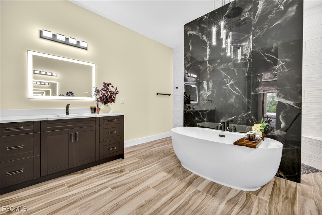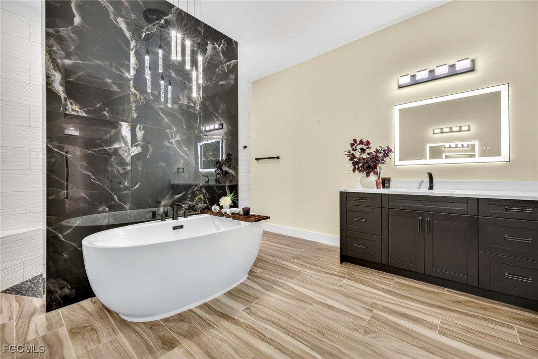 Inside, the open concept layout boasts sleek tile flooring throughout, a stunning kitchen with quartz countertops, custom cabinetry, and high-end stainless appliances and a large walk-in pantry. Expansive living and dining spaces flow seamlessly to the outdoors, creating an effortless indoor-outdoor lifestyle. The primary bedroom is a sanctuary of its own featuring a spa inspired bathroom with dual vanities, soaking tub, and a creative walk-in shower. Large walk-in closets with high-end shelving and plenty of storage space. Step outside to your private resort style lanai with a custom heated/saltwater pool and spa (controlled through an Smart App), summer kitchen, built in grill, and TV console with an electric fireplace, creating the ultimate setting for entertaining or unwinding at the end of the day. Additional highlights include impact windows and doors, electric blinds, tile roof, energy efficient construction, fenced yard and city water and sewer with all assessments paid. Large circle driveway with a 3 – car garage and beautiful landscaping with palms galore.