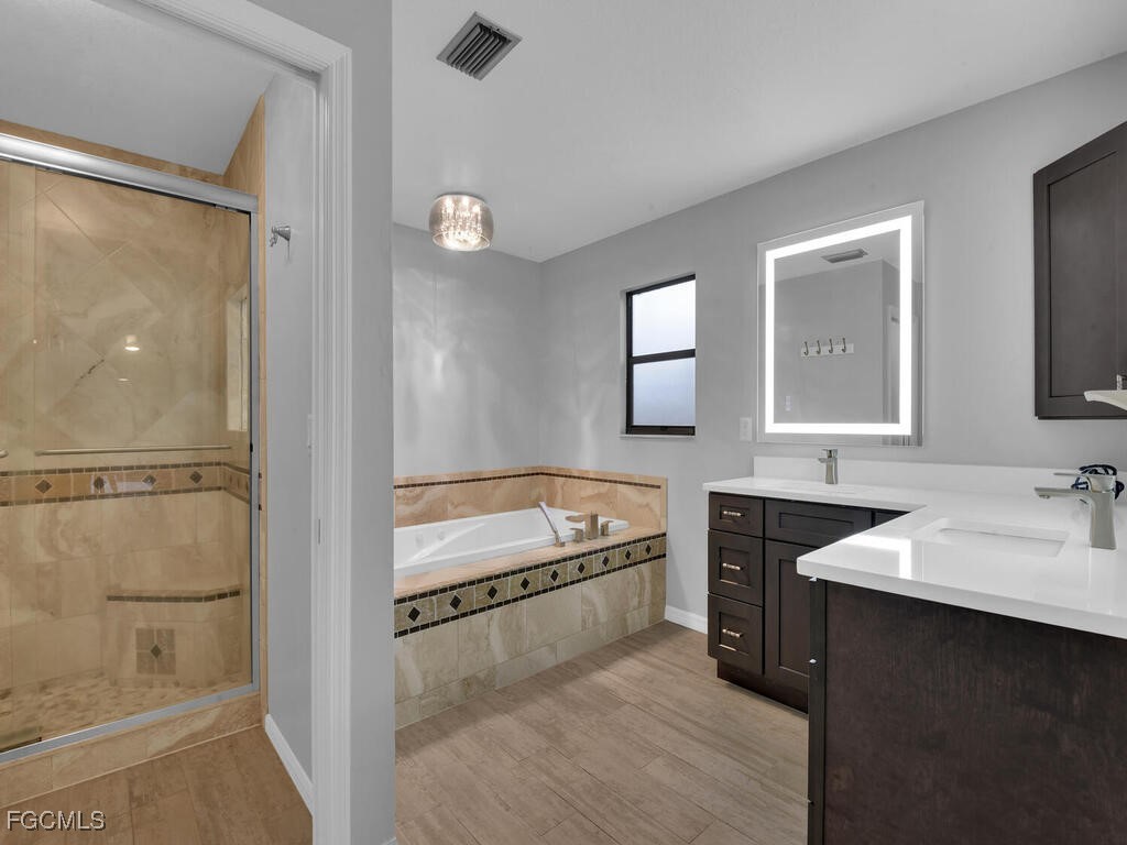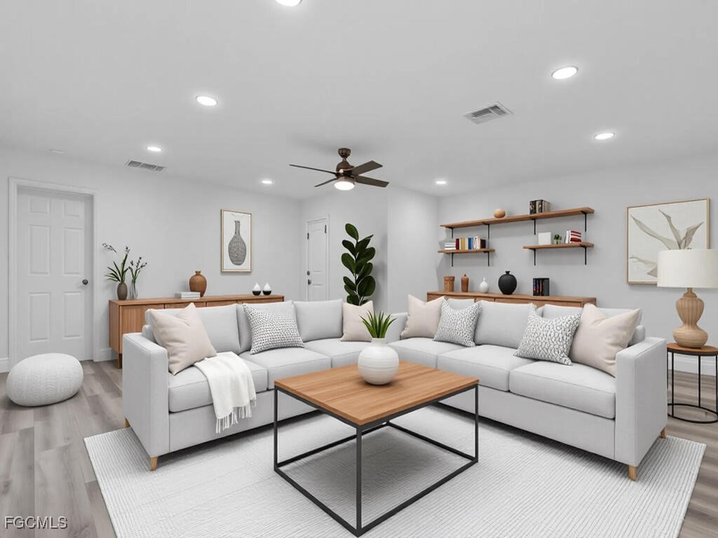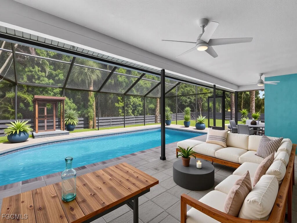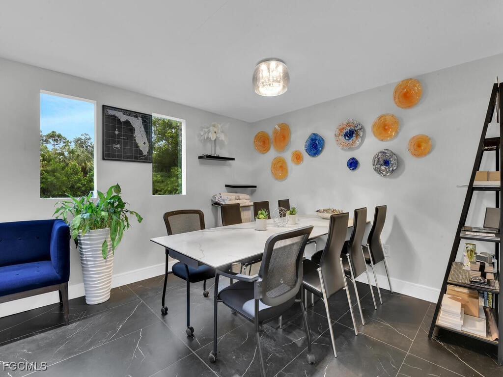 UNIQUE PROPERTY- perfect for business owner! Almost 1.5 acres w/ loop around driveway circling a single family pool home, detached warehouse/office space, and RV parking. New roof in 2022, 3 of the 4 a/c units are new, hot water heater has been replaced, resurfaced pool w/ custom lighting system, and a new well & new septic have been installed. The custom built pool home has luxury features throughout w/ elegant tile flooring, high-end light fixtures & fans, extremely large aquarium window overlooking pool lanai, euro-designed doors & cabinetry, custom closet systems, volume ceilings, open concept kitchen w/ quartz countertops, top-of-the-line KitchenAid appliances, 3 zone AC, huge flex room w/ full bath, attached garage, screened heated saltwater pool, astroturf covered sunning pad, fenced-in backyard, and a 3 car garage (one of them is used as a "man-cave". The detached warehouse/office space offers over 2,600 sq ft w/ 3 RV sized roll-up doors leading to 2 warehouse areas that book-end a 2-story office space. There is a separate septic for the detached building. Situated in a highly desired location that has easy & quick access to the River District of Fort Myers, I-75, and US 41. This area is known for mixed-use properties making it ideal for someone who runs a mid-size business that needs parking, office space, and warehouse/workshop. There is plenty of parking for approximately 20 vehicles and the property has significant camera coverage that includes audio.