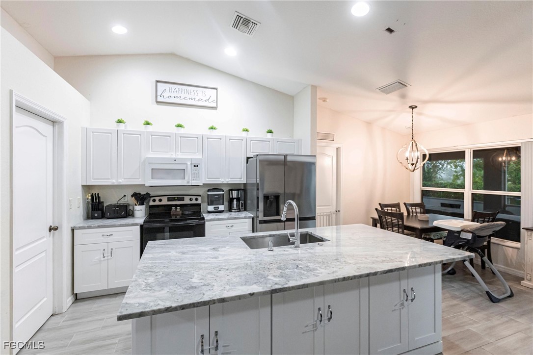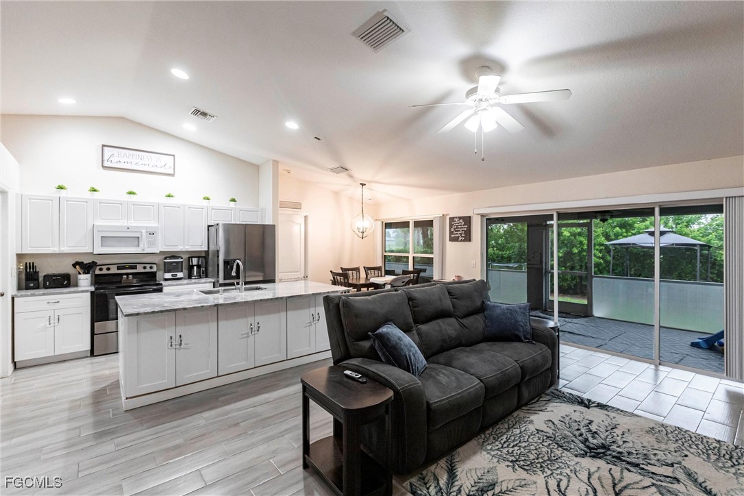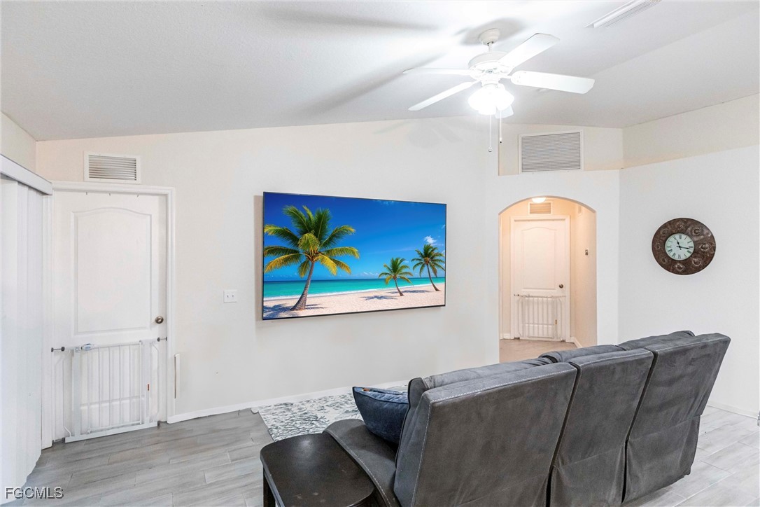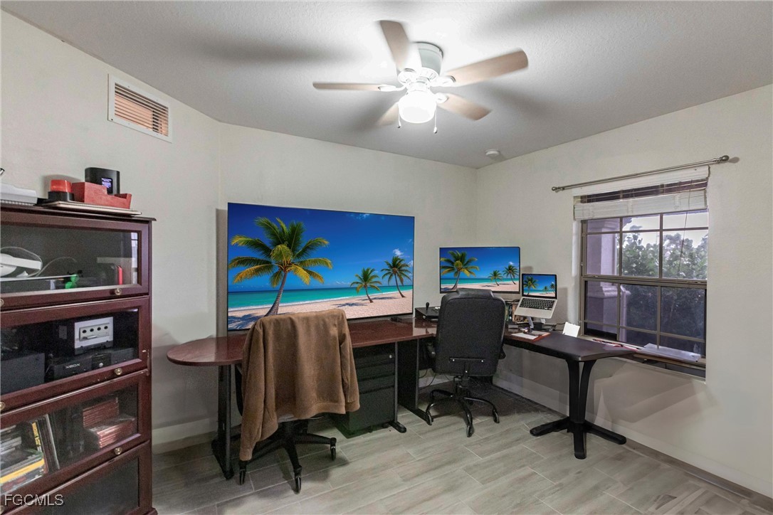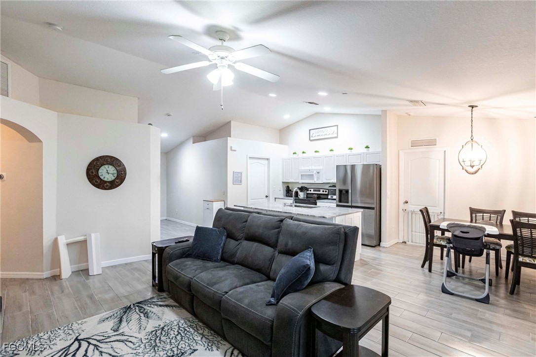 GREAT DEAL IN NW CAPE CORAL!! Charming 3 bedroom 2 bath plus Den NW Cape Coral home off Burnt Store Road close to Pine Island road shopping, and also convenient to Punta Gorda and Burnt Store Marina. Home features a large front screened porch and spacious rear screened lanai for enjoying the outdoors. Fenced home desirable for your children or pets. Relax and enjoy a fire pit in the rear yard. Home experienced no flooding with any of the hurricanes! Small canal runs behind home. Many updates in home including 2023 roof and a/c, tile plank floor throughout home, Interior painted in 2022, exterior painted in 2023, new lower kitchen cabinets and countertops in 2023. Master bath updated in 2023 with new cabinet, sink, faucet and updated custom tile master shower. Den has glass panel french doors. Dedicated 50 amp breaker in electric panel for car charger. Home has irrigation system. Great first new home for younger couple or downsize home for retirees.