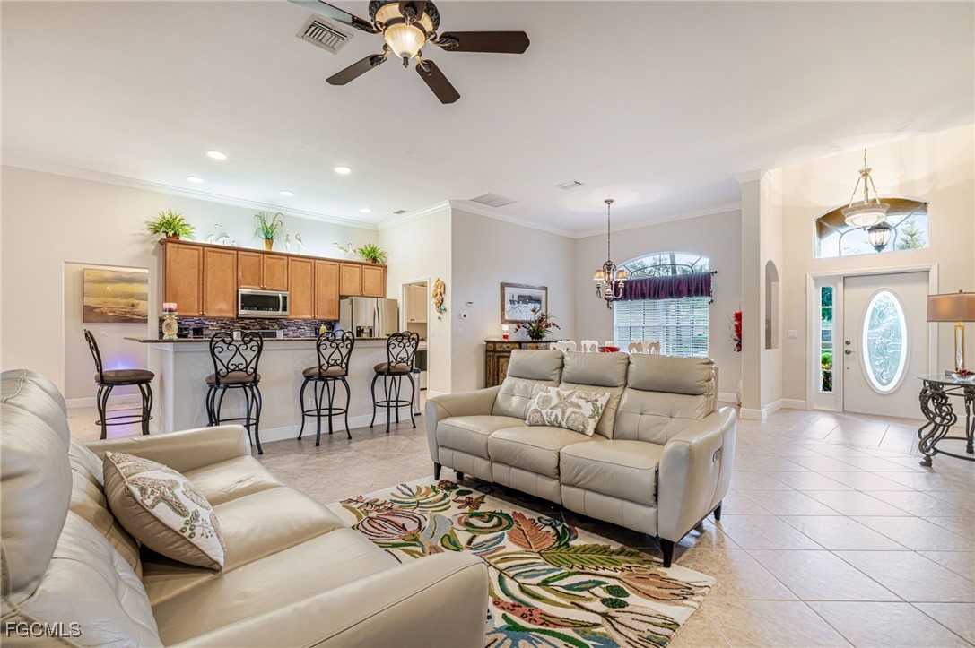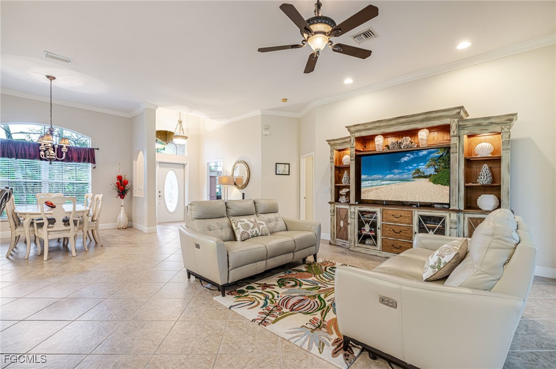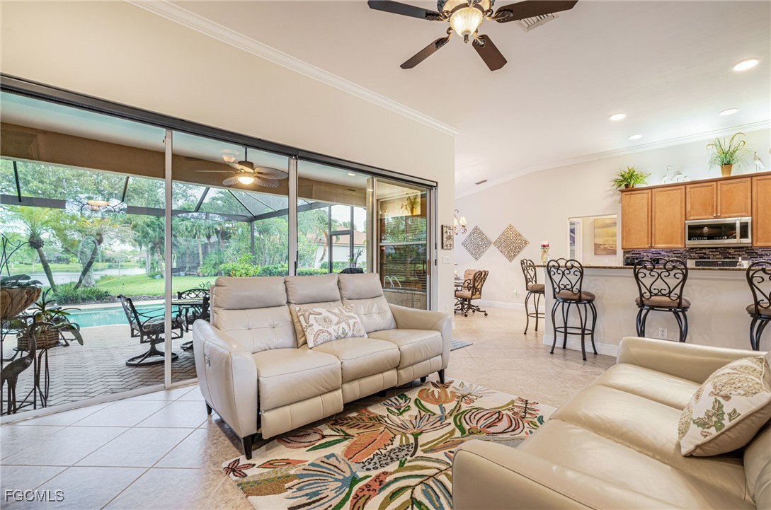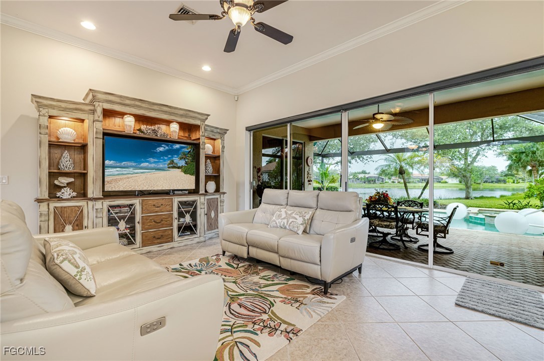 The open floor plan offers a spacious and light-filled living area, ideal for both entertaining and everyday living. Step outside to a private screened-in pool area featuring long, uninterrupted views of the lake through a seamless picture screen—truly a backyard retreat.
