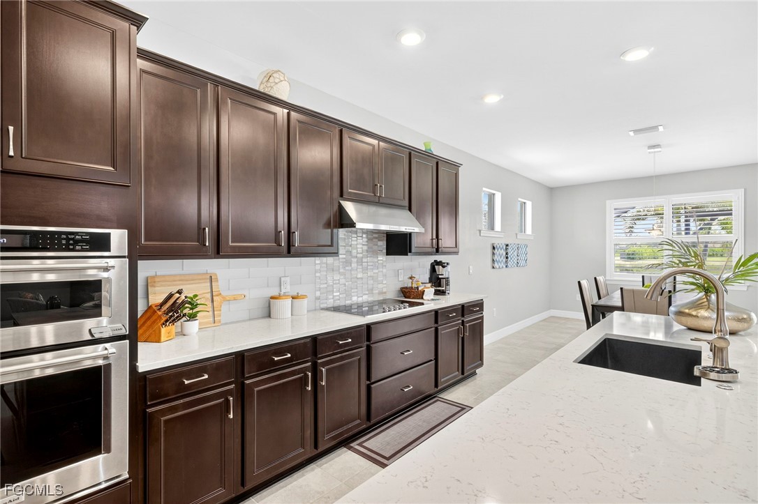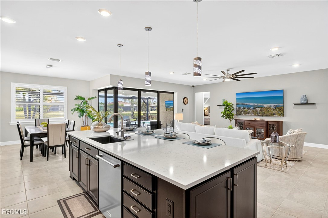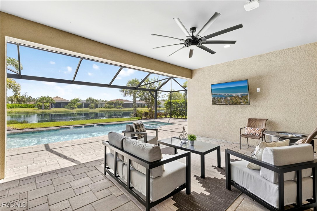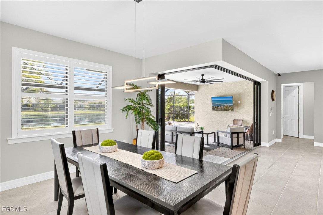 Welcome to this beautiful Pinnacle model home in the highly sought-after Bridgetown community! With over 2,400 sq ft of living space, this 4-bedroom, 3-bathroom residence (including two en-suite bedrooms) offers the perfect blend of luxury, comfort, and functionality. From the moment you arrive, you'll notice the extended driveway and spacious 3-car garage, providing ample parking and storage. Step inside to find a bright and airy open floor plan featuring tile flooring throughout, soaring ceilings, 8-foot doors, designer barn doors, fresh interior paint, custom lighting, plantation shutters, and tons of storage space. The heart of the home is a chef’s dream kitchen—complete with an oversized island, raised-panel cabinetry, quartz countertops, wall oven, and a generous walk-in pantry. Perfect for entertaining, the kitchen flows seamlessly into the living area, where zero-corner sliders open to your extended screened lanai and heated pool, all overlooking a peaceful lake view.