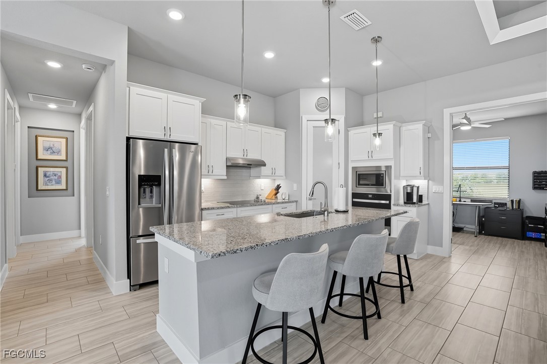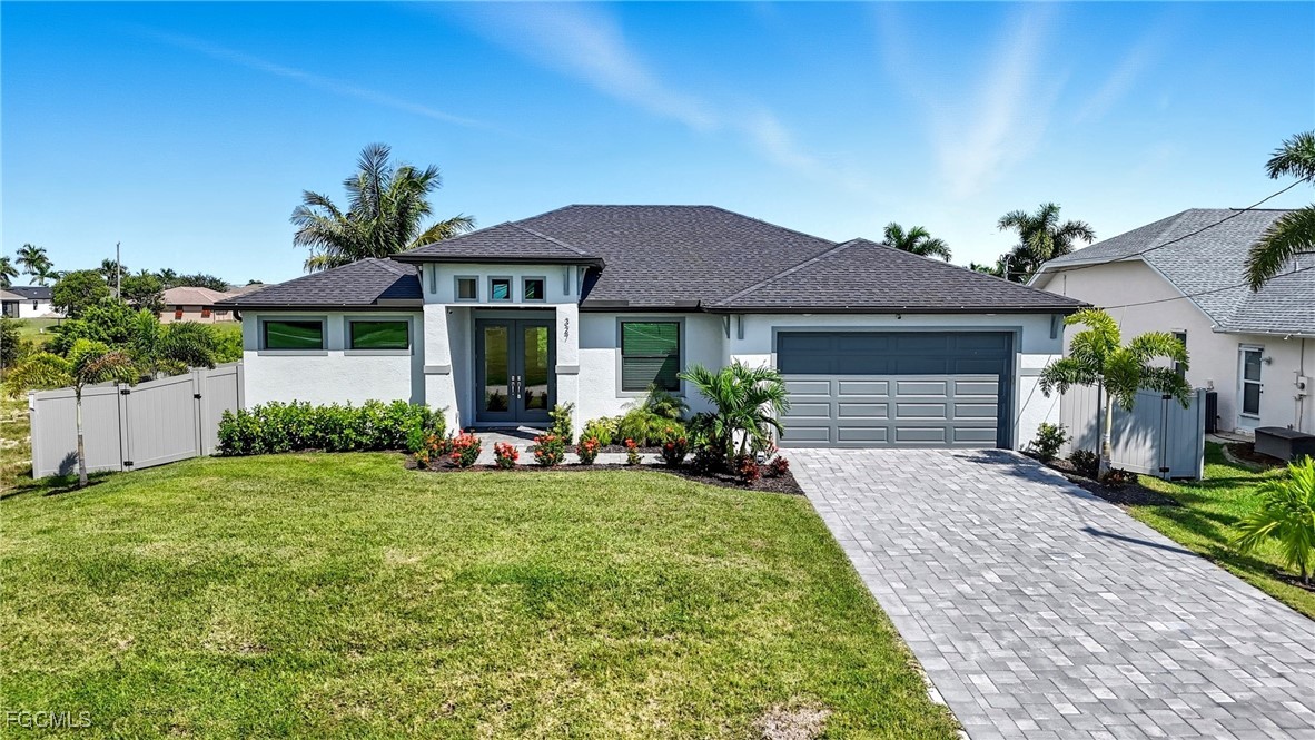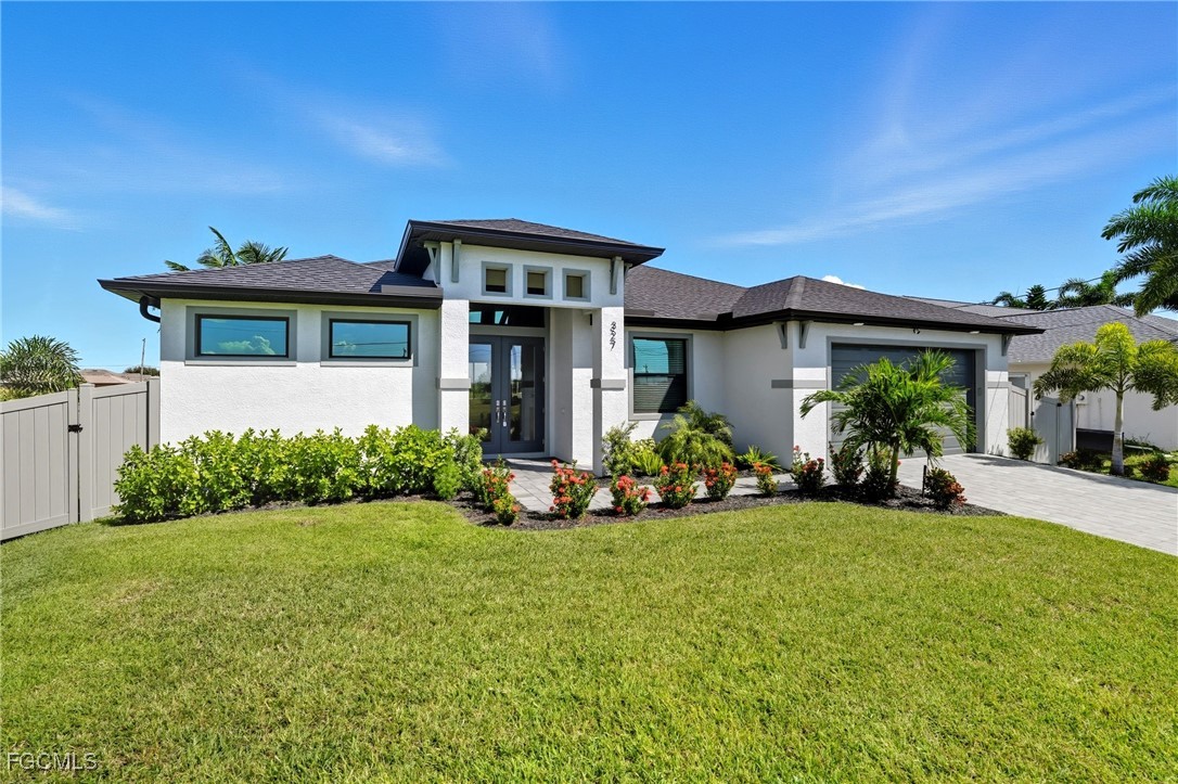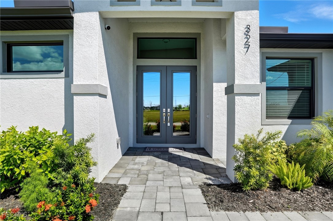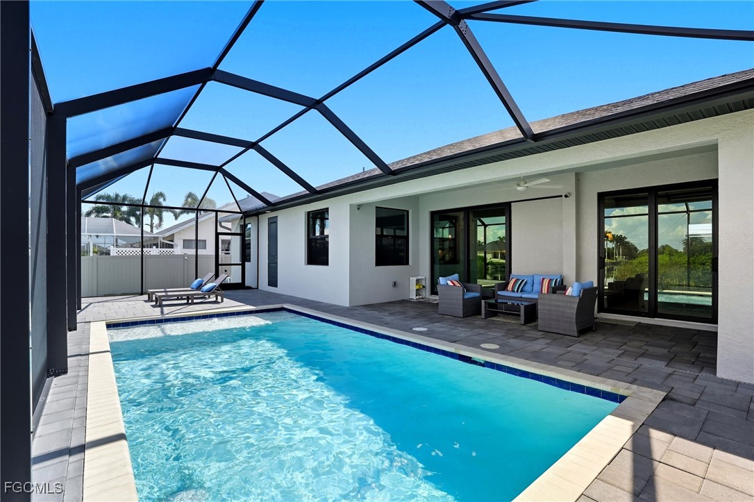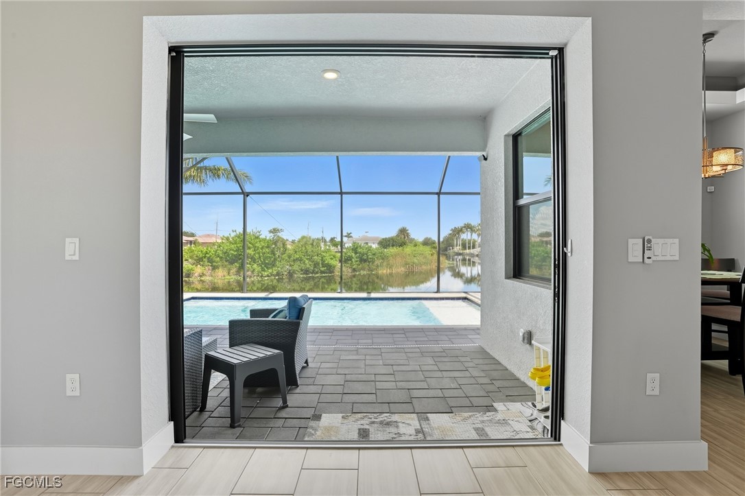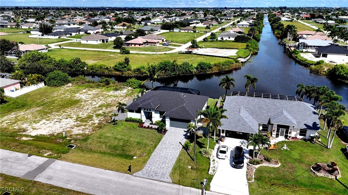 Skip the wait, stress, and hidden costs of building new—this exquisite pool home, completed just 10 months ago, is move-in ready and already includes features most new construction lacks: a privacy fence, whole-house reverse osmosis system, custom closet shelving, and a state-of-the-art security system. Set high and dry (not in a flood zone) on the shores of an intersecting freshwater canal, the property offers sweeping water views, a front-row seat to Florida’s abundant wildlife, and outstanding fishing right from your own backyard. Lush tropical landscaping, impeccable curb appeal, and a pavered driveway welcome you to this peaceful and serene retreat. Inside, modern tile floors flow seamlessly throughout the split, open-concept plan. The foyer opens to a light-filled den/office through elegant double doors, ideal for working from home or a flexible guest space. The luxurious master suite is a true retreat with lighted tray ceilings, dual walk-in closets, and a spa-style bath featuring a soaking tub, oversized walk-in shower, and separate vanities. Two additional bedrooms and a guest bath—with convenient direct pool access—are privately tucked away on the opposite side of the home. A large laundry room includes an additional full-size refrigerator, perfect for overflow or entertaining needs, leads you to the attached 2 car garage. At the heart of the home, the island kitchen blends style and function for effortless entertaining. A walk-in pantry with trendy frosted glass door keeps everything organized. White cabinetry with crown accents is paired with a chic, modern glass backsplash and gleaming granite counters. The expansive island is perfect for buffet-style meals or extra seating, and because it opens to the living and dining areas, the chef never misses a moment of the action. Nearly every room enjoys sweeping views of the pool and canal beyond. Step outside to your private oasis: a screened-in, in-ground swimming pool with a sun shelf, covered lanai, and spacious sunning area, all surrounded by a privacy fence and tropical landscaping. With 80 feet of waterfront, you can fish, launch your kayak, or simply relax and take in the view. For even more possibilities, the triple lot next door—with 120 additional feet of waterfront—is also available for purchase, offering space for a detached garage, guest home, private pickleball court, or simply extra privacy. This is modern Florida living at its finest—luxury, comfort, and endless opportunities all wrapped into one remarkable property.