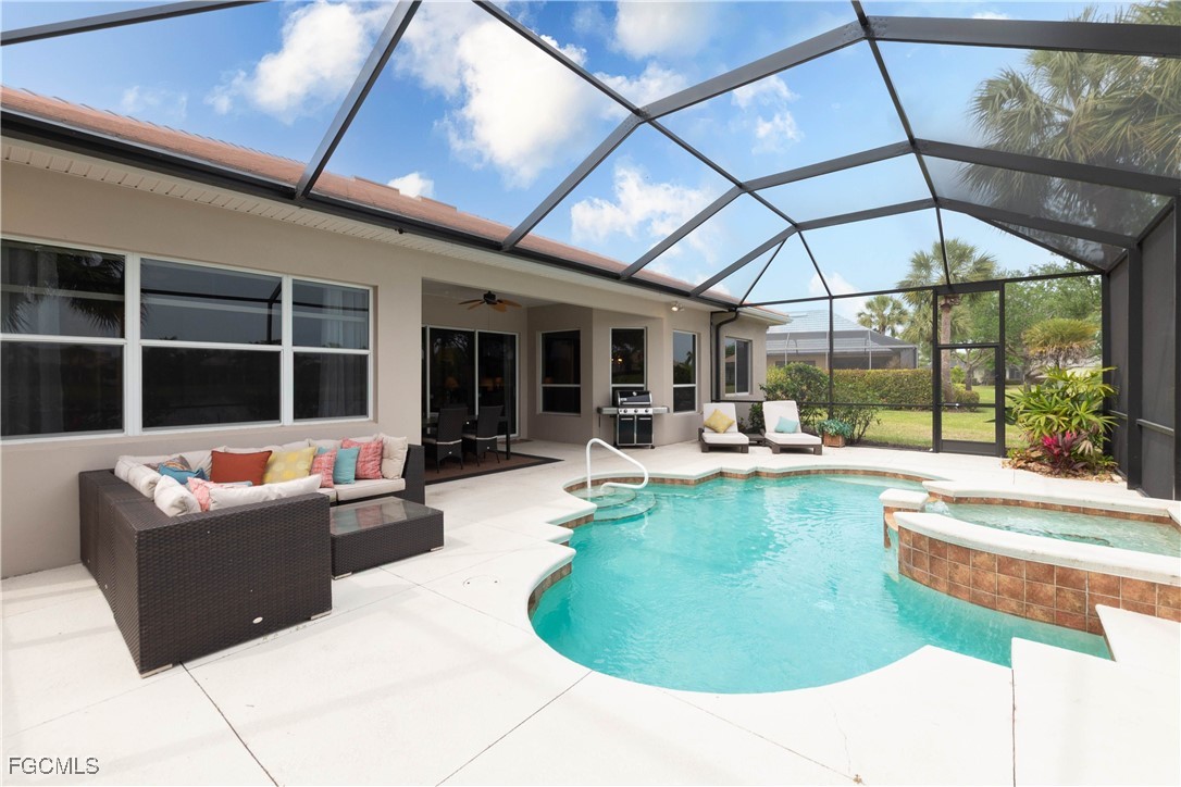 This Arthur Rutenberg home is being offered TURNKEY and is MOVE IN READY. It features an open floor concept, 3 spacious bedrooms, 2 full bathrooms, a den/study and an abundance of natural light. The ROOF, pool cage and gutters were all replaced and are like new. The kitchen has natural gas appliances, solid surface counters, wood cabinets, and a breakfast bar. The A/C was replaced in 2017 and there's a new epoxy floor was recently installed in the garage. This home shows very well and the furniture is higher end furniture and has been extremely well maintained. Verandah offers an exceptional lifestyle with two stunning 18-hole championship golf courses, tennis, a state-of-the-art fitness center, a community pool, pickleball, bocce ball, and kayaking on the picturesque Orange River. Nature lovers will appreciate the extensive miles of biking and walking trails, perfect for outdoor exercise. Pet owners will be delighted to find a dedicated doggy park complete with ample parking. Located conveniently close to Downtown Ft Myers, the Caloosahatchee River, and both Ft Myers and Punta Gorda Airports, Verandah is an ideal location for a vibrant lifestyle.