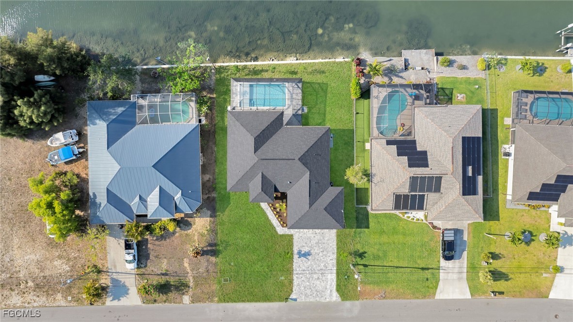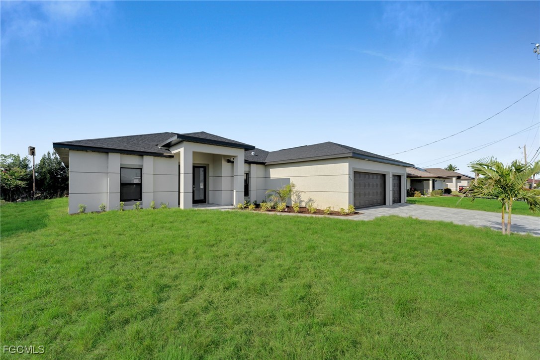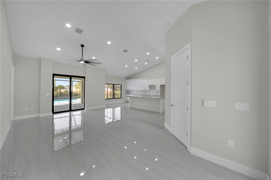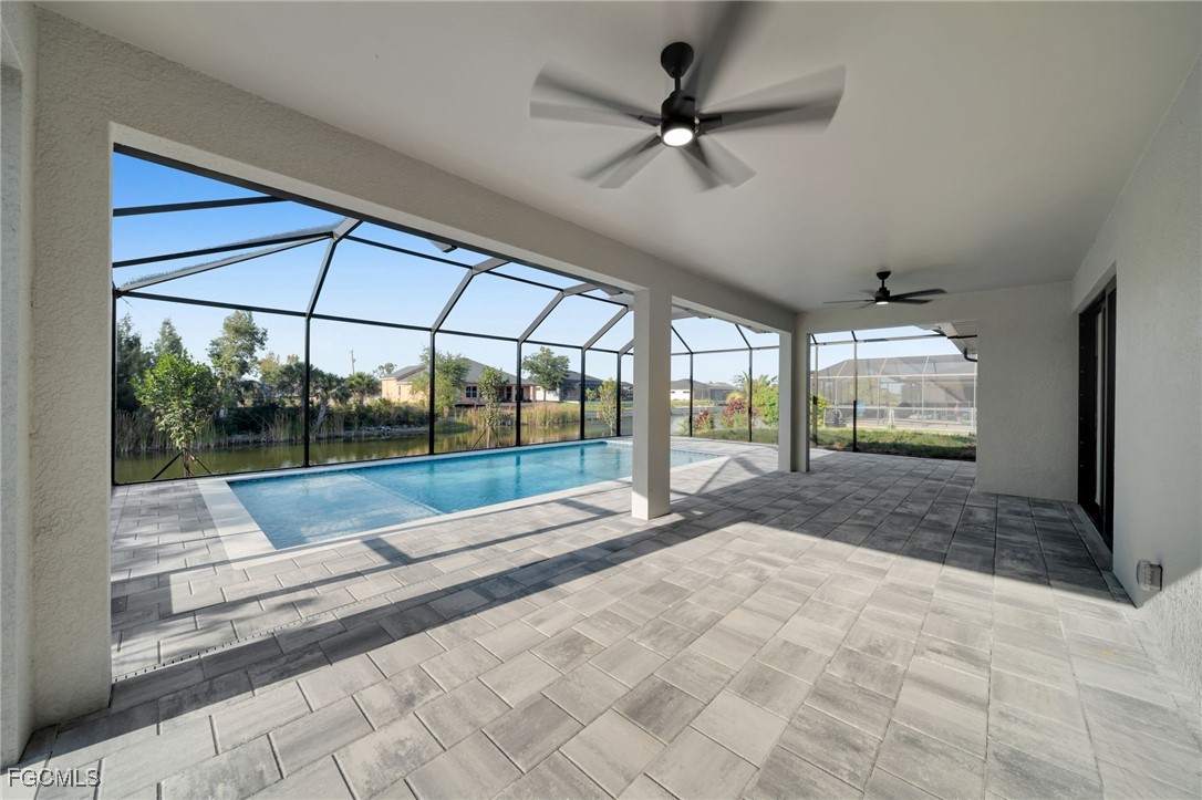 BEST PRICED NEW CONSTRUCTION WATERFRONT POOL HOME IN CAPE CORAL! CITY WATER! Experience luxury coastal living in this stunning 2025 new construction featuring 3 bedrooms + den, 2 bathrooms, and a 3-car garage. Enjoy 12’ ceilings, 8’ doors, and porcelain tile throughout. The modern kitchen boasts quartz countertops and sleek finishes.