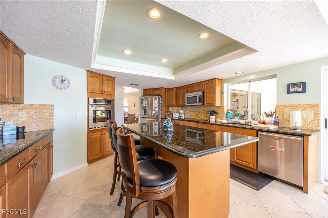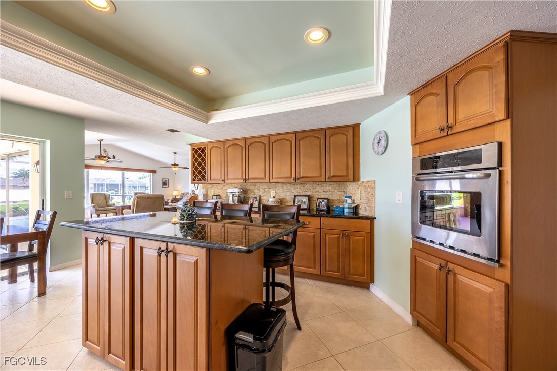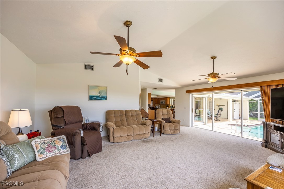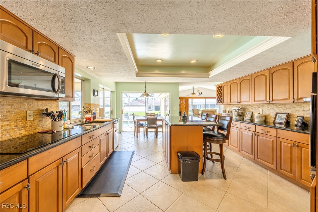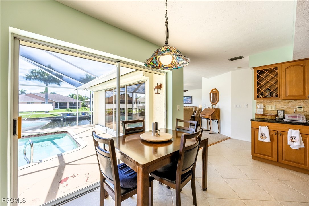 The completely updated kitchen showcases granite countertops, stainless steel appliances, and a center island with seating for four, plus a stone backsplash. The spacious dinette overlooks stunning water views, while pocket sliding glass doors in the living room, family room, and primary bedroom open seamlessly to the expansive screened lanai. The recently refinished pool area offers both covered and open areas for sun lovers, with a convenient pool bath perfect for entertaining.