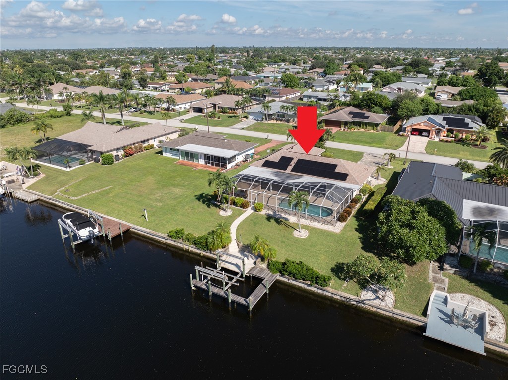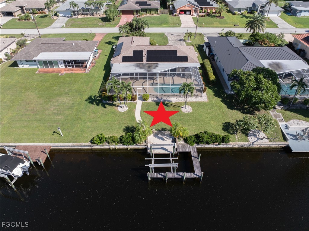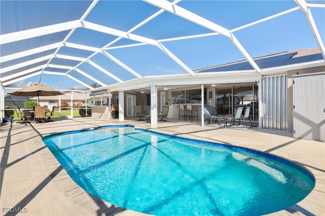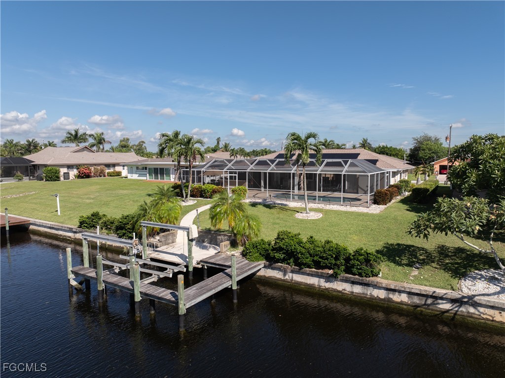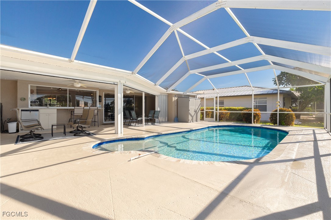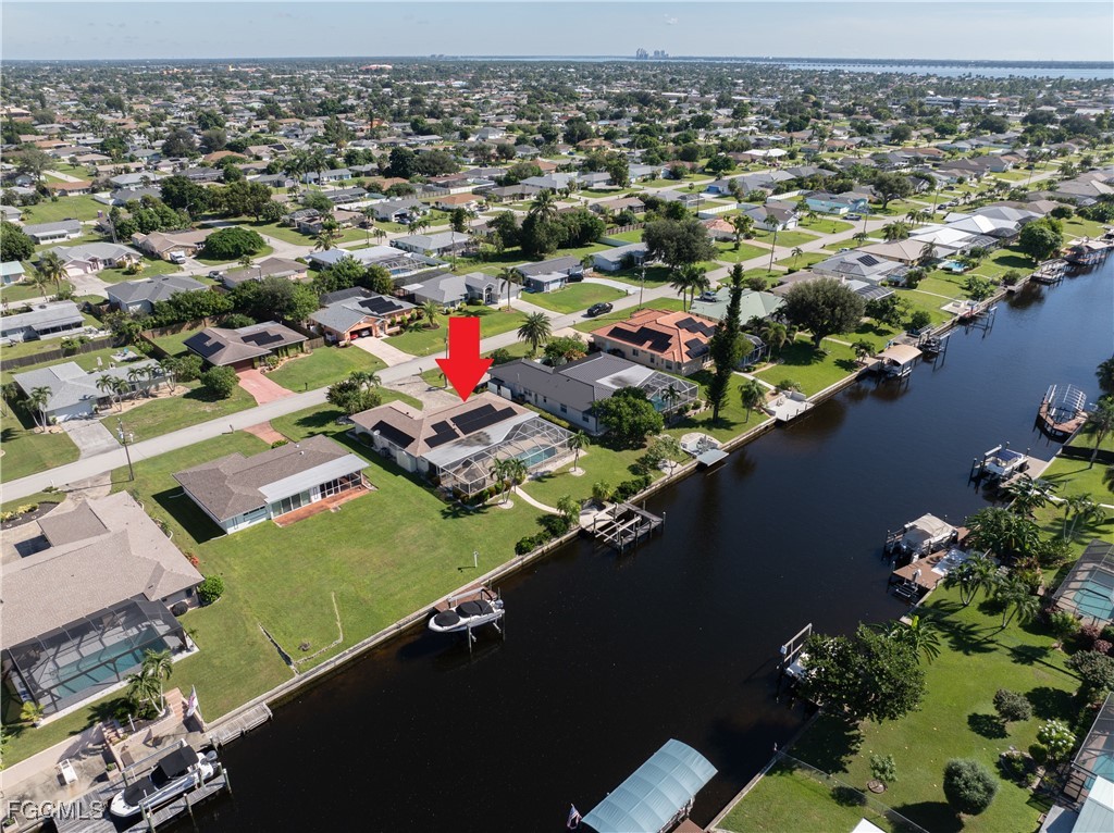 Your Gulf Access Retreat in SE Cape Coral! This home offers quick boating access to the River and Gulf with just one bridge. Peace of mind comes with being located in Flood Zone X, so flood insurance is not required. Inside, the inviting open floor plan is filled with natural light and showcases sought-after southern exposure overlooking a wide canal. The beautifully renovated kitchen is a true centerpiece with granite counters, an island accented by pendant lighting, stainless steel appliances including a 2023 induction range, and a large pass-through window to the lanai. The spacious master suite offers a huge walk-in closet and an updated bathroom with a tiled shower and modern vanity. Guest bedrooms are positioned on the opposite side of the home for privacy, sharing a stylishly updated bathroom. The outdoor living space is designed for authentic Florida enjoyment, featuring a generous screened lanai with both shaded areas and open spaces for sunning. An electric-heated pool with sun shelf invites relaxation, while the lanai’s fun bar area with retractable awning makes entertaining easy and enjoyable. Adding to the convenience is a dedicated pool bath, giving the home a total of three full bathrooms. Boaters will love the concrete dock with lift and wraparound dock, making days on the water effortless. Inside laundry adds everyday practicality, while thoughtful upgrades provide comfort and value throughout. Recent improvements include a new roof in 2023, solar panels in 2024, a new AC in 2021, and a new electric panel in 2021. The home is also wired for a generator and is equipped with electric and accordion shutters for peace of mind. Furniture is negotiable, and the prime SE Cape location places you near shopping, dining, downtown, and all the conveniences Cape Coral has to offer.