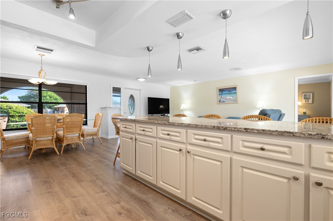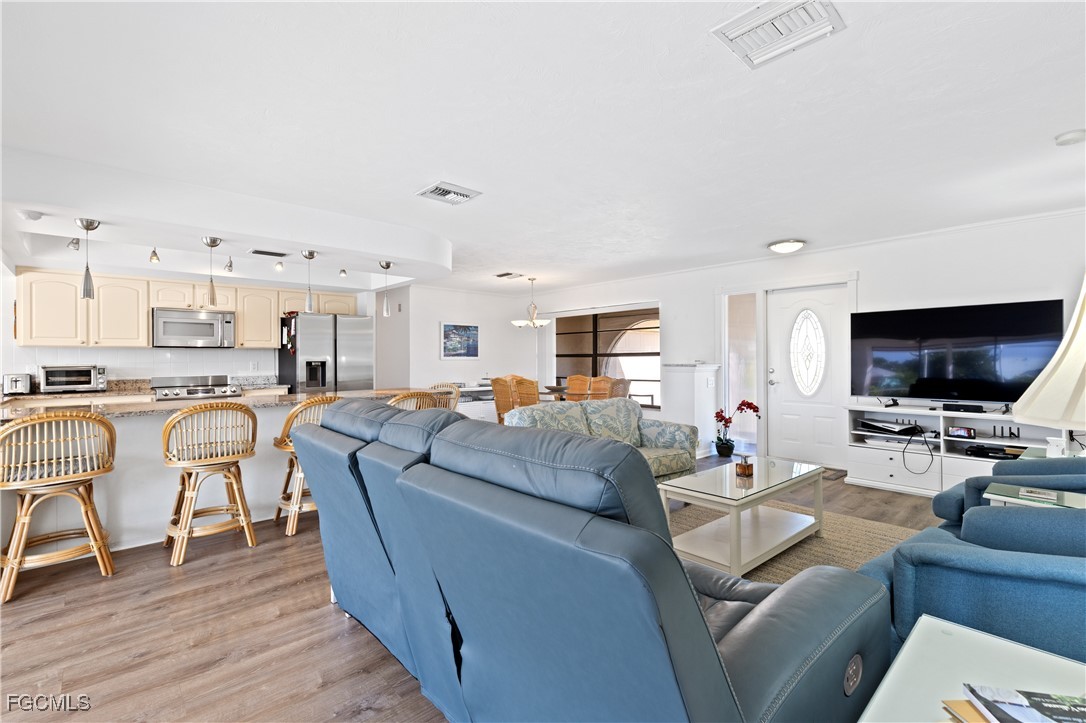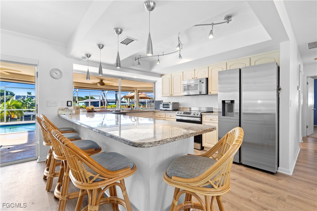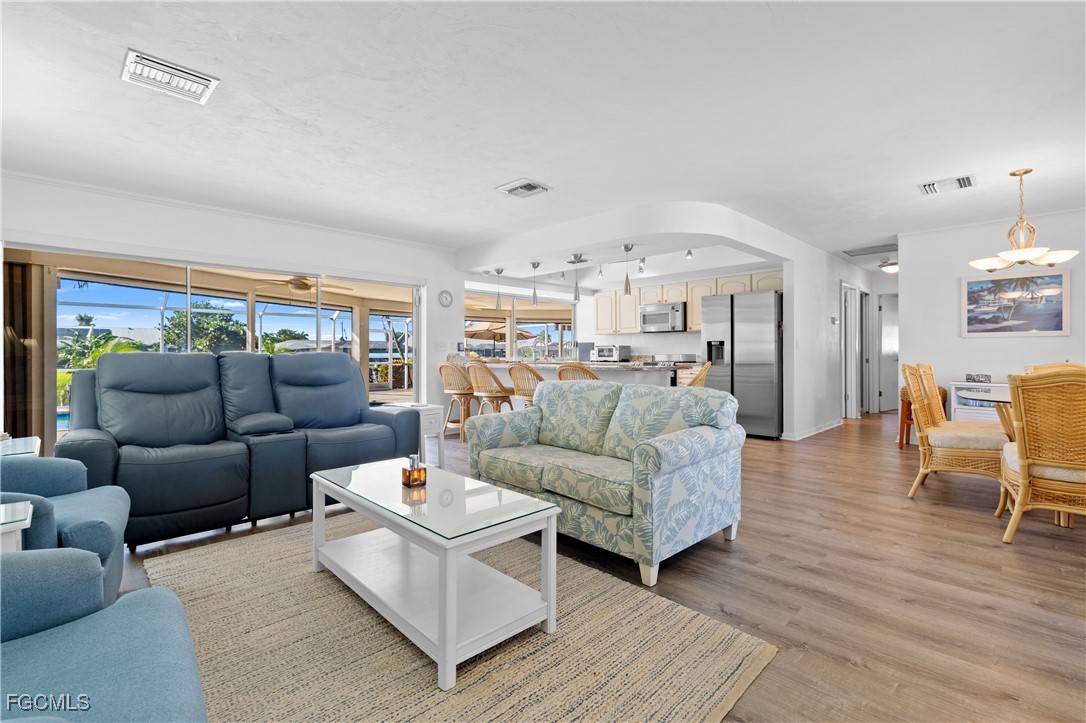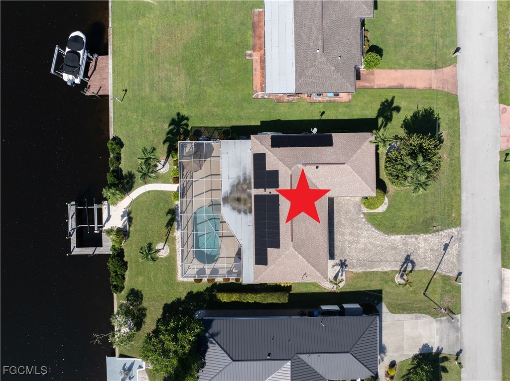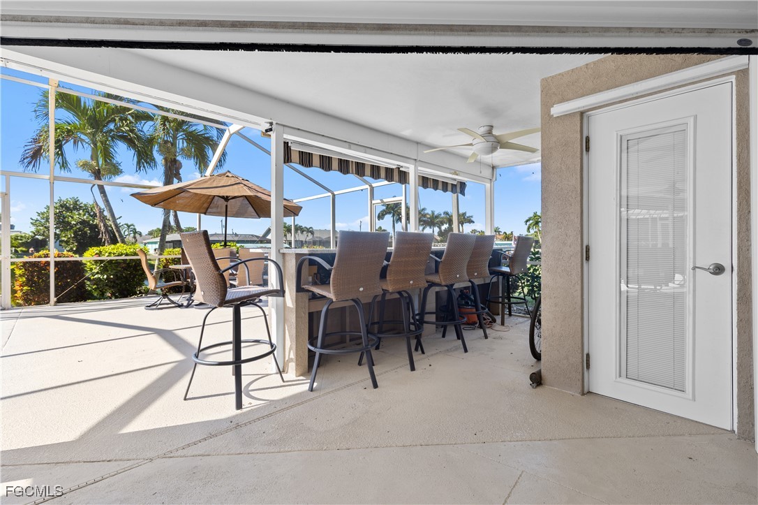Your Gulf Access Retreat in SE Cape Coral! This home offers quick boating access to the River and Gulf with just one bridge. Peace of mind comes with being located in Flood Zone X, so flood insurance is not required. Inside, the inviting open floor plan is filled with natural light and showcases sought-after southern exposure overlooking a wide canal. The beautifully renovated kitchen is a true centerpiece with granite counters, an island accented by pendant lighting, stainless steel appliances including a 2023 induction range, and a large pass-through window to the lanai. The spacious master suite offers a huge walk-in closet and an updated bathroom with a tiled shower and modern vanity. Guest bedrooms are positioned on the opposite side of the home for privacy, sharing a stylishly updated bathroom. The outdoor living space is designed for authentic Florida enjoyment, featuring a generous screened lanai with both shaded areas and open spaces for sunning. An electric-heated pool with sun shelf invites relaxation, while the lanai’s fun bar area with retractable awning makes entertaining easy and enjoyable. Adding to the convenience is a dedicated pool bath, giving the home a total of three full bathrooms. Boaters will love the concrete dock with lift and wraparound dock, making days on the water effortless. Inside laundry adds everyday practicality, while thoughtful upgrades provide comfort and value throughout. Recent improvements include a new roof in 2023, solar panels in 2024, a new AC in 2021, and a new electric panel in 2021. The home is also wired for a generator and is equipped with electric and accordion shutters for peace of mind. Furniture is negotiable, and the prime SE Cape location places you near shopping, dining, downtown, and all the conveniences Cape Coral has to offer.