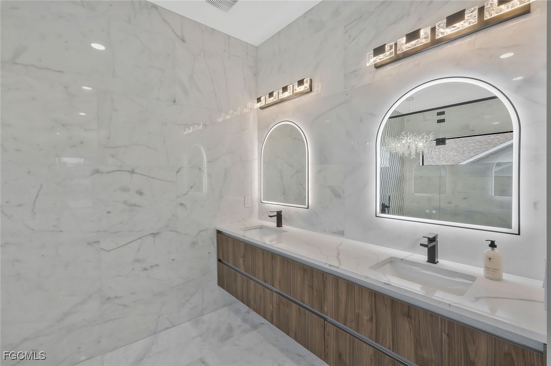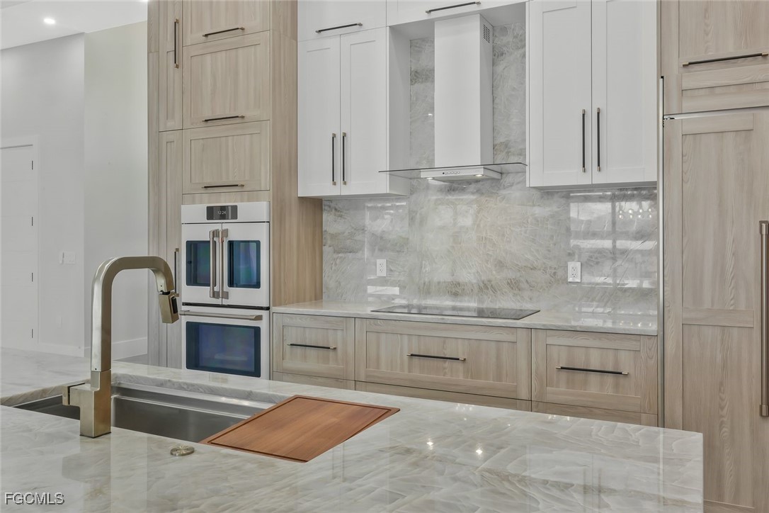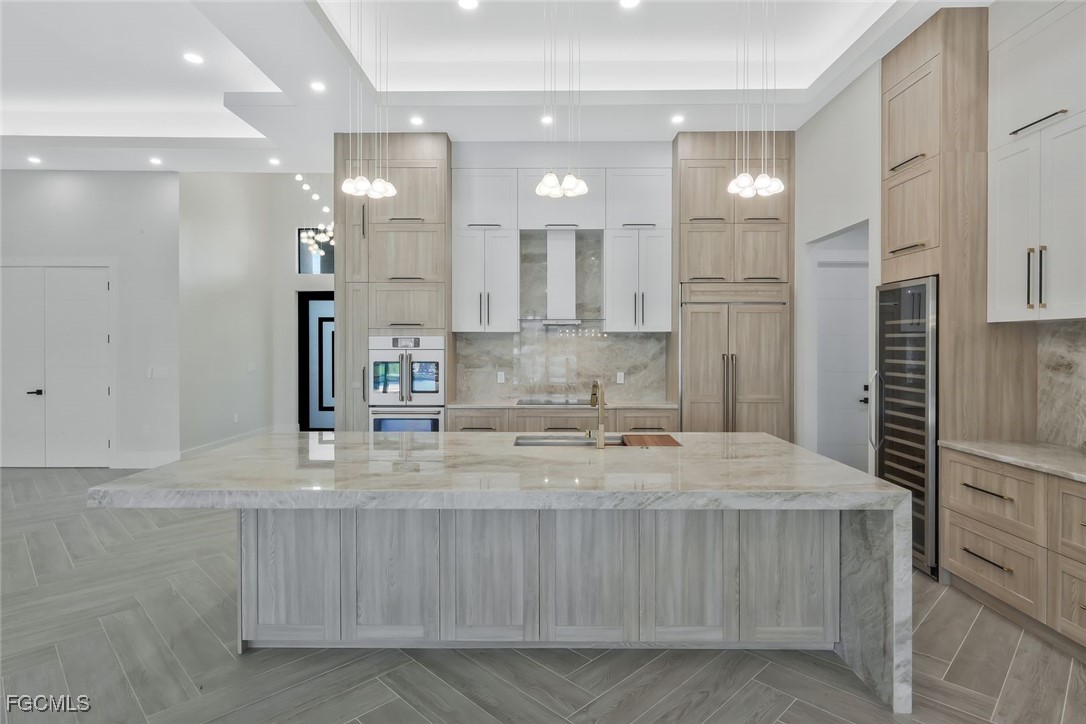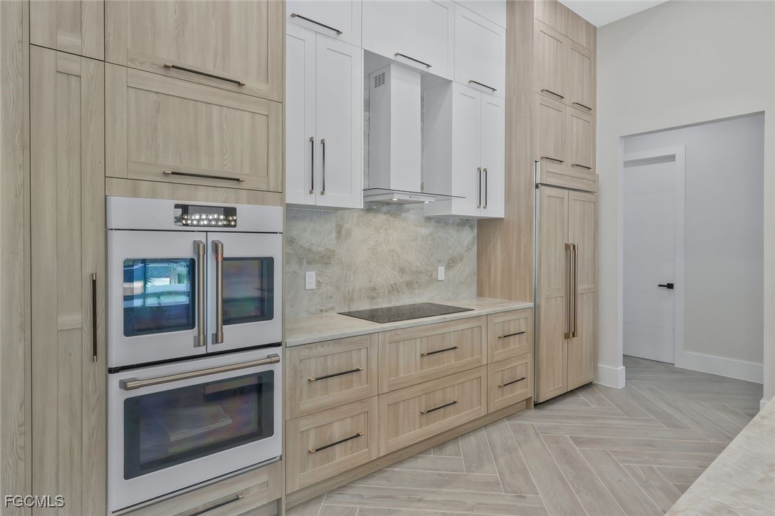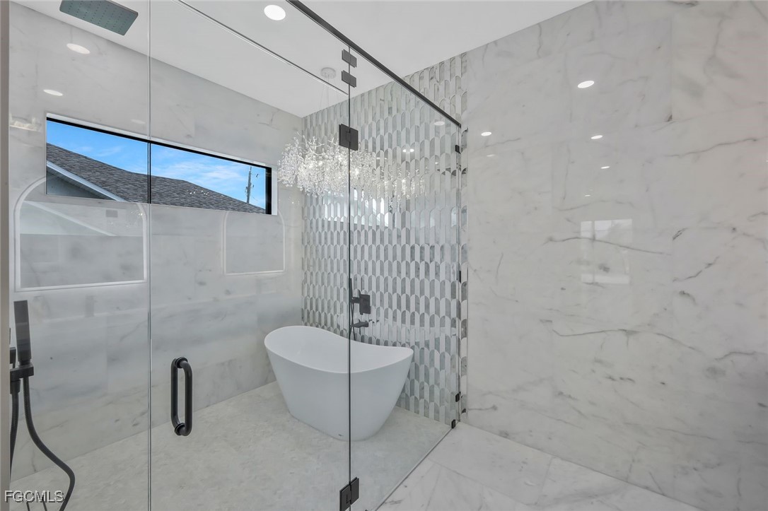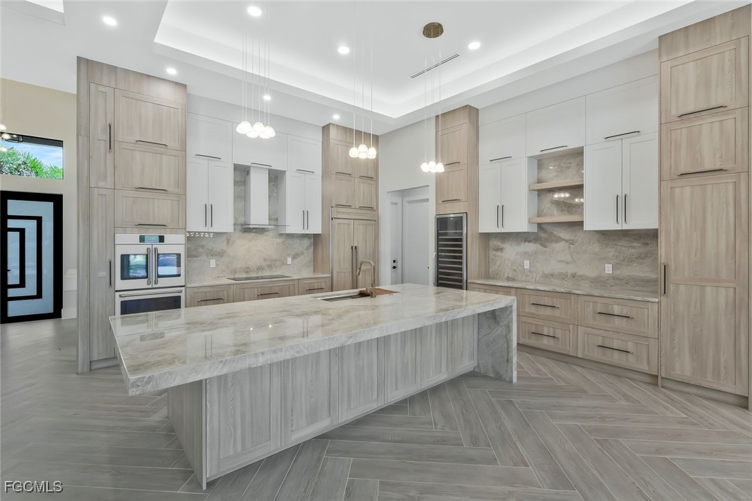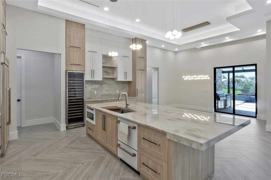 The home features soaring ceilings with the entry area over 17 feet, the living room and kitchen area at 12 feet, and bedrooms and bathrooms at 10 feet. The living room measures 18’6” by 25’6” and provides an open and spacious environment that flows into the kitchen and dining areas. The kitchen is a custom design by Lioher of Miami and is equipped with Café by GE appliances. A built-in wine cooler with capacity for up to 190 bottles adds a sophisticated touch. Solid-core interior doors, genuine crystal chandeliers, and marble tile in the primary bathroom enhance the overall level of finish throughout the home.