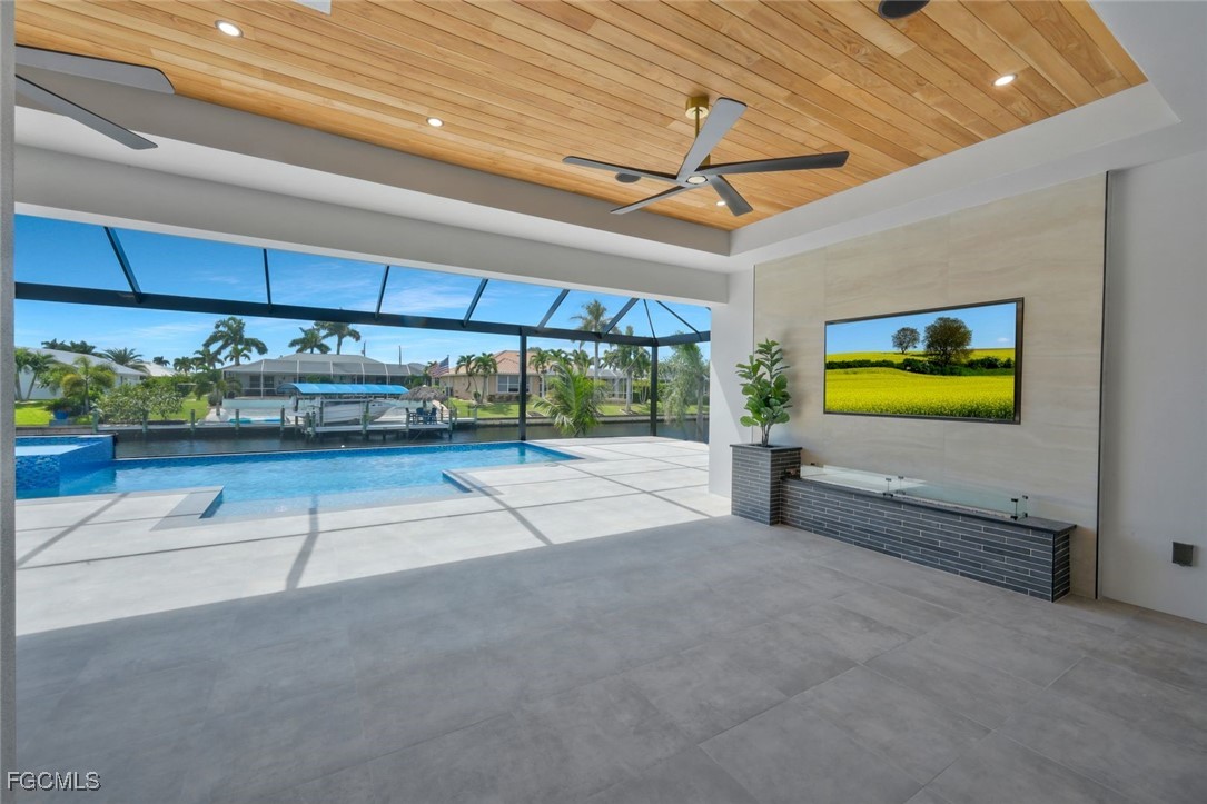 Outdoor living is highlighted by a saltwater pool and spa with an electric heater, autofill, and screened enclosure. The pool has a maximum depth of 5 feet 6 inches and is complemented by a custom outdoor fireplace and ceiling speakers with Bluetooth connectivity. The lanai also includes a 360-degree picture-window style screen enclosure that enhances water views while maintaining comfort.