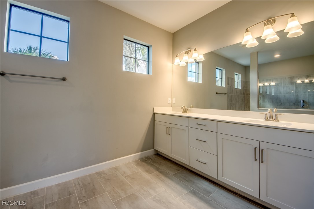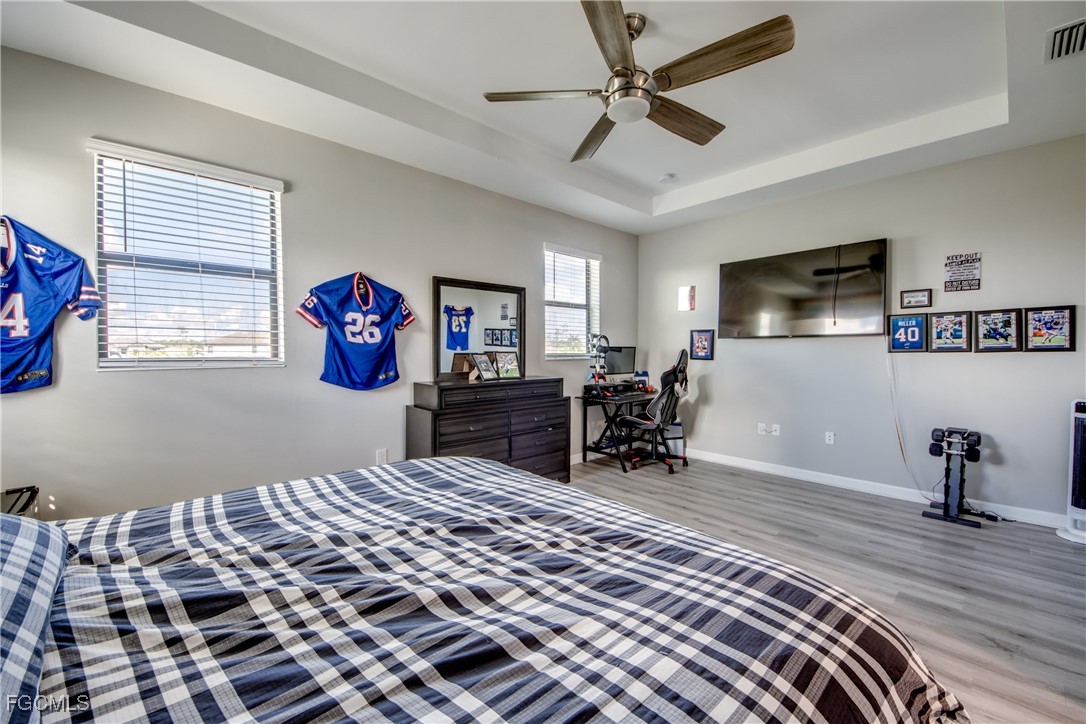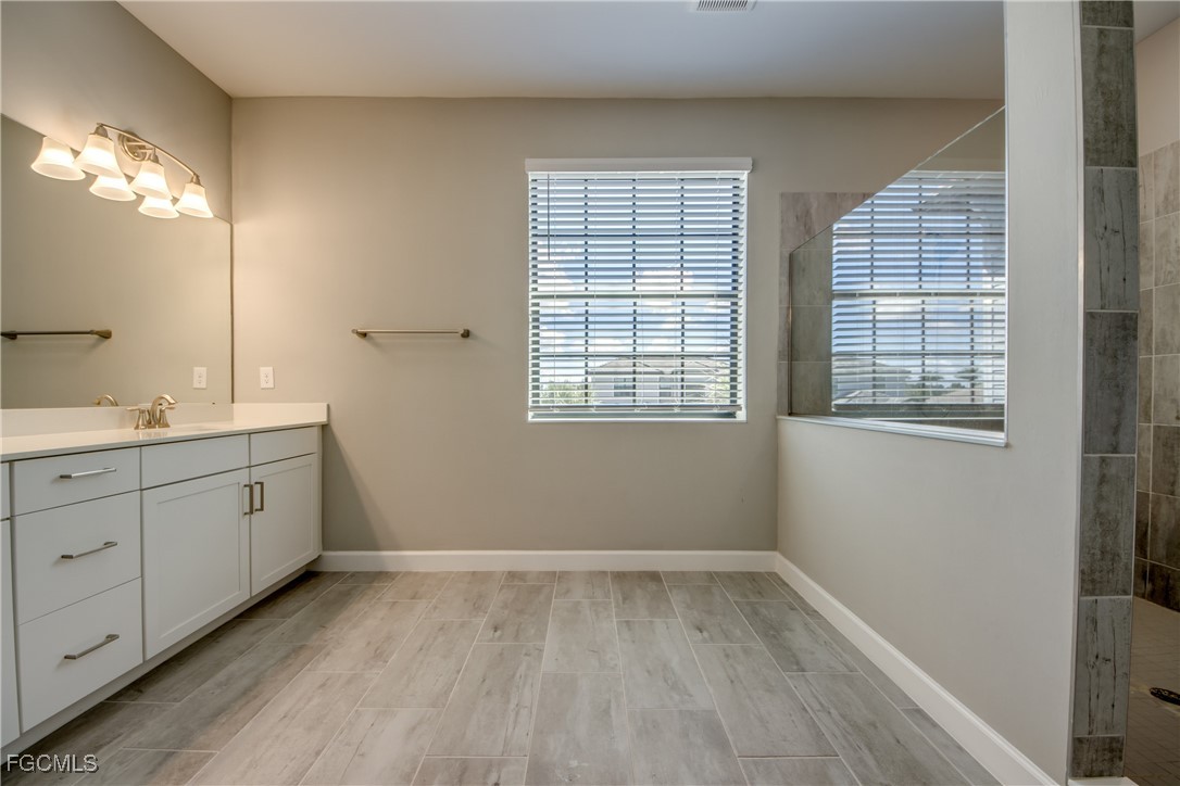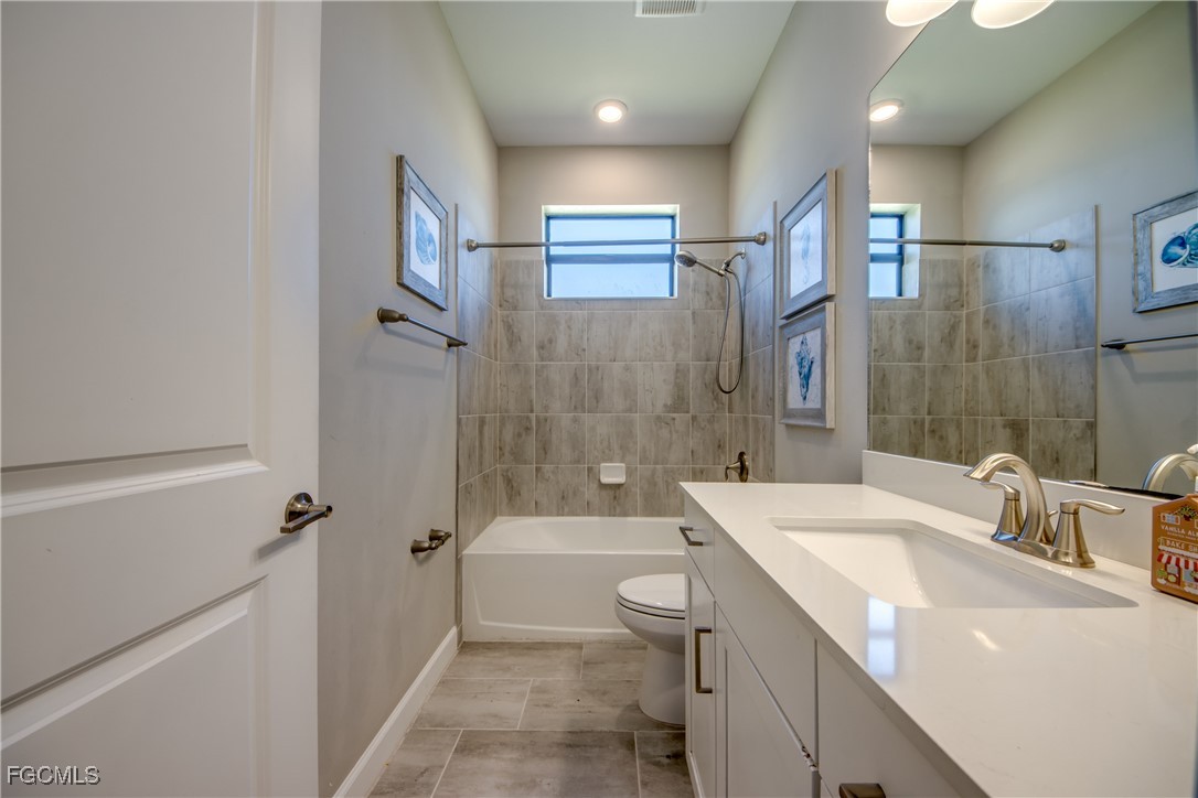 The Wynwood model in Timber Creek presents a rare opportunity to own a spacious estate home in one of Fort Myers’ premier guard-gated, resort-style communities. Offering approximately 3,945 square feet of living space, this two-story residence includes 5 bedrooms, 4.5 bathrooms, and a three-car garage that has insulated garage door and wall unit, highlighted by the convenience of dual owner’s suites—one on the first floor with vinyl flooring and another more luxurious suite upstairs both with large walk in showers and dual sinks. The first floor features soaring ceilings and French doors at the entry, a versatile den near the foyer, and an open living concept where the great room and kitchen seamlessly connect to a screened lanai through sliding doors. Tile flooring extends throughout the downstairs living areas, complemented by updated fixtures and fans that add a touch of elegance. Kitchen features stunning quartz countertops, G&E appliances like a double oven, cooktop surface, stainless steel sink. Everything in the kitchen is complemented perfectly with the mosaic backsplash on the bar and under the hood. a The second floor offers three additional bedrooms and bathrooms, a spacious bonus room, and the second owner’s suite. Outdoor living is enhanced by a waterfront setting, a fully fenced backyard with ample space for a pool, and an expansive 60’ x 10’ screened lanai ideal for entertaining. Timber Creek itself offers 24-hour security and a wealth of amenities including a clubhouse, resort-style pools, fitness center, and proximity to JetBlue Park, making this home equally suited for family living and entertaining on a grand scale.