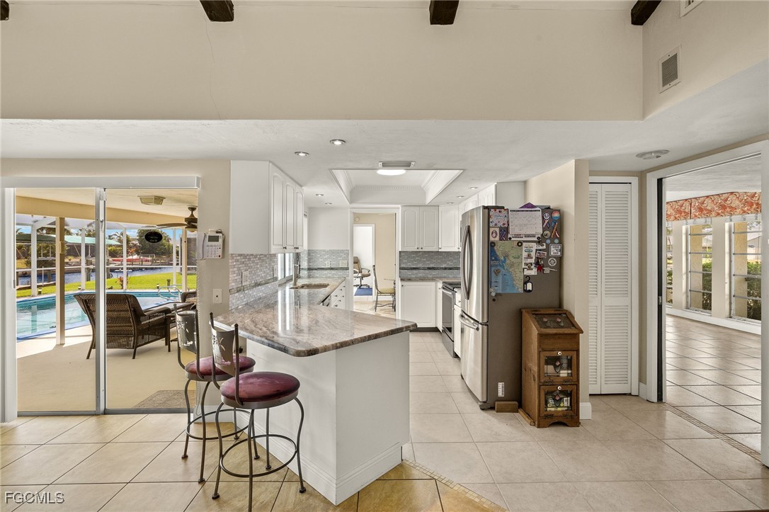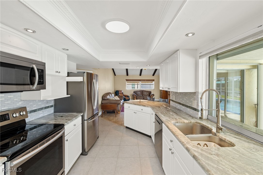 INTERSECTING CANAL VIEW - SAILBOAT ACCESS. Wake up to paradise in this exquisite sailboat-access waterfront 3-bedroom, 2-bath home located in the sought-after southeast Cape Coral Savona neighborhood. Enjoy breathtaking intersecting canal views from your master bedroom, pool, and screened lanai. This spacious and meticulously maintained home offers a comfortable floor plan, featuring a living and dining area, a separate family room with dining space, and a split bedroom layout for added privacy. The updated kitchen is a chef's dream, boasting granite countertops, a beautiful accent backsplash, stainless steel appliances, and a convenient breakfast bar. Step outside to your screened and covered lanai to take in the gorgeous views or enjoy a refreshing dip in the South facing heated pool. Boating enthusiasts will appreciate the 10,000 lb. boat lift for easy water access. This home is minutes to open water. One left turn to the adjoining canal and you are in open water on the way to the Gulf. The beautifully landscaped yard includes a sprinkler system and lush landscaping. This home comes partially furnished, allowing you to move right in and start enjoying your new home. Located on the beloved Savona Parkway, this home is surrounded by residents who take pride in their neighborhood. This home is a Certified Pre-Owned Home. Each CPO home is thoroughly pre-inspected by a licensed home inspector before being placed on the market. Purchasing a CPO Home means you also get access to exclusive mortgage rates and closing-cost discounts. When you purchase a Certified Pre-Owned Home, you'll have two company-backed warranties: a 12-Month Limited Home Warranty and an exclusive 12-Month Buy-Back Guarantee. Rates as of April 2025. ZERO down financing is available to those who qualify. $5000 closing costs credit or exclusive financing rate is subject to buyer using sellers preferred lender. Don't miss out on your opportunity to own this dream home! Come experience the ultimate in waterfront living! No water intrusion or flooding from any recent storms.