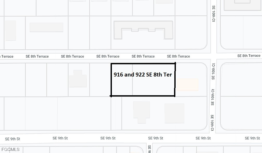 This sale includes property address #916 (appox. quarter acre) and #922 (approx. half acre) SE 8th Terrace. A rare opportunity to own +/- 240 feet of road frontage, zoned Professional (P) with future land use Commercial Professional (CP). All city utility assessments paid in full. This is 2 parcels being sold together for a total of 6 lots. On the outer edge of Cape Coral Industrial Park with great access to Del Prado Blvd. This zoning allows for multiple uses. Multi Family buildings on North side of same street--maybe rezoning to multi family is possible? Tax amount shown is total amount paid for both parcels.