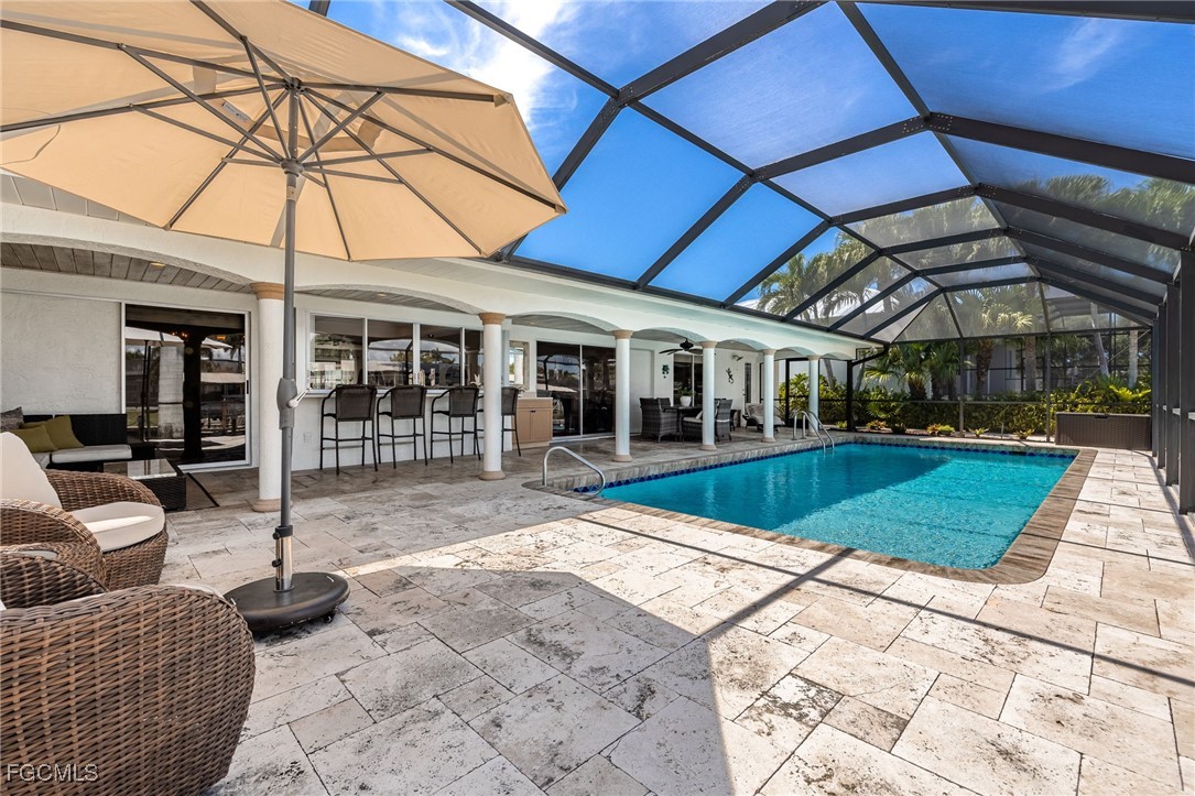 DIRECT GULF ACCESS POOL HOME in SW Cape Coral! Located in one of the hottest areas of Cape Coral, this waterfront gem sits near the vibrant downtown district, with close proximity to The Westin, Cape Harbour, the Yacht Club, shopping, dining, and so much more. As you drive down the private dead-end street, you’re greeted by a neighborhood of stunning Gulf access homes framed by majestic Royal Palms. Step inside through the welcoming front porch entry and immediately be captivated by panoramic water views from almost every room. This open-concept floor plan has been completely transformed with a remodeled, expanded chef’s kitchen featuring Jenn-Air appliances, custom cabinetry, and a massive island that anchors the space for entertaining. Pocket sliders from the great room open seamlessly to the resort-style pool area with outdoor wet bar, pass-through window, covered lanai space, and sun-soaked deck overlooking the water. The split-bedroom layout ensures privacy, with the owner’s suite and a guest suite offering direct pool access. Upgrades are endless: impact windows & garage door, custom closets, new exterior paint & lush landscaping in 2024, and more. The waterfront lifestyle is complete with a top-notch dock, 7,500-lb boat lift, and just minutes to open water. This home is move-in ready, impeccably maintained, and offers transferrable flood insurance for added peace of mind. Homes like this are rare — don’t miss your chance to own a true Gulf access showpiece in Southwest Cape Coral. Schedule your private tour today!