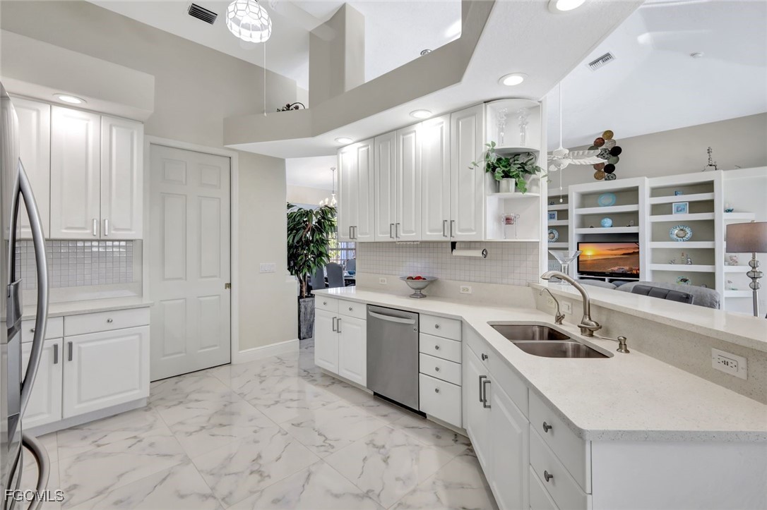 The gourmet kitchen boasts stainless steel appliances, breakfast bar seating, and panoramic water views—perfect for entertaining. Sliding glass doors open wide to create seamless indoor-outdoor living, where you can host sophisticated dinner parties or casual poolside gatherings.