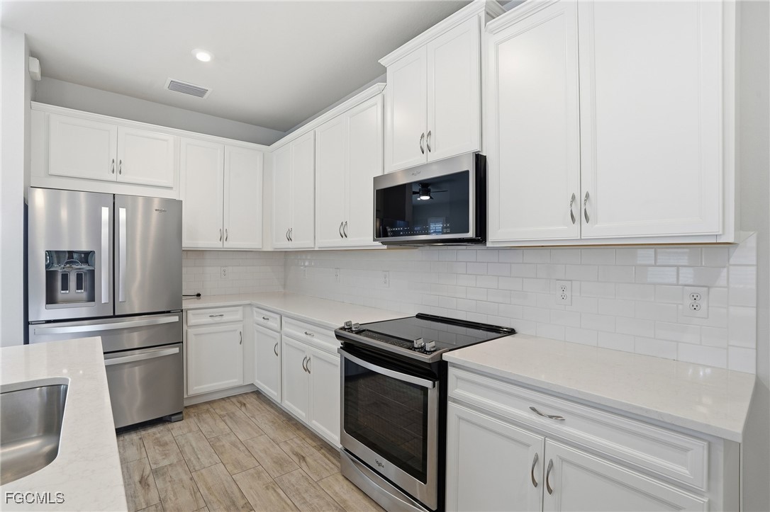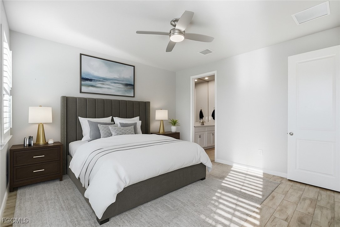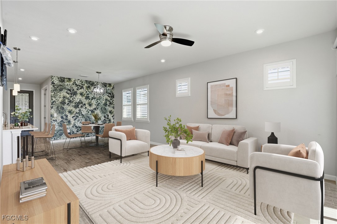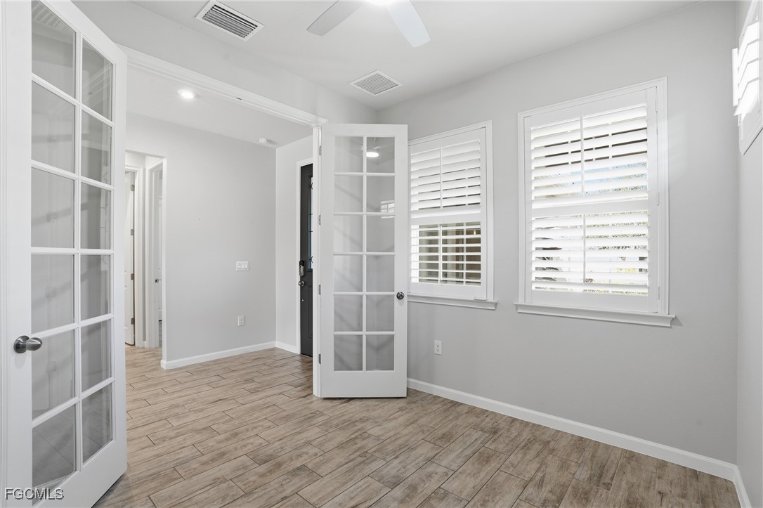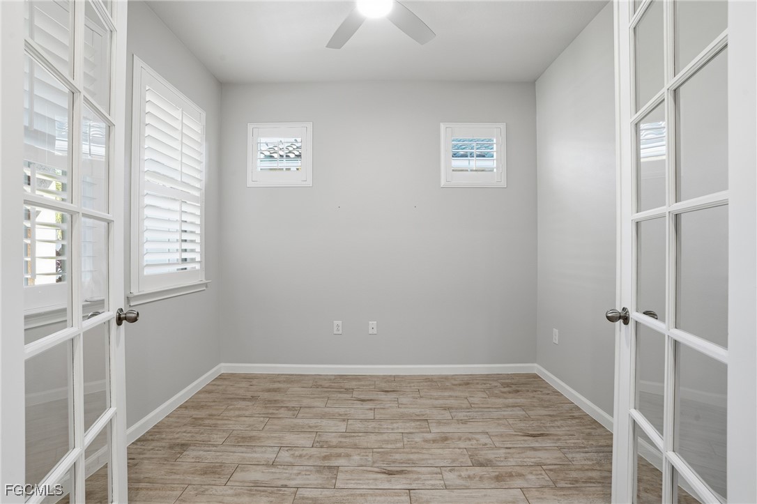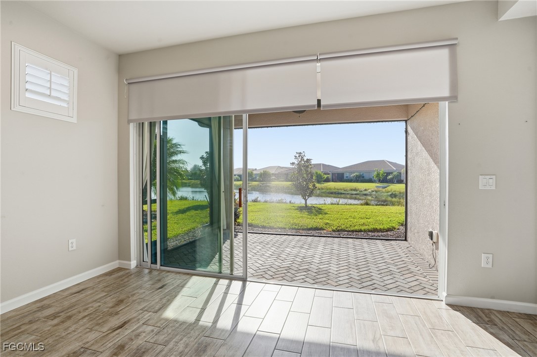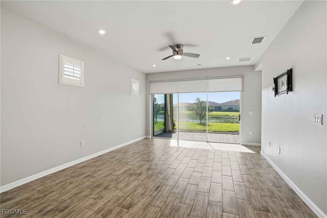 Welcome to this beautifully maintained 2-bedroom plus den, 2-bathroom villa! Located in the sought-after gated community of Bonavie Cove, right in the heart of Fort Myers. Start your mornings on the lanai overlooking peaceful water views, where the gentle sounds of nature and breathtaking sunrises set the tone for your day. Inside, the open-concept design creates a bright, inviting atmosphere, with plantation shutters and elegant tile flooring throughout. The spacious living and dining areas flow effortlessly into a STUNNING kitchen, complete with a large island and breakfast bar, sleek stainless steel appliances, and abundant cabinetry. A CUSTOM-BUILT pantry with a built-in spice rack adds to the functionality of the space. The primary suite is a true retreat with an expansive walk in closet. While the spa-like ensuite features dual vanities and a gorgeous walk-in shower. The guest bedroom and second bath ensure visitors have plenty of space, while the den provides the perfect spot for a home office, creative studio, or third bedroom. Thoughtful extras include a dedicated laundry room, three mounted TV brackets, a Ring doorbell, and much more! The oversized 2-car garage is equipped with polished epoxy flooring, a ceiling-mounted storage system accommodating up to 24 totes, and a workbench area complete with lockable cabinets and pegboard, ideal for any project or hobby enthusiast! Bonavie Cove delivers resort-style living with low HOA fees and *no flood insurance or CDD required*. Amenities include lawn maintenance, gated entry, a heated Jr. Olympic pool, fitness center, gas fire-pit, Paw Park, and a covered cabana. Everything you need to enjoy a high-end lifestyle right at home! Perfectly situated near top-rated schools, tons of shopping centers, exceptional dining, pristine beaches, and only 2 miles away from Lee Memorial Hospital! This villa checks all of the boxes! The only thing missing is YOU!