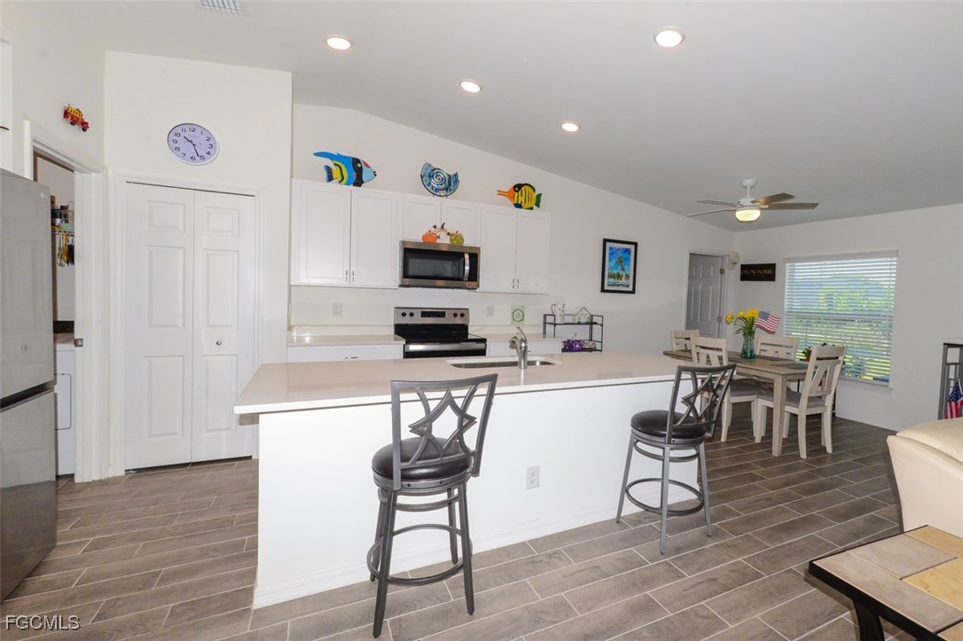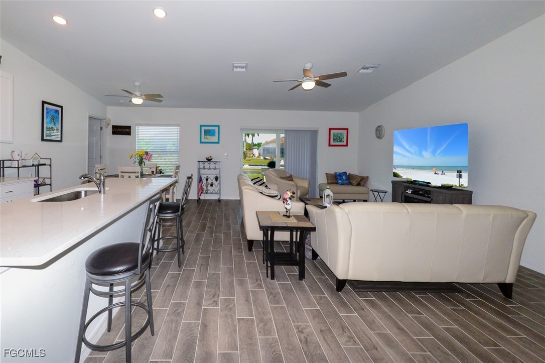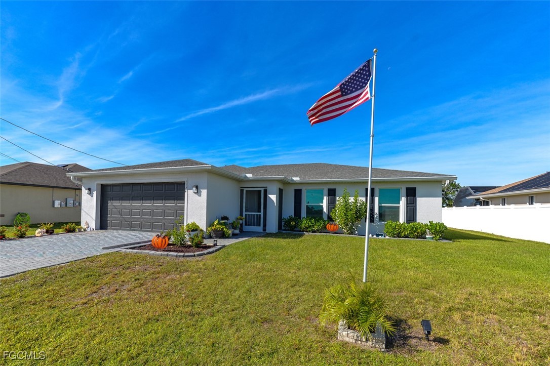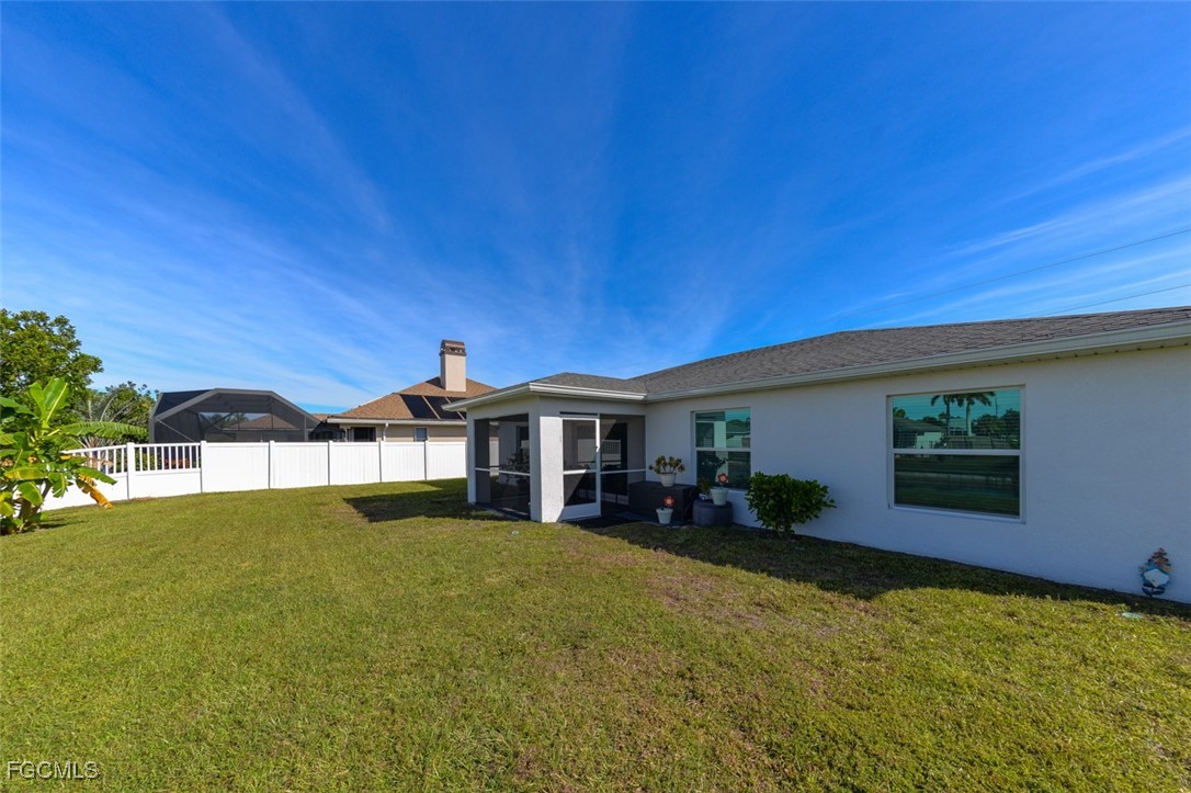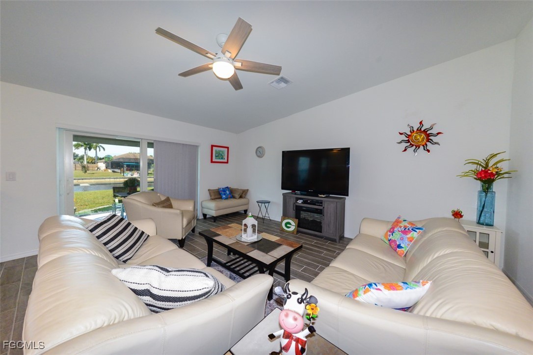 Welcome to your slice of paradise in beautiful Cape Coral! This spacious 4-bedroom, 2-bath home sits on a freshwater canal, offering peaceful water views and a relaxing Florida lifestyle right from your own backyard. Enjoy fishing, kayaking, or simply unwinding by the water’s edge. Inside, you’ll find a bright, open floor plan designed for comfortable family living and entertaining. The kitchen features modern appliances including upgraded 36” contemporary shaker-style cabinets, a large 8’ wide kitchen island that opens to the main living area, upgraded countertops, and ample cabinet space. The primary suite includes a walk-in closet and a private bath, while three additional bedrooms provide plenty of space for family, guests, or a home office. Step outside to your screened lanai and enjoy the serene canal backdrop — the perfect spot for morning coffee or evening sunsets. Located close to top-rated schools, parks, shopping, and dining, this home combines convenience with coastal charm. All city assessments will be paid in full, giving you peace of mind and added value. Whether you’re looking for a family home or a seasonal retreat, this property is move-in ready and waiting for you!