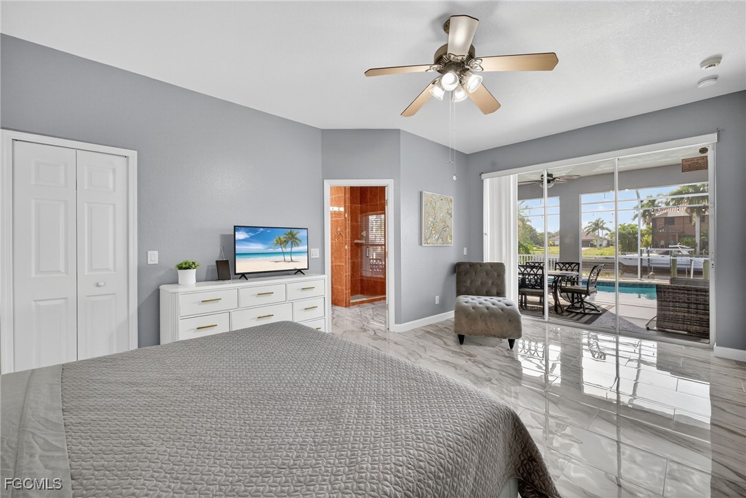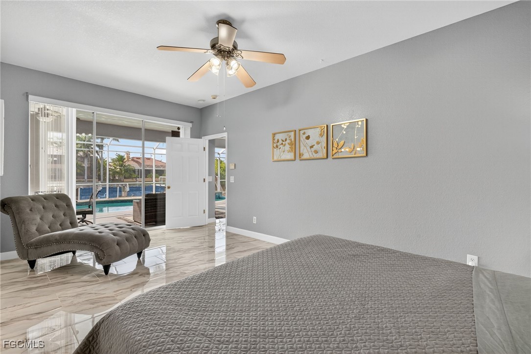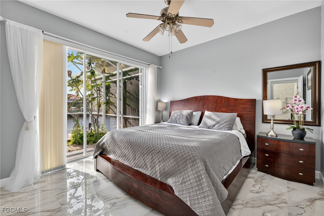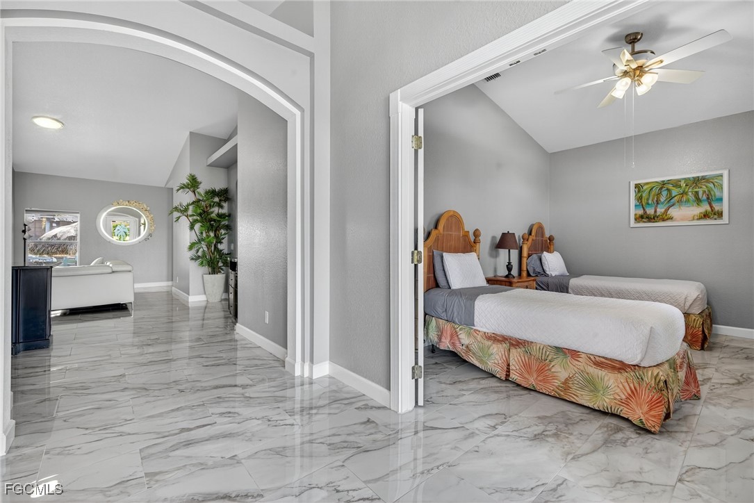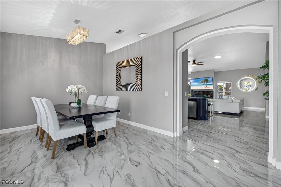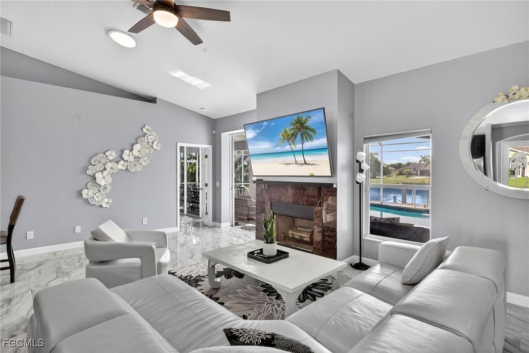 Upon entry, you have a large dining area and a den along with beautiful porcelain flooring that can’t be missed throughout the entire house. The kitchen has a large island with plenty of storage place and is perfectly positioned to give you a clear view of the living room and the pool and oversized canal. There are skylights that brighten up the living room during the day and a wood-look burning fireplace, along with vaulted ceilings. The primary bedroom has plenty of space for additional storage needs along with a large walk-in closet and separate sliding doors leading out to the lanai. The primary bathroom has dual sinks along with a large tub and stand-up shower. All of the bedrooms are large enough to accommodate a king-size bed and additional furniture storage if needed. There is also a pool bath that leads out to the lanai area for extra convenience.