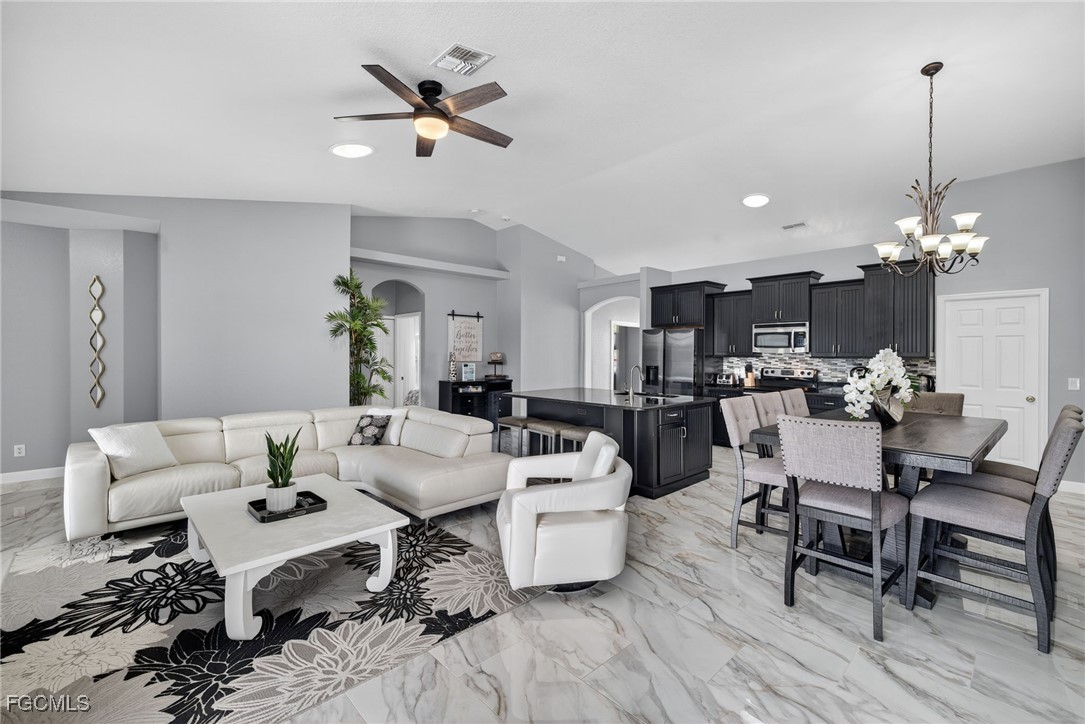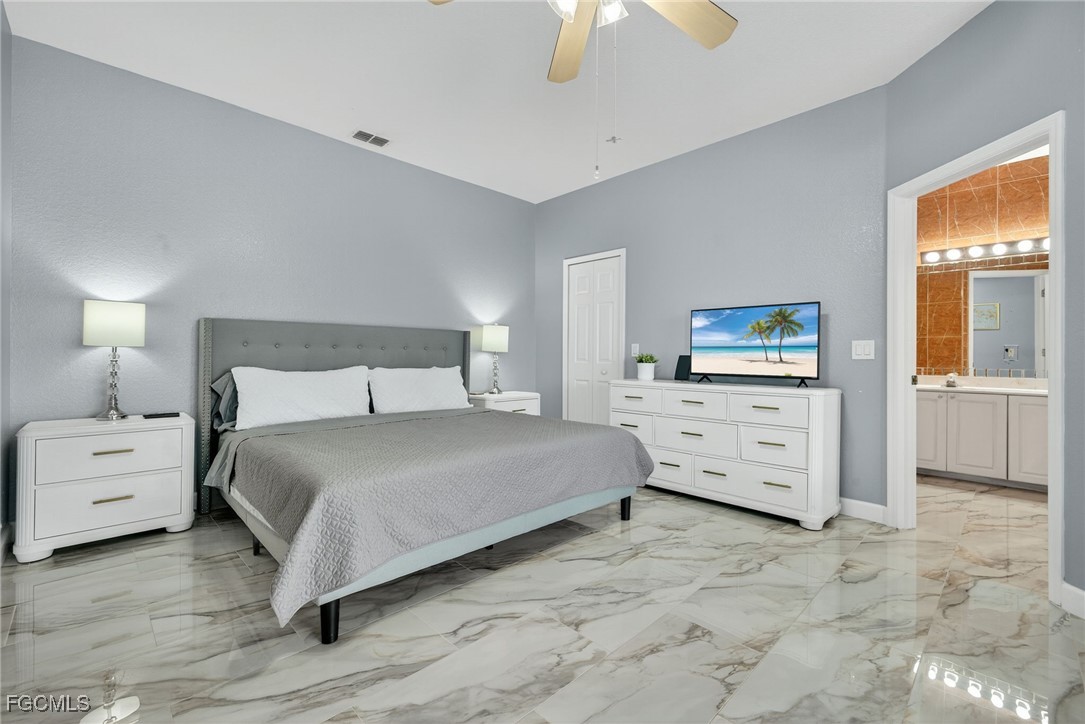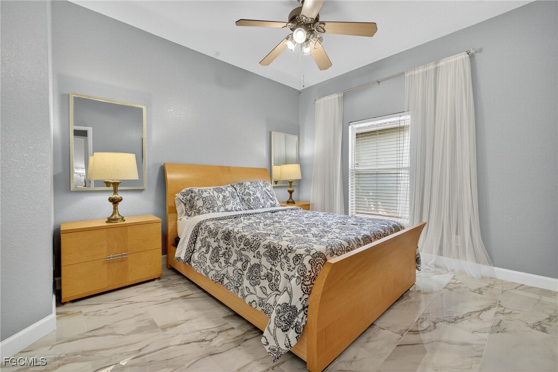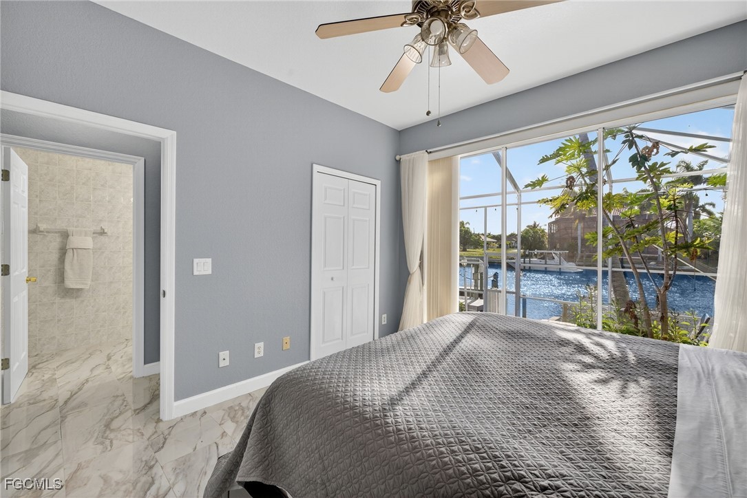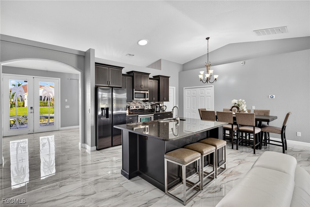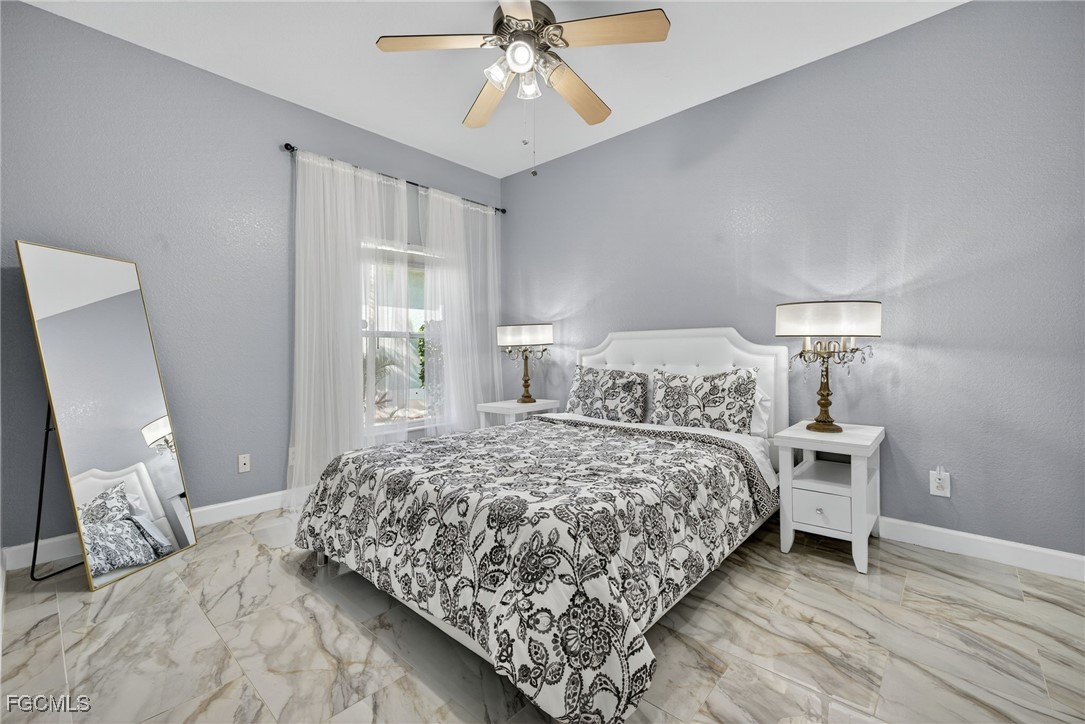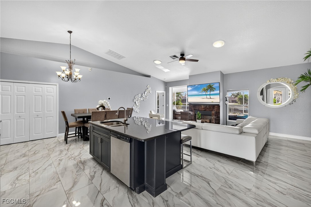 Upon entry, you have a large dining area and a den along with beautiful porcelain flooring that can’t be missed throughout the entire house. The kitchen has a large island with plenty of storage place and is perfectly positioned to give you a clear view of the living room and the pool and oversized canal. There are skylights that brighten up the living room during the day and a wood-look burning fireplace, along with vaulted ceilings. The primary bedroom has plenty of space for additional storage needs along with a large walk-in closet and separate sliding doors leading out to the lanai. The primary bathroom has dual sinks along with a large tub and stand-up shower. All of the bedrooms are large enough to accommodate a king-size bed and additional furniture storage if needed. There is also a pool bath that leads out to the lanai area for extra convenience.