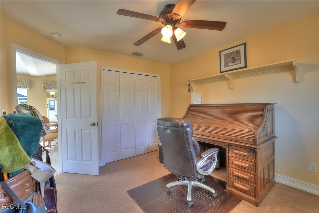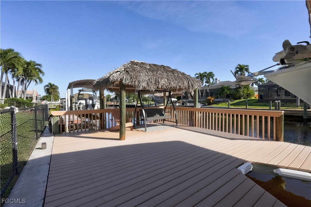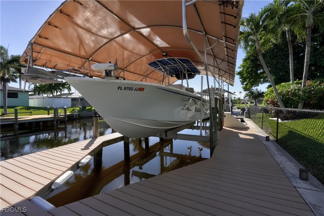 Welcome to your dream waterfront home in Cape Coral! This stunning, almost 2500sq ft single family home boasts 4 bedrooms, 2.5 bathrooms, and a 2 car garage, perfect for a growing family or those who love to entertain. The in-ground pool W/bench seat and 2 spa jets is the perfect place to cool off on hot summer days, while the covered boat lift and floating kayak dock provide easy access to the water for all your boating adventures. Inside, you'll find luxurious finishes such as Corian counters, stainless steel appliances, and a mix of carpet and tile flooring throughout. The large sliding doors and kitchen pass through window create a seamless indoor-outdoor living experience, while the tiki on the dock is the perfect spot to relax and enjoy the sunset. With direct Sailboat access, No Bridges, you'll have endless opportunities to explore the beautiful waterways of Cape Coral, or, anywhere else in the World. Don't miss out on this incredible opportunity to own your own piece of paradise in Southwest Florida! New Roof 2018, New AC 2024, NO FLOODING in past Hurricane's