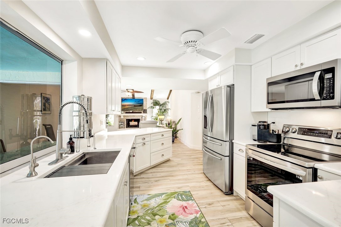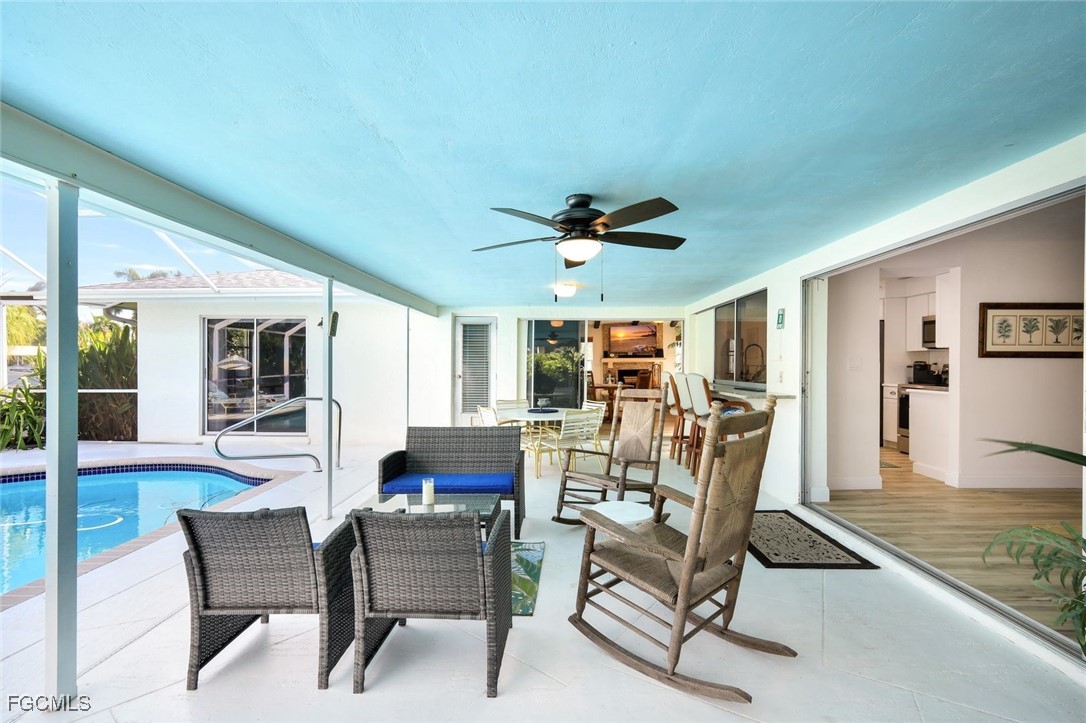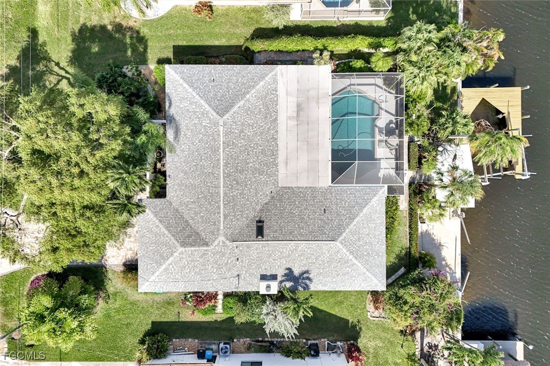 DIRECT GULF ACCESS POOL HOME IN THE HEART OF SW CAPE—NO LOCKS OR BRIDGES! Set on a quiet cul-de-sac and wrapped in lush, mature landscaping, this beautifully updated waterfront home delivers exceptional privacy, comfort, and effortless boating, offering deep water access with a 10,000-lb lift featuring brand-new motors (2025), a wraparound dock, and two davits for jet skis—all just a scenic 15-minute ride to open water. Inside, the light-filled layout showcases luxury vinyl plank flooring (2023), fresh interior paint (2023), and inviting architectural details including vaulted ceilings with exposed beams, skylights, and a custom artisan fireplace that anchors the living space with coastal charm. The remodeled kitchen features white shaker cabinetry, quartz countertops, stainless steel appliances (2024), reverse-osmosis filtration (2023), and a generous pass-through window for easy entertaining. Nearly every room opens to the expansive lanai where an oversized saltwater pool—resurfaced in 2023—sits beneath a new “no-see-um” cage (2023) with upgraded lighting, multiple seating zones, and exceptionally private sightlines created by tall palms, dense tropical plantings, and a strategic landscape design that shields the pool and lanai from neighboring views, clothing optional! The primary suite offers pool views, lanai access, and a beautifully updated bath with dual sinks, quartz counters, modern fixtures, and nautical-inspired lighting, while the guest wing includes a renovated pool bath with a custom marble shower (2023) and spacious guest rooms, one with direct pool access. Major upgrades include new HVAC and ductwork (2023), new plumbing system (2023), resealed lanai and pool deck (2024), new 50-gallon water heater (2023), new pedestal washer/dryer (2023), new paver driveway (2022), new pool vacuum (2023), and a durable 25-year shingle roof (2017). Outside, a charming bird path with arched trellises and shaded seating areas enhances the peaceful canal setting, all just minutes from Tarpon Point, Cape Harbour, kayak rentals, and a relaxing 10-minute bike ride to Rotary Park. Flood insurance is fully paid through February 2026 and transferable. This move-in-ready home offers a uniquely private tropical retreat with exceptional boating access in one of SW Cape Coral’s most desirable neighborhoods. Are you looking for a home with modern updates and premium boating access and ALL the updates inside and out? Come see this one! You deserve to be close to everything that SWFL has to offer: boat, kayak, jet ski, fish; or take a dip in your private oasis!