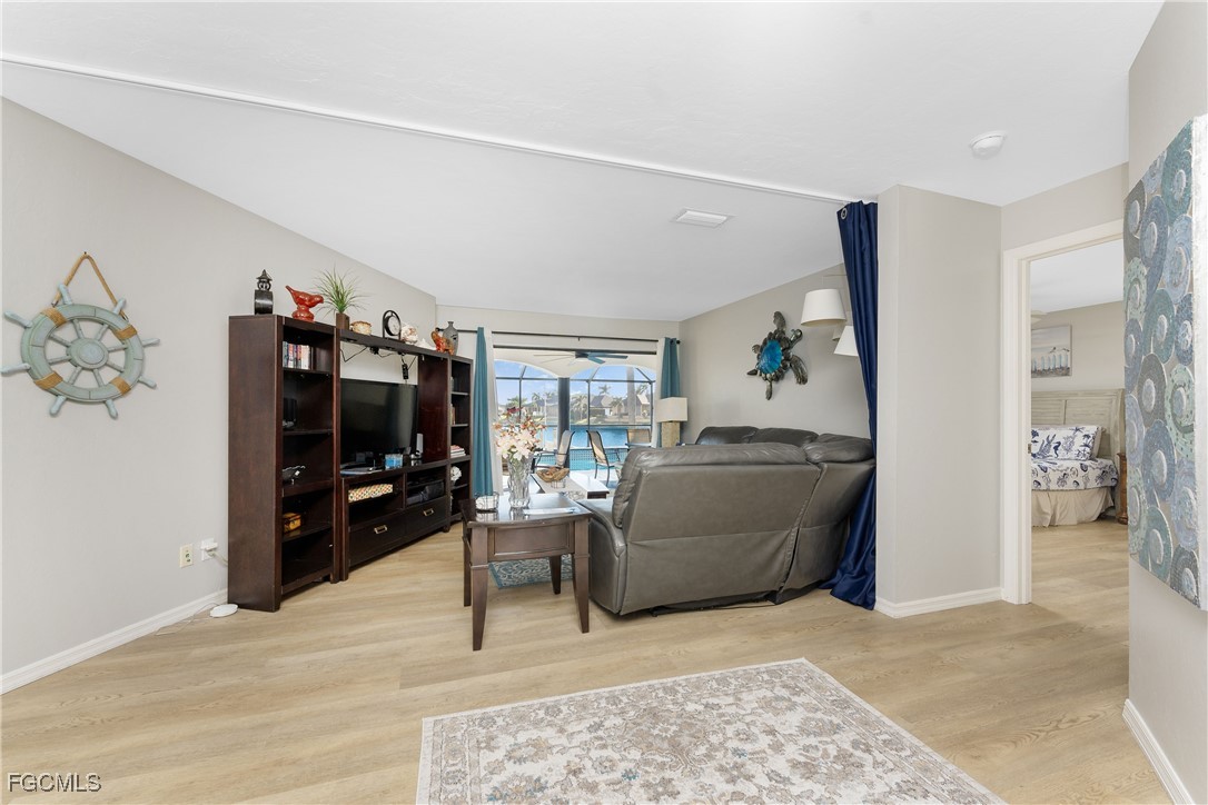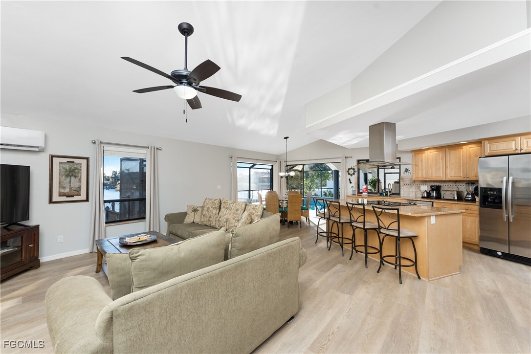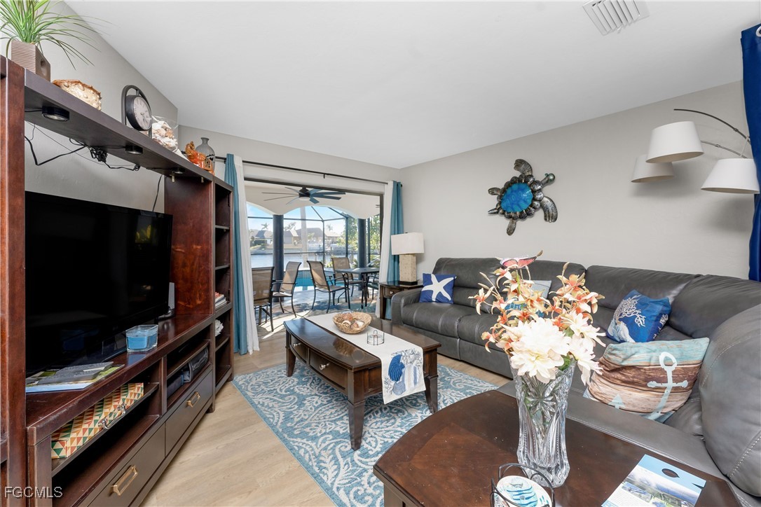 Don’t miss your opportunity to own this remarkable Gulf Access home located in the highly desirable community of SW Cape Coral. This is truly a boater’s delight with quick and easy access to open water. And with a Southern exposure and an incredible large basin view from your dock, this home has the PERFECT LOCATION. And speaking of LOCATION this home is one of three homes in this price range south of Cape Coral Parkway…giving you one of the shortest boating travel times to open water! This home boasts of 3 bedrooms and a den which can easily be used a fourth bedroom when needed. This home is being sold TURNKEY…it’s ready for you to move in upon closing! This well maintained home has recently been updated with a NEW ROOF, NEW FLOORING, GUTTERS, NEW POOL HEATER, FRESH EXTERNAL PAINT, AND NEWER A/C (2021) assuring you many years of low maintenance living. Upon entering the home you immediately will be impressed by the great view through the sliders to the pool, dock, and basin beyond. This view is repeated in the living room, kitchen, family room and the primary bedroom making the home bright/ airy and feeling larger than its nearly 2100 sqft. The home has a split plan and open concept giving great privacy for the owner. Additionally,the floor plan includes both a great room open to the kitchen and a living room allowing great flexibility when entertaining family and friends. The kitchen features SS appliances, solid wood cabinets, and granite countertops. Here too you will find a breakfast bar and a dining area …again with a great water view. The primary suite allows direct access to the pool/lanai area and enjoys an ensuite with an updated bath featuring dual split vanities, and a walk in shower. The two guest bedrooms are well sized with one having a walk in closet and both share a large bath again with dual vanities and tub/shower combination. The den (behind the barn doors) is currently configured as a fourth bedroom. Outside is a site to behold with a sparkling pool, large covered lanai which is screened with panoramic screening for an unobstructed view of the dock and basin. Schedule your private showing today…you won’t be disappointed. All Dimensions and Specifications are deeded to be accurate and should be confirmed to the buyer or buyer's agent satisfaction.