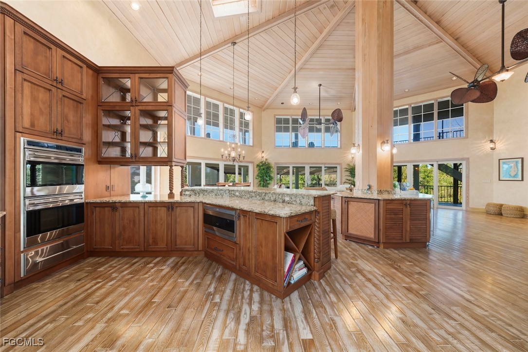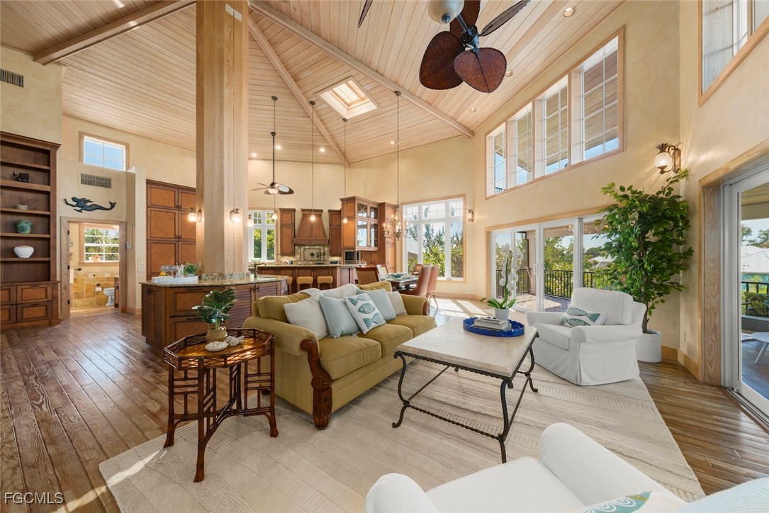 Discover a breathtaking waterfront estate where architectural artistry meets coastal serenity. Designed by acclaimed architect Joseph St. Cyr, this timeless residence rests on a private, lush half-acre in the coveted Del Sega community, that appeals to Boater and Beach enthusiasts alike. Superior boating access, boat to the Bay in minutes and also just steps away from world renowned shelling beaches. Nearby Captiva offers vibrant restaurants, and charming local shops. A grand sense of arrival greets you the moment you step inside. The expansive foyer unfolds with an elegant open staircase and a convenient three-story elevator, setting the tone for the thoughtful design found throughout the four-level home. Sunlight pours into the main living area, where vaulted, wood-beamed ceilings and rich red oak floors create a warm, inviting atmosphere. The open layout seamlessly connects a chef-inspired kitchen to the spacious family room anchored by a cozy wood-burning fireplace. The kitchen is a dream for culinary enthusiasts, boasting custom cabinetry, abundant storage, granite surfaces, and top-tier built-ins. A Sub-Zero refrigerator and freezer, Wolf convection ovens, warming drawer, and induction cooktop offer professional performance. The center island elevates both entertaining and everyday living with a built-in ice maker, refrigerator drawers, and wine cooler. Impact windows and sliding doors line the home, opening to a spectacular multi-level screened lanai that captures panoramic views of tropical landscaping, the sparkling pool, and the rejuvenating spa. Ascend to the top deck to feel the gulf breezes wash over you as you unwind with sunset views and glimpses of the Gulf of Mexico. With over 250 feet of waterfront along intersecting, direct-access canals, this estate is a haven for boating enthusiasts. A stunning Ipe wood dock and a 12,000-lb boat lift make days on the water effortlessly accessible. This extraordinary home blends refined luxury with the relaxed beauty of coastal living, offering a rare opportunity to own a signature waterfront retreat in one of Sanibel's most desirable​​‌​​​​‌​​‌‌​​​‌​​‌‌​‌​‌​‌​​​‌‌​​‌​​​​‌‌ enclaves.