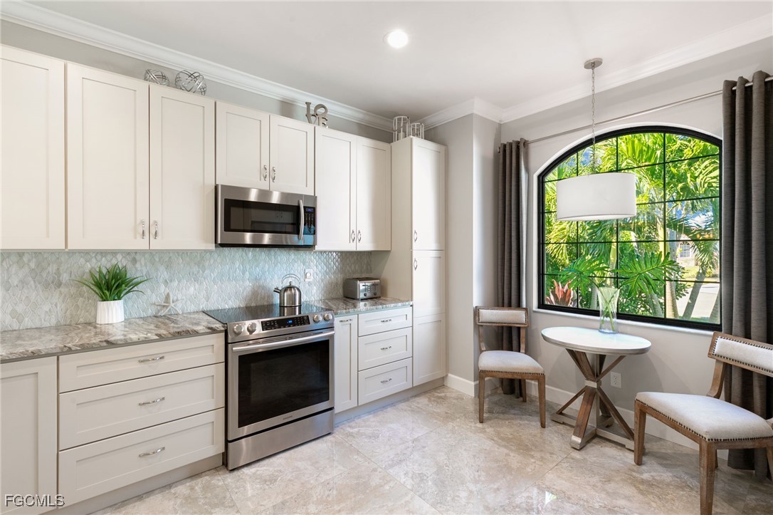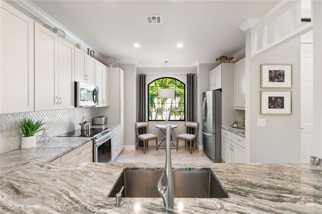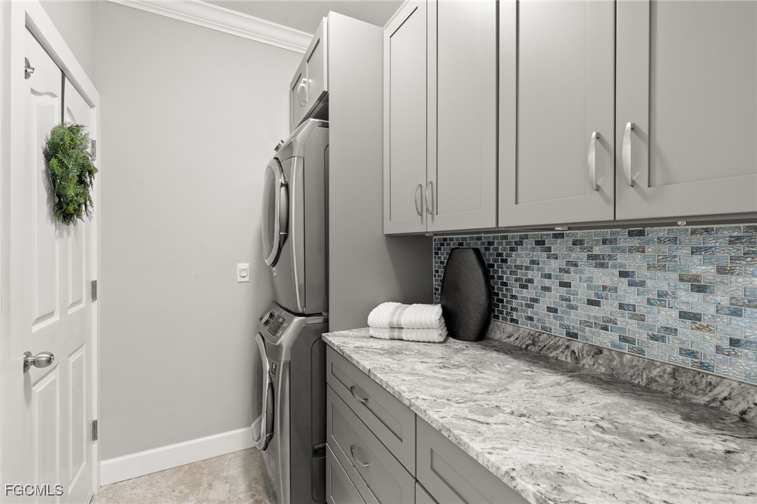 An opportunity like this is rare—a fully remodeled designer home that feels straight out of a luxury interiors magazine. With over $200,000 IN PREMIUM UPGRADES, this modern and refined residence radiates warmth, peace, and timeless sophistication. Inside, 32” x 32” POLISHED PORCELAIN TILE flows seamlessly through the home, complemented by CUSTOM CROWN MOLDING, CRAFTSMAN-STYLE INTERIOR DOORS, BARN DOORS, and SHIPLAP FEATURE WALLS that define a cohesive, elevated aesthetic. The chef’s kitchen is a true showpiece, offering SOLID-WOOD SHAKER CABINETRY, GRANITE COUNTERTOPS, a GLASS-TILE BACKSPLASH, and HIGH-END STAINLESS-STEEL APPLIANCES. The design continues into the laundry room, where MATCHING CABINETRY, GRANITE COUNTERS, and a STACKED SAMSUNG FRONT-LOAD WASHER AND DRYER create a thoughtful, functional workspace. Both bathrooms have been transformed into spa-inspired retreats. The guest bath features 24” x 48” PORCELAIN TILE, a NEW VANITY, and POLISHED CHROME FIXTURES. The primary suite offers an OVERSIZED GRANITE VANITY, a SUBWAY-TILE ACCENT WALL, and a PEBBLE-STONE SHOWER FLOOR that brings the feeling of a luxury spa into everyday living.
