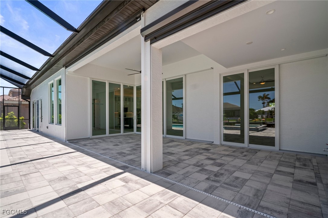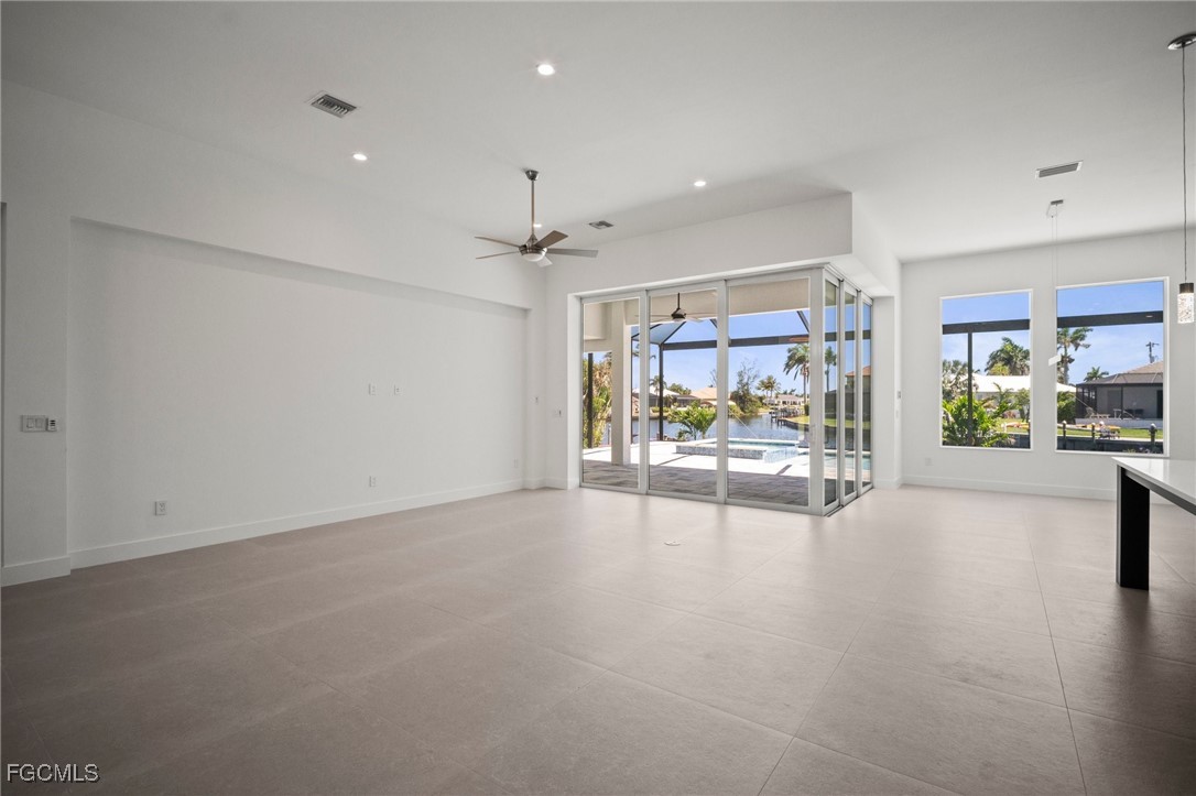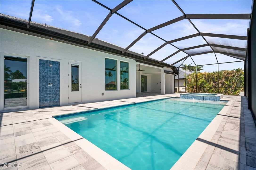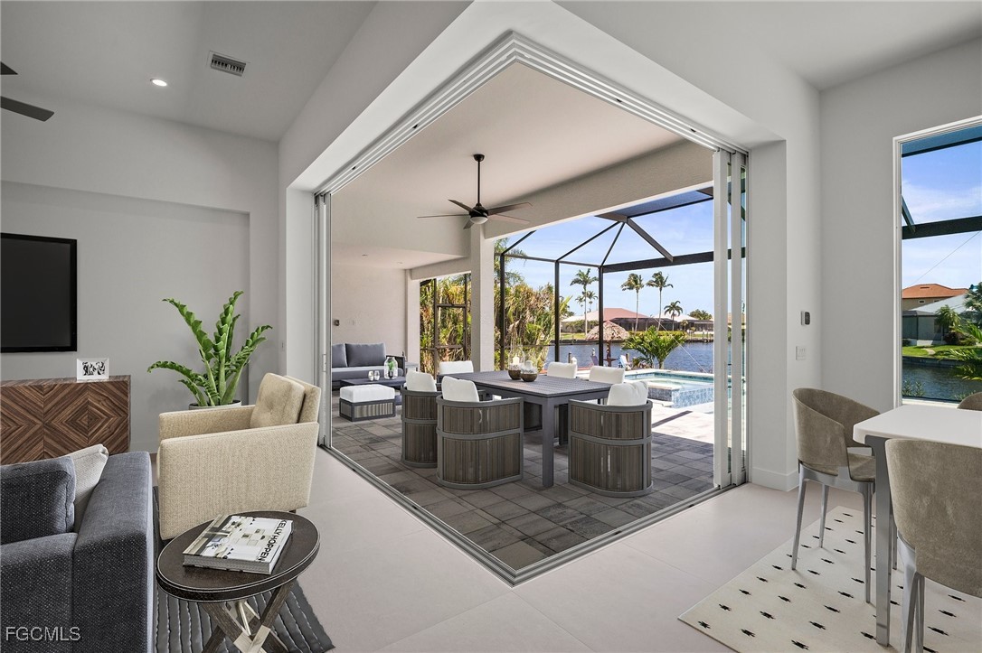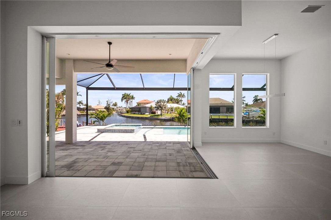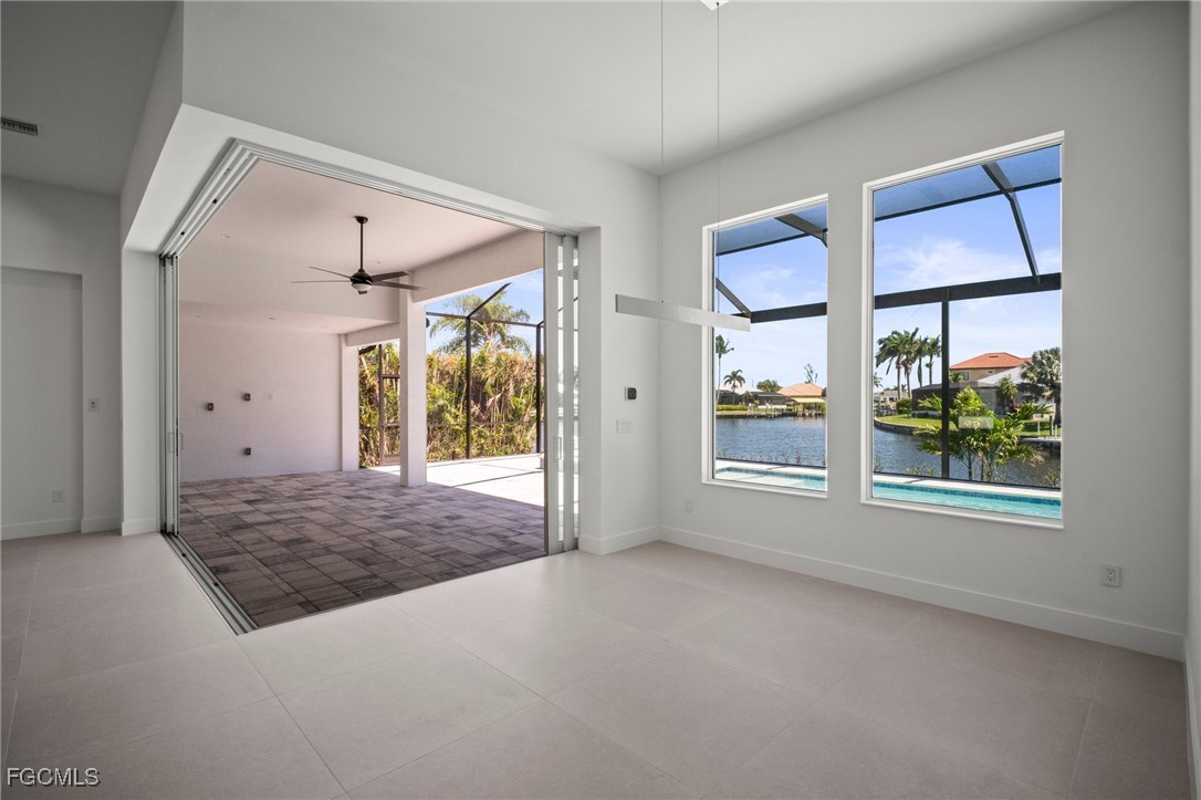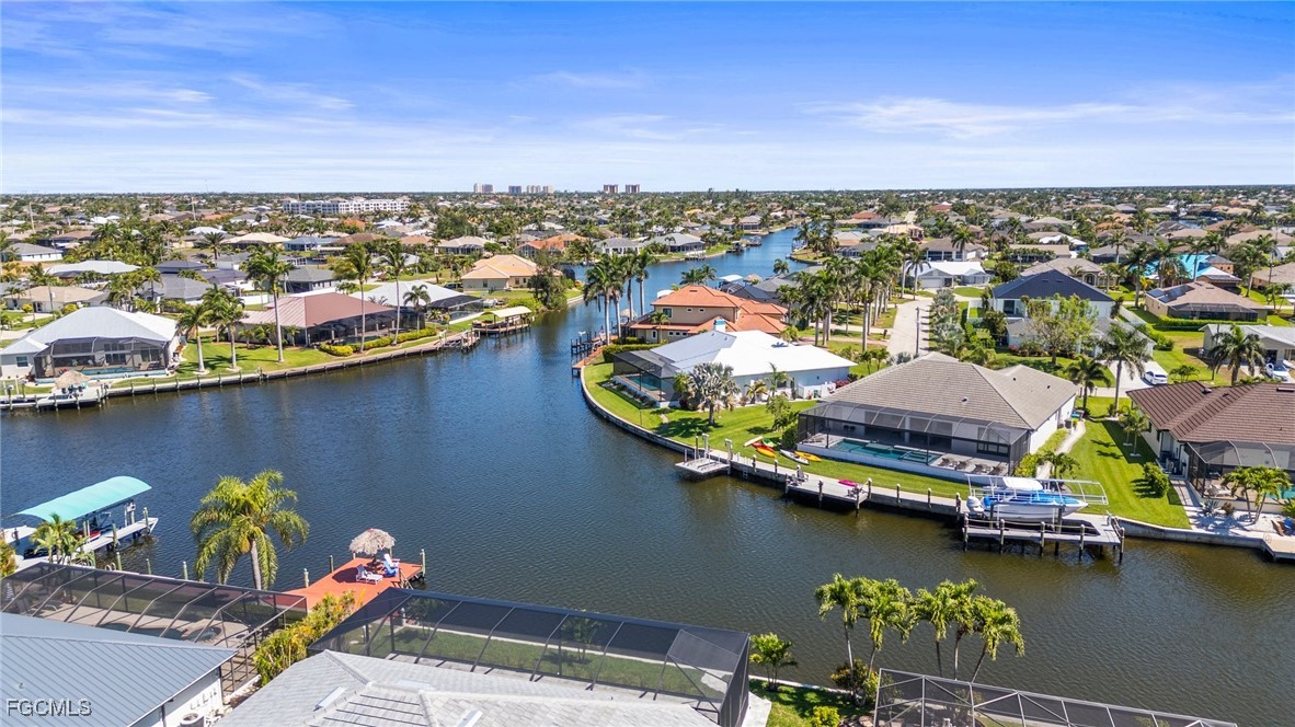 Brand-new modern gulf access home with desirable southern rear exposure and an awesome view over the intersecting canal. This home features 3 bedrooms, a large den and 3 bathrooms, a beautiful kitchen with center island and a dining area with large windows overlooking the canal intersection. The 10 ft. Zero Corner sliders open up to the lanai (storm protected by electric roll down shutters) and over sized pool deck featuring a large pool, spa and sun-shelf for year-round enjoyment. This home fits perfectly as a permanent residence as well as a second home or a successful vacation rental.