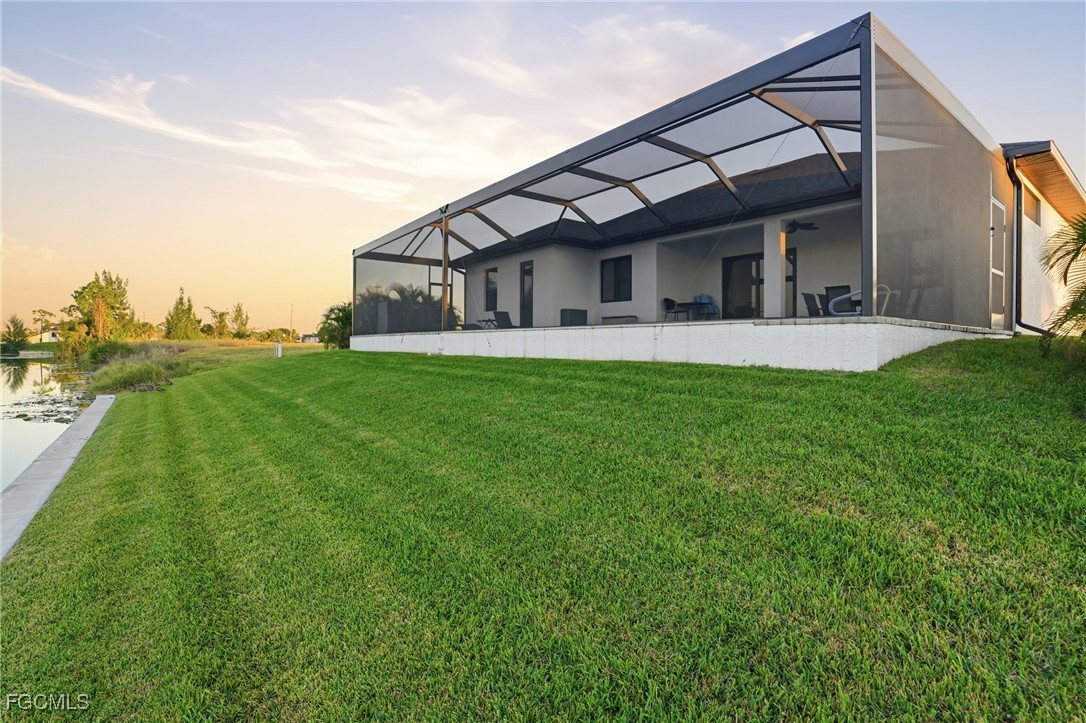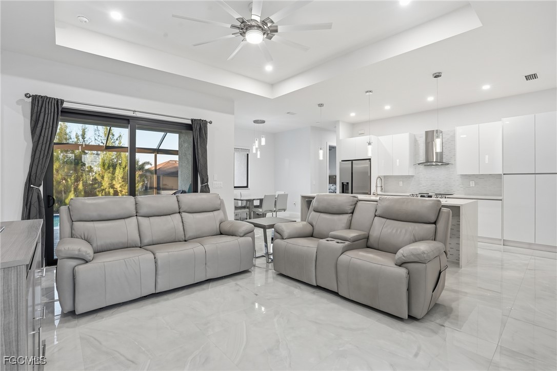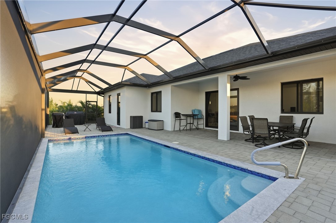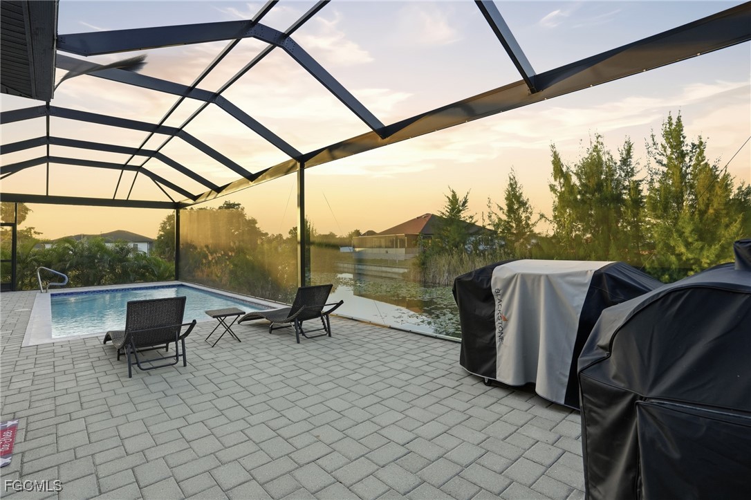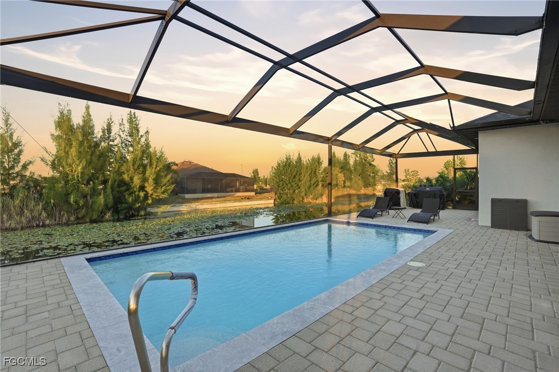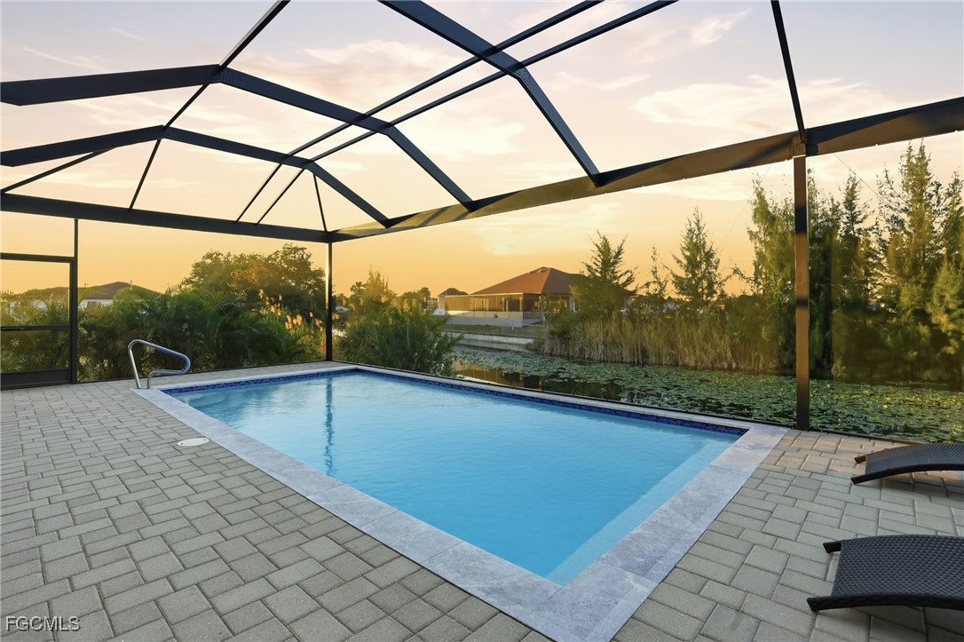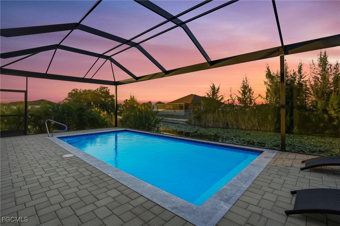Experience modern Florida living in this stunning, light-filled waterfront pool home situated on a wide freshwater canal. With 4 bedrooms, 3 bathrooms, a seawall, and an extended screened patio overlooking the sparkling pool, this home offers exceptional value—all at an incredible price and NOT in a flood zone. Step inside to discover high-end finishes throughout, including 8 ft doors, impact windows, and luxurious 32x32 porcelain tile flooring. The chef-inspired kitchen is truly the heart of the home, featuring sleek acrylic cabinetry, a dramatic waterfall quartz island, quartz counters, custom tile backsplash, modern vent hood, and premium appliances. All three bathrooms are beautifully appointed with quartz counters, frameless glass doors, and sophisticated tilework. Even the window sills are quartz—no detail was overlooked. The outdoor living area is an entertainer’s dream. Enjoy an oversized screened pool and cage with elegant picture-frame panoramic no seeum screens, a spacious lounge area, color-changing lighting, and an outdoor bar with drink cooler and serving station. The pool features a heater/chiller perfect for those FL summers, a full-width bench seat perfect for relaxing and socializing. Home is prepped and ready with electrical for generator. The freshwater canal with seawall offers wide-water views from every angle. Located on a quiet street with mostly newer homes and minimal traffic, this home puts convenience at your fingertips. Publix, the new Aldi, Lowe’s, Target, Walmart, plethora of restaurants to choose from are all just minutes away. A fantastic neighborhood park—complete with pickleball, tennis, a fenced playground, a kids’ zipline, and walking trails—is less than a mile away. Plus, you’re only a short drive to downtown Fort Myers, where restaurants, entertainment, and riverfront charm await. This is the whole package—style, location, upgrades, and value. It doesn’t get better than this!