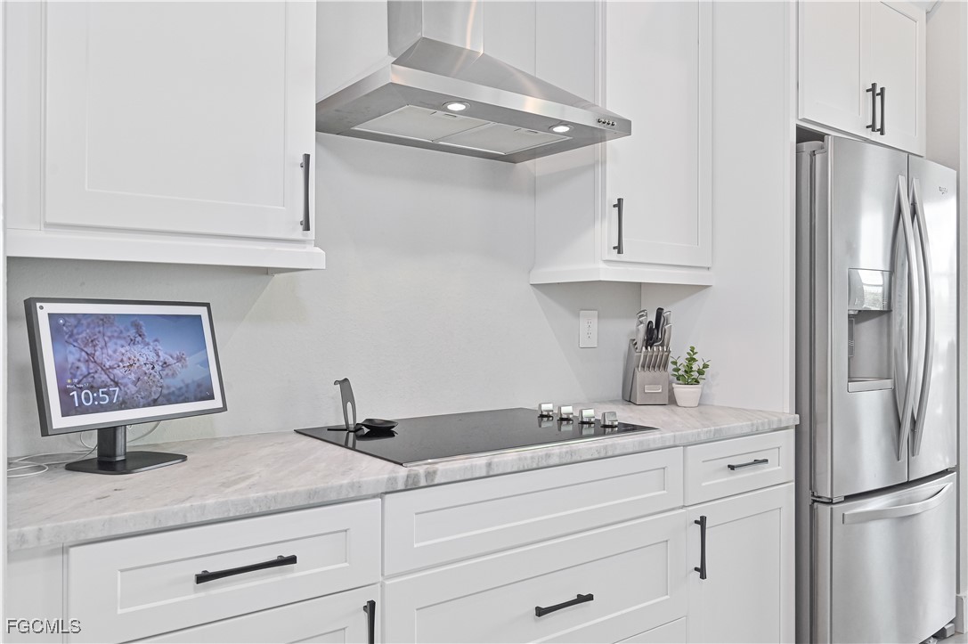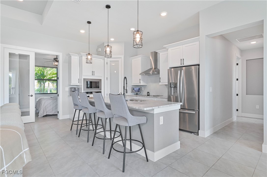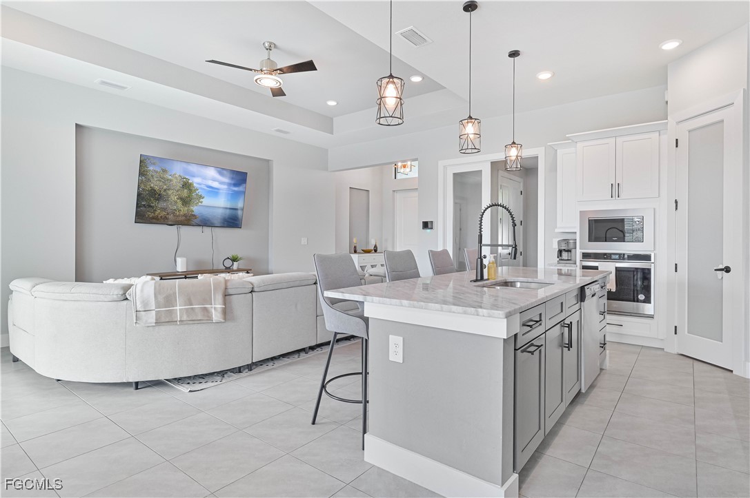Inside, the open-concept layout showcases a sleek modern kitchen with quartz counters, a large breakfast bar, premium cabinetry, and upgraded appliances—ideal for everyday living or hosting friends and family. Designed with the Florida lifestyle in mind, the outdoor area features a gorgeous custom pool and spa with peaceful canal views, a paver-lined patio, an outdoor shower, and a covered lanai already prepped for your future outdoor kitchen. The seawall is already installed, saving you time and expense.