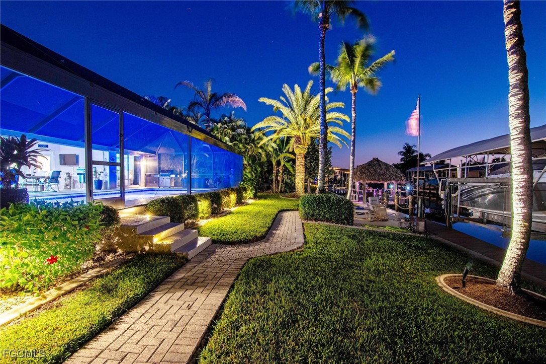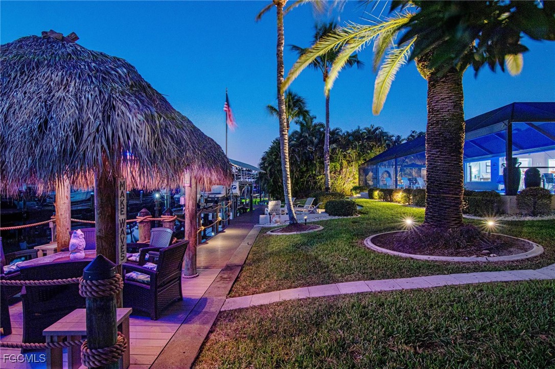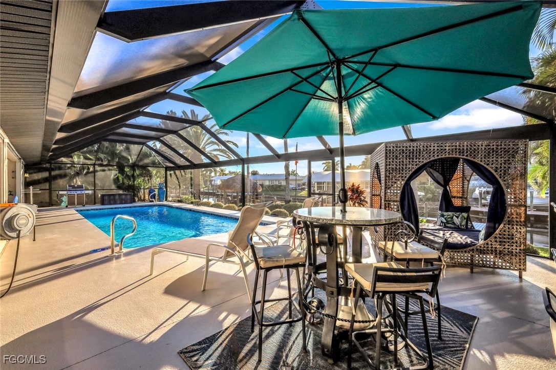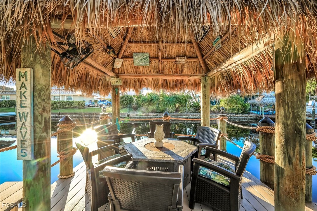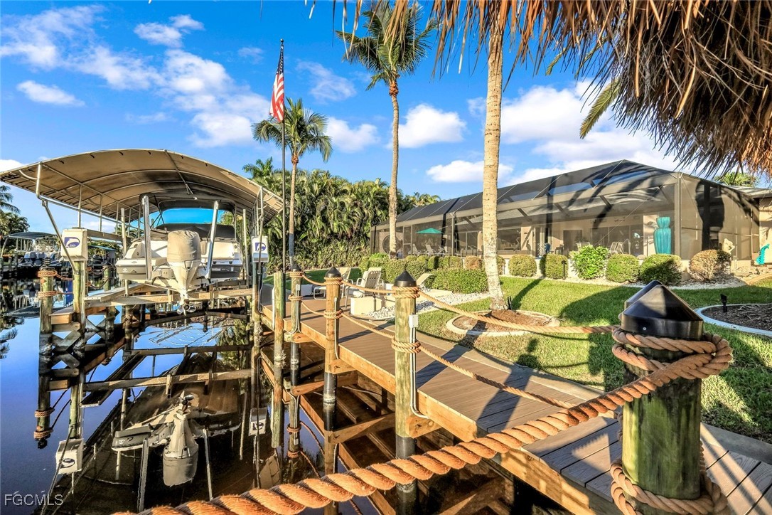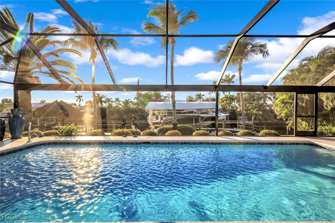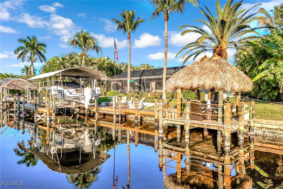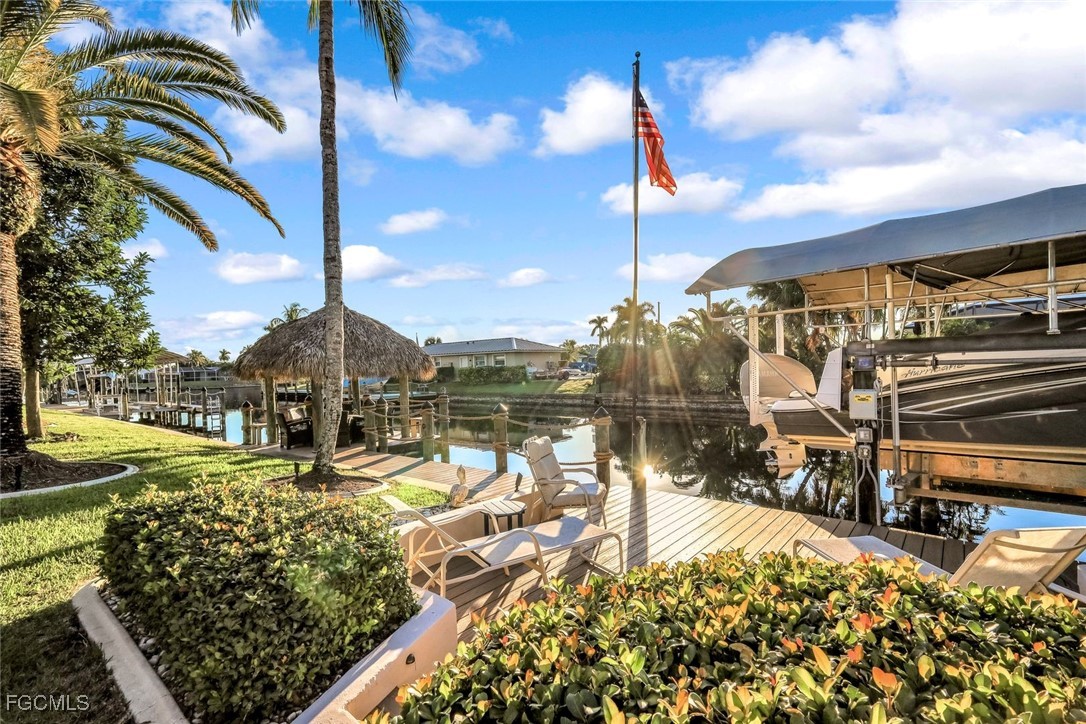 This home is in one of Cape Coral's most desirable boating neighborhoods, and is near the end of a cul de sac, only a few blocks off the river. Located within 5 minutes to open water by boat, there are no bridges to worry about, and the owners recently installed a new over water tiki hut, boat lift, and dock with a full captains walk. This beautifully maintained home has never had any water intrusion/flooding from hurricanes. The sellers have added several updates to the home in the last few years such as a new roof, resurfaced pool, new pool lights and controls, new exterior, and interior lighting, a panoramic screened lanai cage, and much more that you will not want to miss. This home would make a perfect primary, secondary, or investment property, as it is offered fully furnished. All you need to do is bring your boat and toothbrush. Schedule your tour today, and ask your Realtor for a full list of recent updates to the property!