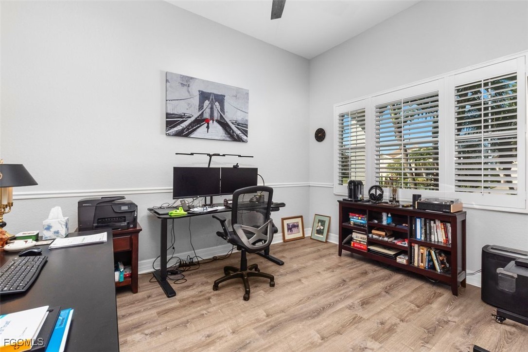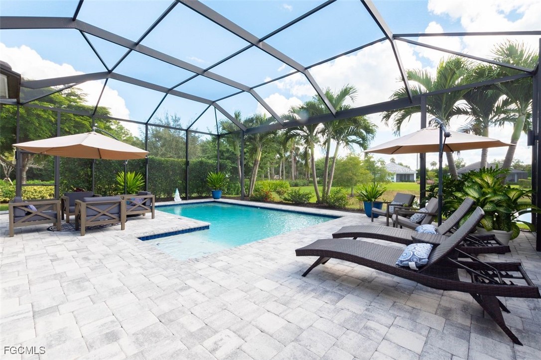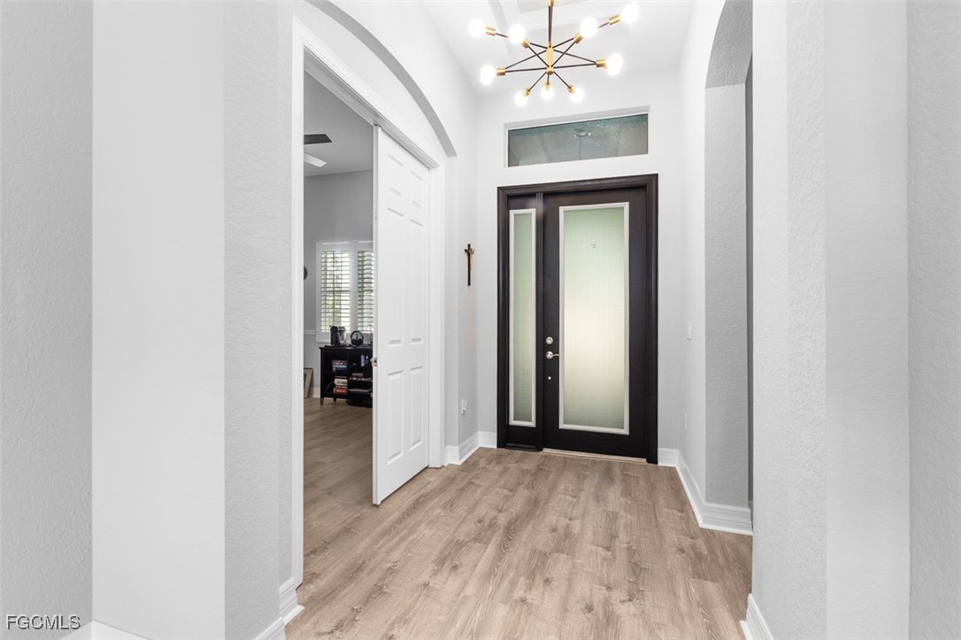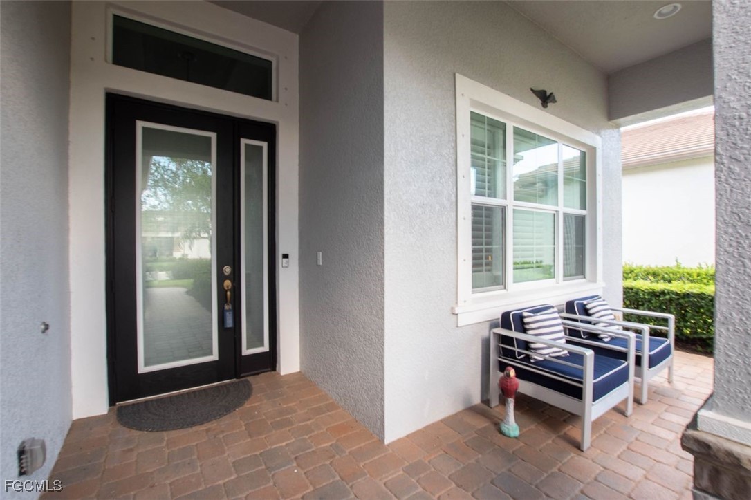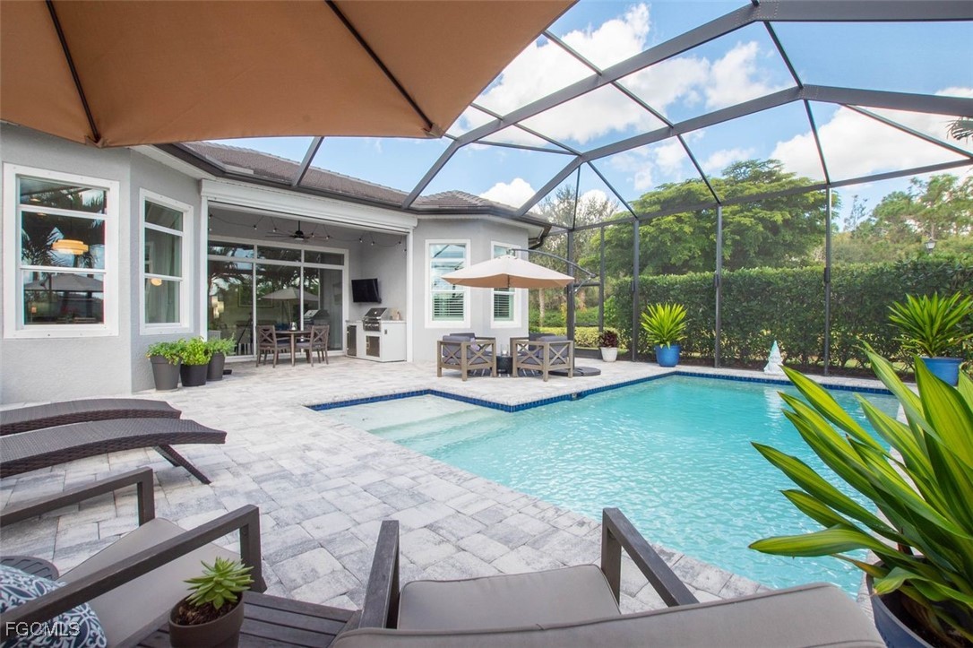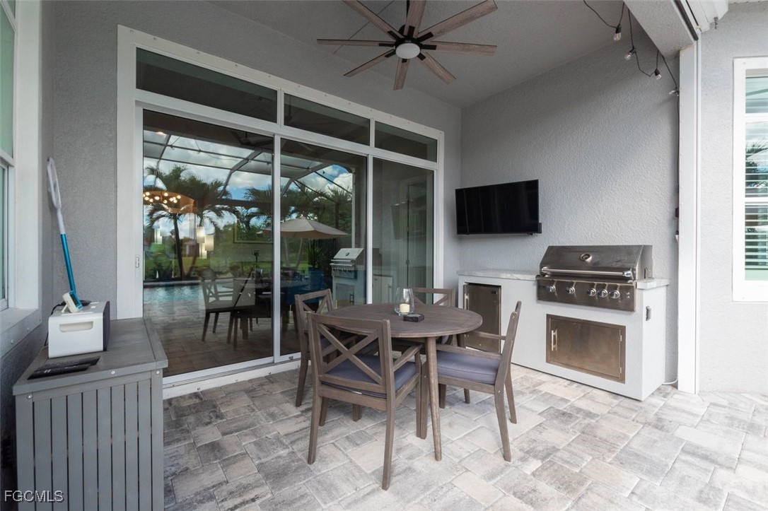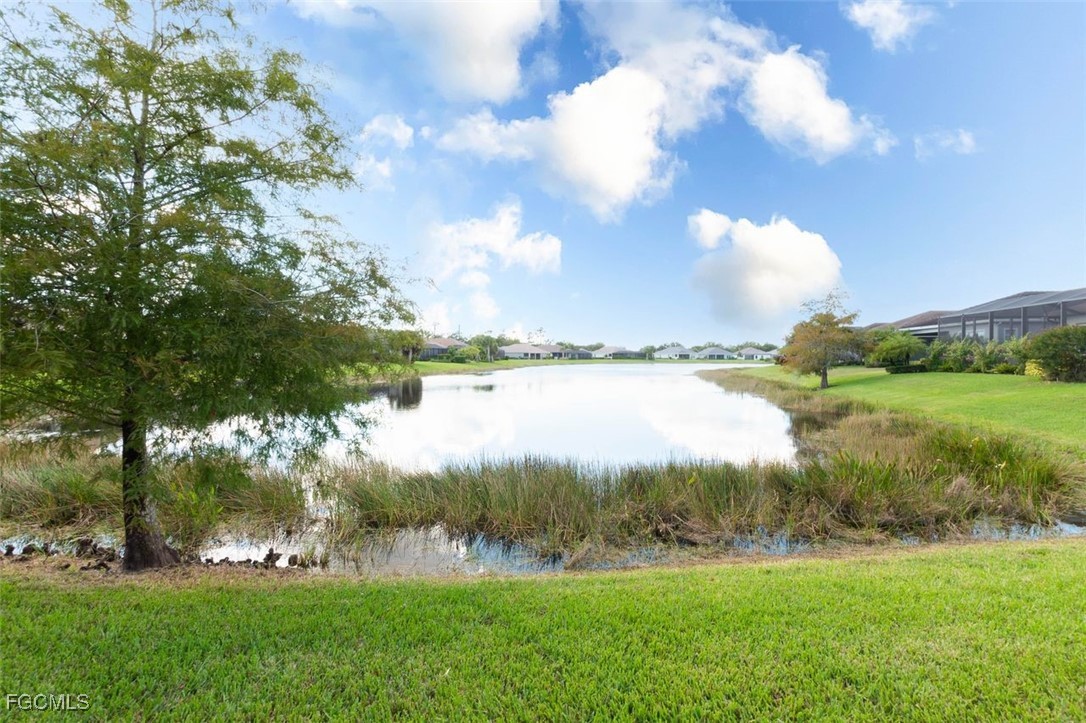 TRULY A REMARKABLE HOME that shows like a model. It's a rare find when you discover a mid range home with million dollar upgrades. This home offers 2 bedrooms, a study/den and a formal dining room which is currently being used as a exercise room. Beautiful and bright, the sliding barn doors close off the exercise room for privacy. PLANTATION SHUTTERS, custom ceiling fans and light fixtures add to the already beautiful interior. ALL the floors throughout (except for the bathrooms), have been replaced with elegant (LVP) flooring. The roomy eat-in kitchen features stainless steel BOSCH APPLIANCES and a HIGH END RANGE by SMEG. The screened in lanai has an oversized heated pool, an OUTDOOR KITCHEN, and ELECTRIC HURRICANE SHUTTERS. The mature landscaping, stately front elevation and views of a fresh water lake are stellar and never gets old. Verandah has created a wonderful lifestyle with two 18-hole championship golf courses, tennis courts, a state-of-the-art fitness center, a community pool, pickleball, and bocce ball courts....there's even a Doggy Park for man's best friend. For those who love outdoor activities, how about venturing out and KAYAKING on the adjacent ORANGE RIVER, or going for a nice bike ride or walk on the 9+ miles of trails? Verandah is conveniently located to Downtown Ft Myers, the Caloosahatchee River, and both the Ft Myers and Punta Gorda Airports