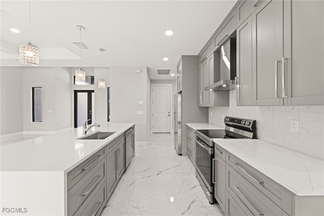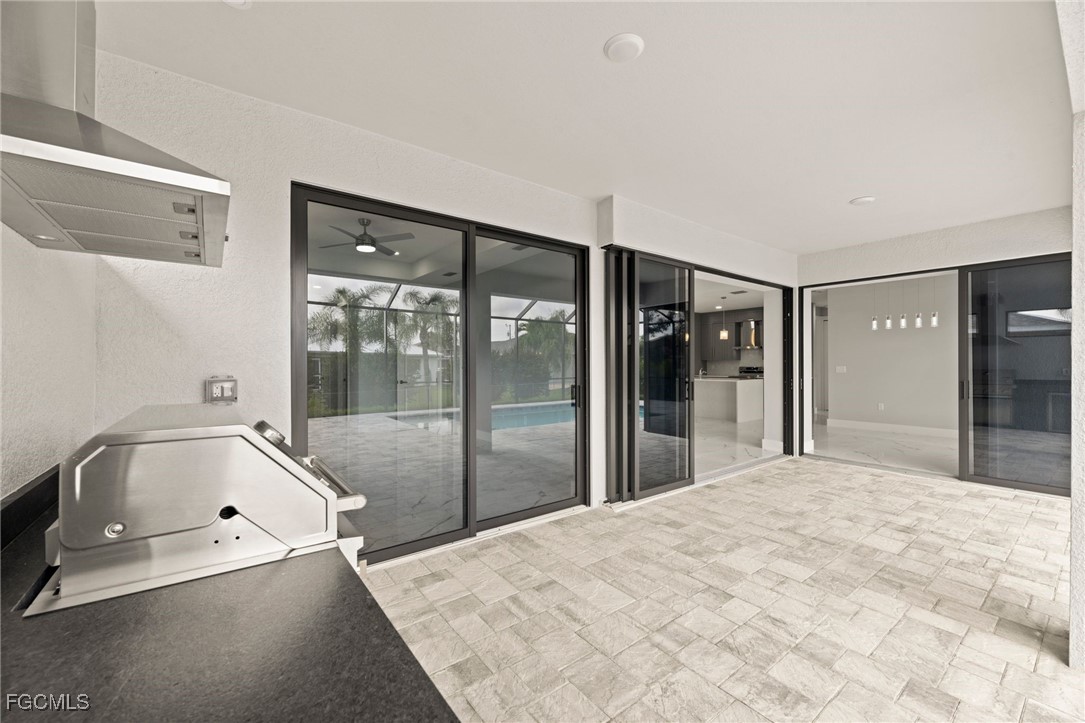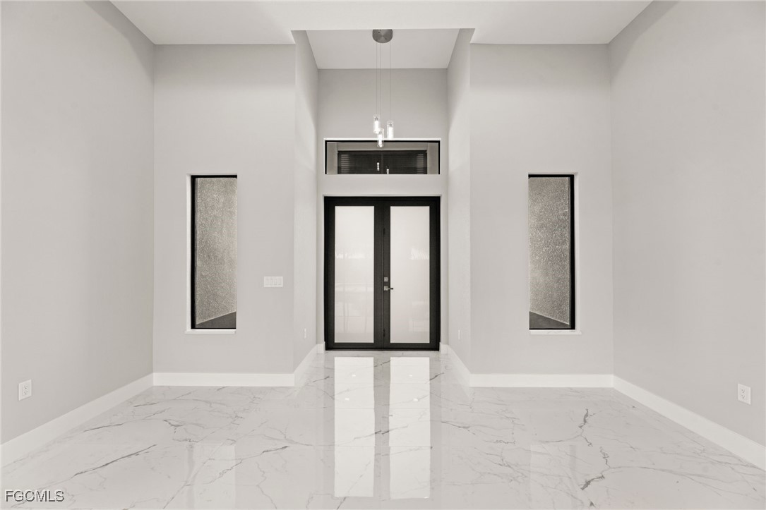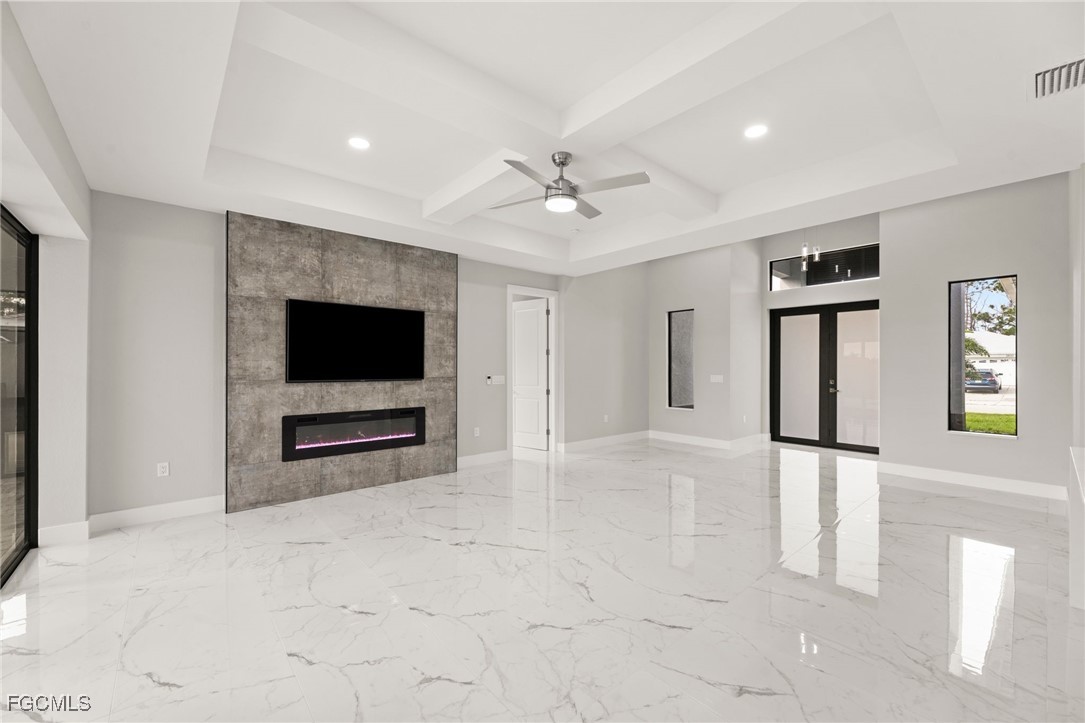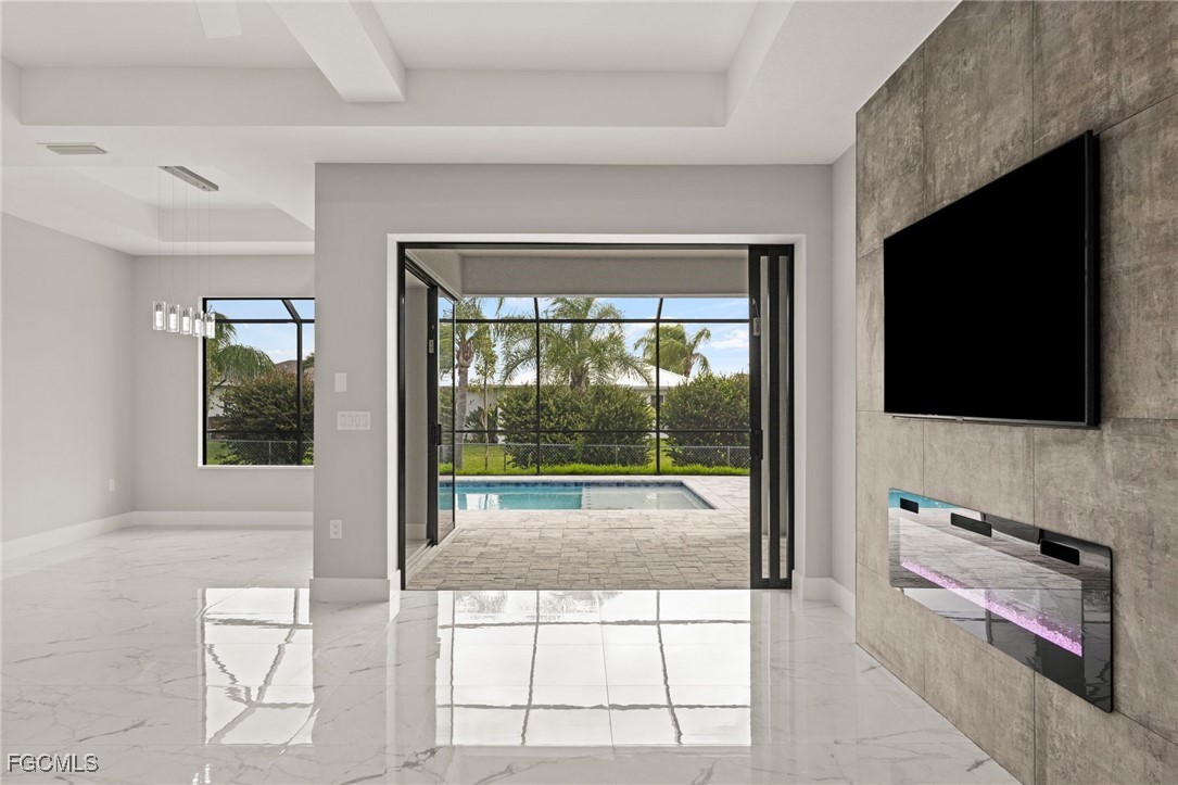The living room has 10ft coffered ceilings along with a custom built in TV-Enclosure with elegant tile backsplash, a built-in electric fireplace and a 70-inch smart TV (The enclosure can accommodate larger sizes). The entryway has 14ft cascading ceilings along with three large windows to offer plenty of natural light throughout the day and large frosted hurricane impact doors. Overlooking the living room is the large waterfall kitchen island with quartz countertops and extra seating.