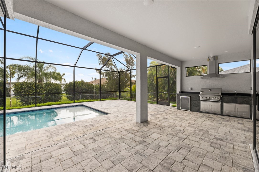 The kitchen features tall cabinets with soft close drawers and stainless-steel appliances. There is a walk-in pantry and directly across a large laundry room. The dining room has a large window and sliding doors leading out to the lanai with a relaxing view of the pool! Popular Floorplan!...offering plenty of entertainment space and convenience. There is beautiful porcelain tile flooring spread throughout the entire home. Enjoy your pool in the fully enclosed lanai enclosure that features pavers throughout and an outdoor grill station area with a small fridge, sink and hood and granite countertops.