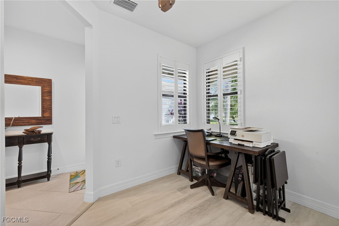 This beautifully maintained TURNKEY HOME sits on a premium cul-de-sac lot with beautiful lake and preserve views and is loaded with upgrades for comfort and peace of mind. Features include HURRICANE IMPACT WINDOWS, hurricane screens on the extended lanai, and a welcoming front entry with a glass-paneled door and retractable screen. Inside, you’ll find eight-foot doors, tile laid on the diagonal, plantation shutters, luxury vinyl plank flooring in the bedrooms, and recessed lighting in the living and dining areas. The kitchen shines with pendant lighting over the spacious island, undercabinet lighting, reverse osmosis at the sink, a double door pantry and a new electric range. The primary suite features a tray ceiling and a remodeled ensuite bathroom, while the den offers added flexibility with a Murphy bed. Step outside to enjoy your personal retreat. Watch the sunsets from the extended lanai with picture window screen and outdoor kitchen, perfect for relaxing or entertaining while taking in the serene views. Additional highlights include a whole-house salt-free water filtration system, new washer and dryer, an extended garage with epoxy floors and overhead storage, and fresh interior paint in 2024 and exterior paint in 2025. Bridgetown residents enjoy a beautiful resort-style pool, a separate chilled lap pool, and a state-of-the-art fitness center. The community also features pickleball and tennis courts, bocce courts, a play area, and a welcoming clubhouse that hosts social gatherings and events. Evenings are perfect for unwinding around the fire pit, making Bridgetown a place where neighbors connect and the Florida lifestyle truly shines. This home is move-in ready and waiting for you to enjoy the Florida lifestyle.