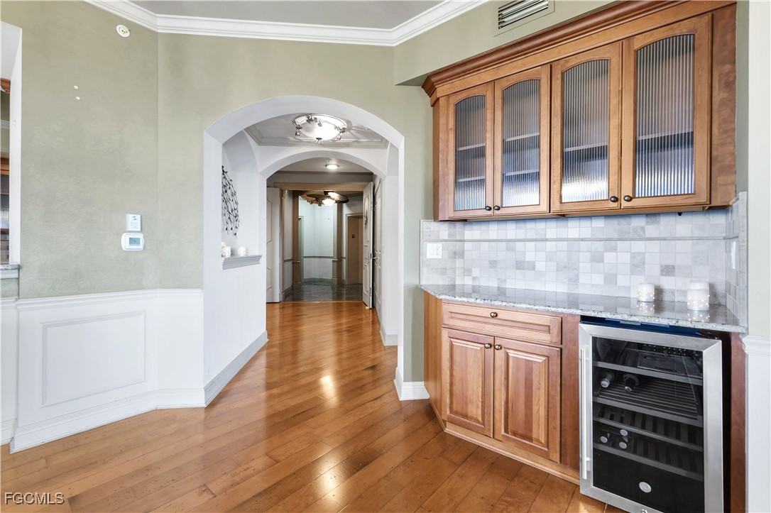 The great room, formal dining room, and office / den are finished with wide plank wood flooring. The kitchen is anchored by granite countertops, a large breakfast bar, and wood cabinetry, and includes a unique custom detail: a wooden walk-in pantry door with backlit etched glass showcasing a wheat motif—both artistic and functional.