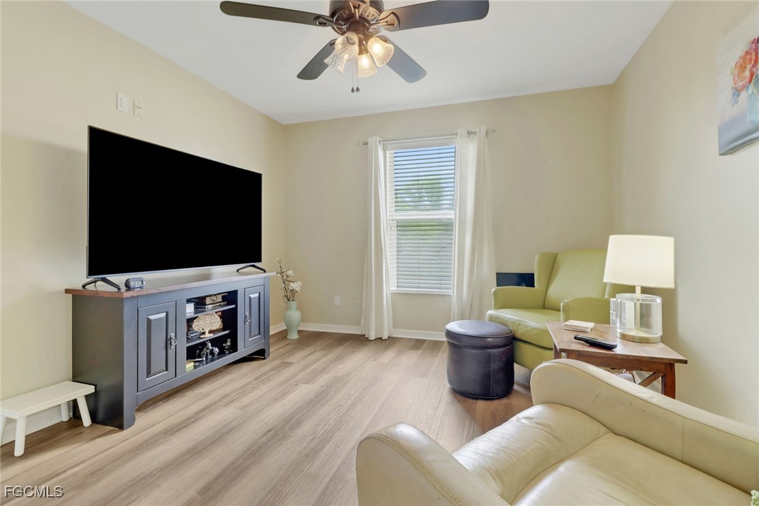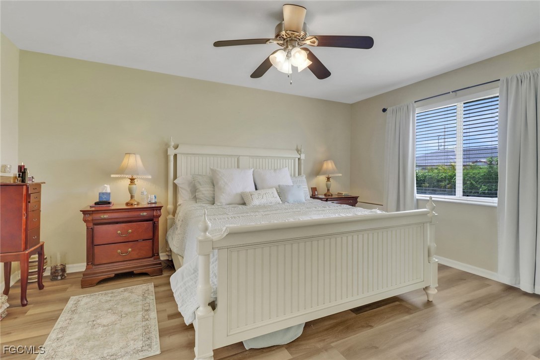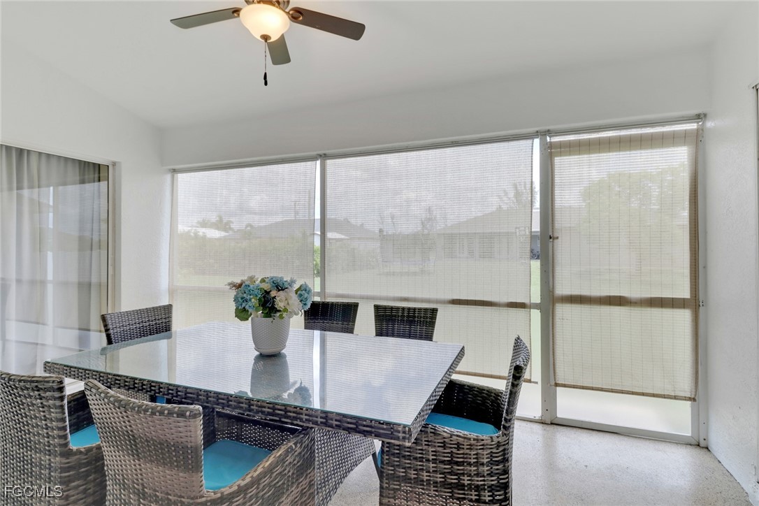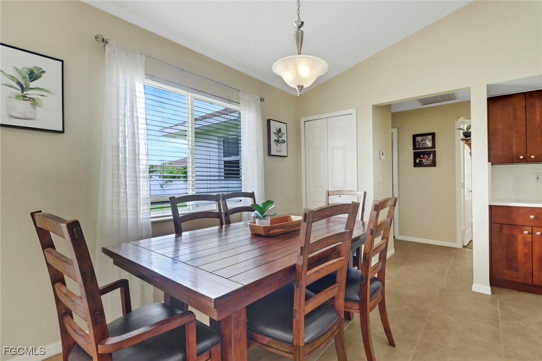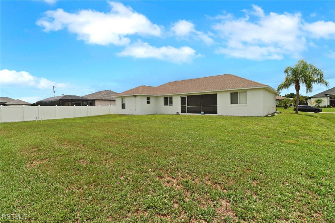 Welcome to this move-in-ready home in the heart of SW Cape Coral! This well maintained, 3-bedroom, 2-bathroom home offers just under 1,600 sq. ft. of bright, open living space! Freshly painted inside and out, it features tile flooring throughout the main areas, complemented by laminate in the bedrooms. The kitchen is a cook’s delight, showcasing sleek quartz countertops, a waterfall edge, and stainless-steel appliances. Natural light fills the interior, creating a warm and inviting atmosphere. The main suite is a true retreat, complete with sliders leading to the lanai, dual sinks, and a shower. Pocket sliders open to a generous lanai, overlooking a large yard with ample space for a pool or outdoor gatherings. Perfectly situated, this home offers close proximity to shops, restaurants, and easy access to Pine Island Rd and Veterans Pkwy. Don’t miss your chance to own this beauty, schedule your private tour today! *Flood Zone X, No Flood Insurance Required, 2021 Roof.*