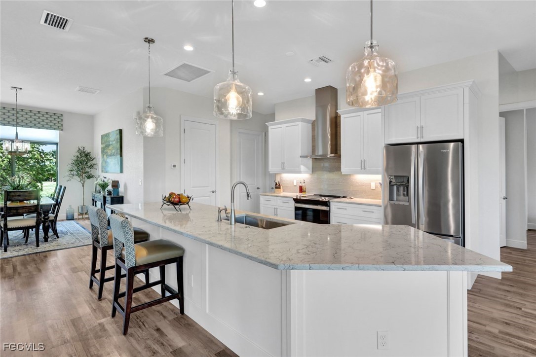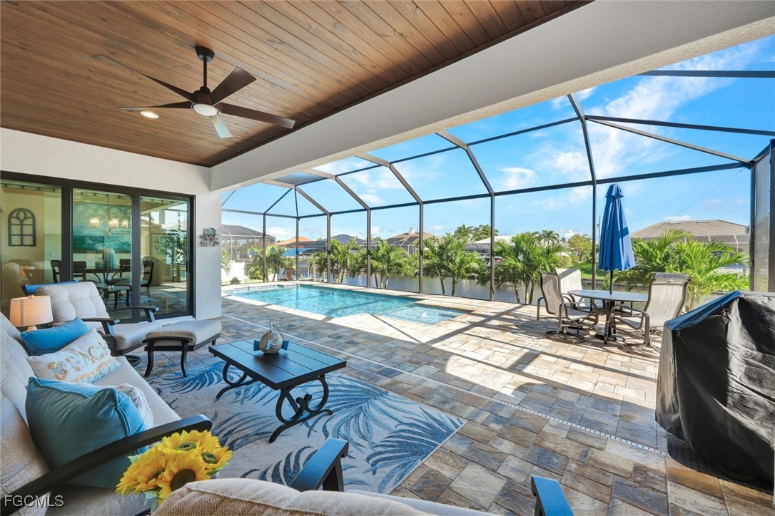 Discover your dream oasis in this stunning *GULF ACCESS POOL HOME*, nestled in the coveted *SURFSIDE AREA* of Cape Coral. Upon entering you'll notice that the *OPEN CONCEPT* floorplan seamlessly blends the kitchen, dining, and living spaces, creating a spacious and inviting atmosphere. Indulge in the gourmet kitchen boasting *WOOD CABINETRY WITH QUARTZ COUNTERTOPS*, glass tile backsplash, *STAINLESS STEEL APPLIANCE PACKAGE WITH HOOD*, and a spacious pantry. Interior features include volume ceilings adorned with tray ceilings and indirect lighting, *IMPACT GLASS* windows and sliding glass doors accented with *CUSTOM CORNICES AND ELECTRIC COVERINGS*, wood-ventilated closet shelving throughout, dual closets in master bedroom, *GENERATOR HOOK-UP*, and a decorative lighting package. The *90° SLIDING GLASS DOOR* offers beautiful canal views and seamless access to your outdoor oasis. Step outside to your expansive lanai with *CYPRESS CEILING*, or take a dip in the sparkling *HEATED SALTWATER POOL* featuring a paver deck, auto-fill system, sunshelf with bubbler, and screened cage. With its spacious *THREE CAR GARAGE* featuring epoxy flooring, overhead storage racks, and a security safe, you'll have plenty of room for your vehicles and belongings. The exterior features a *TILE ROOF*, *PAVER DRIVEWAY* and *LUSH LANDSCAPING* with elegant lighting and concrete curbing, creating an inviting entrance to this exquisite property. This is a truly exceptional home in one of Cape Coral's most sought-after neighborhoods. BONUS: All homes on this street are gulf access properties!