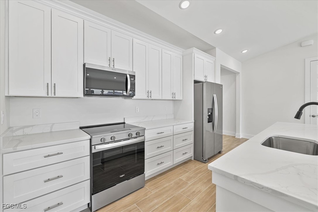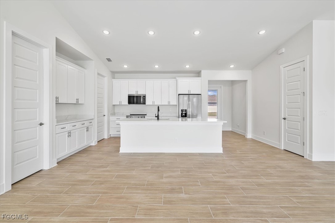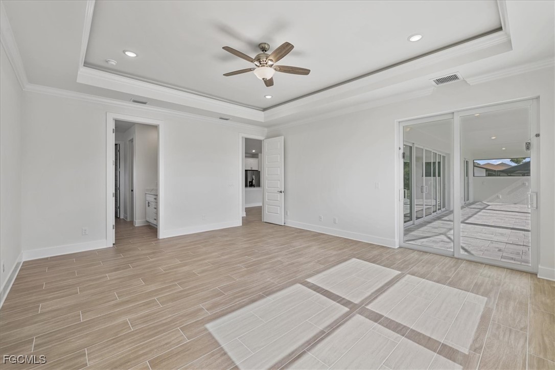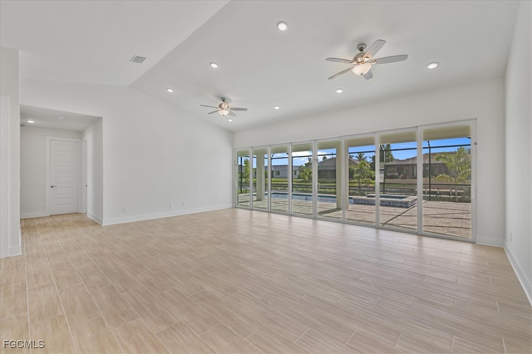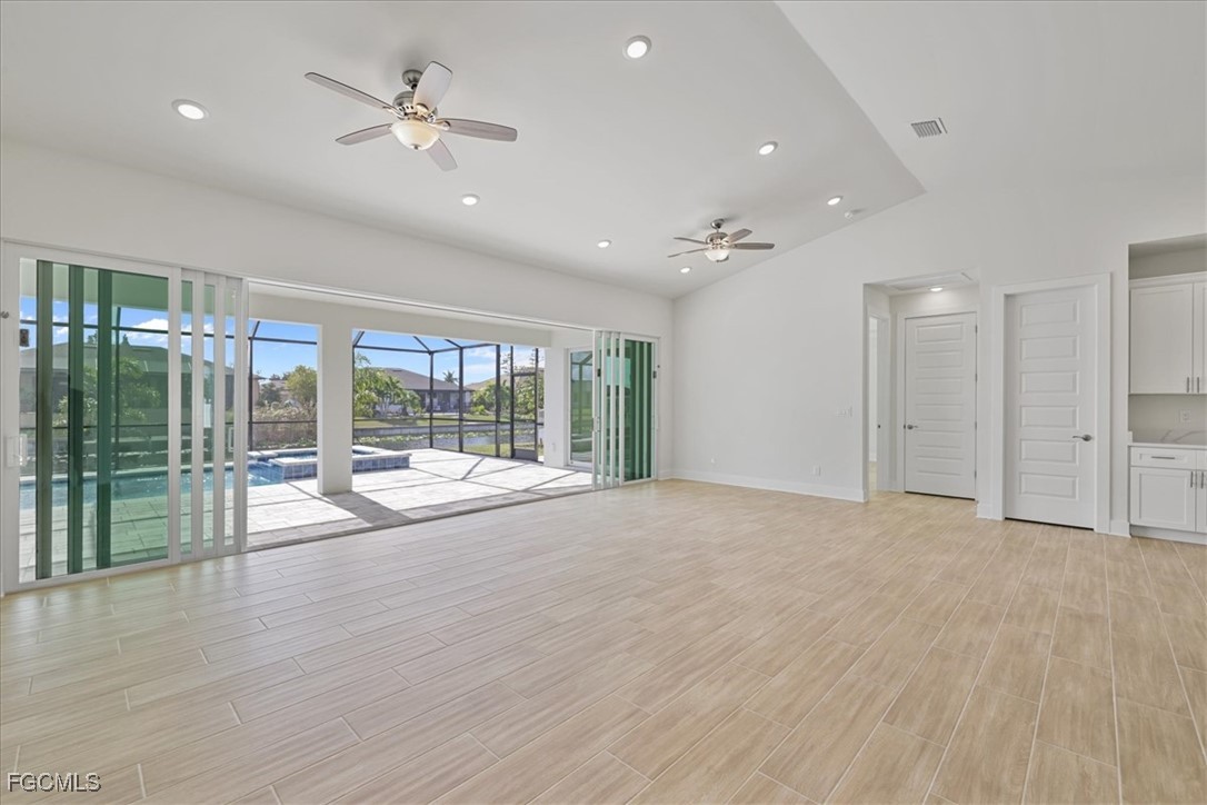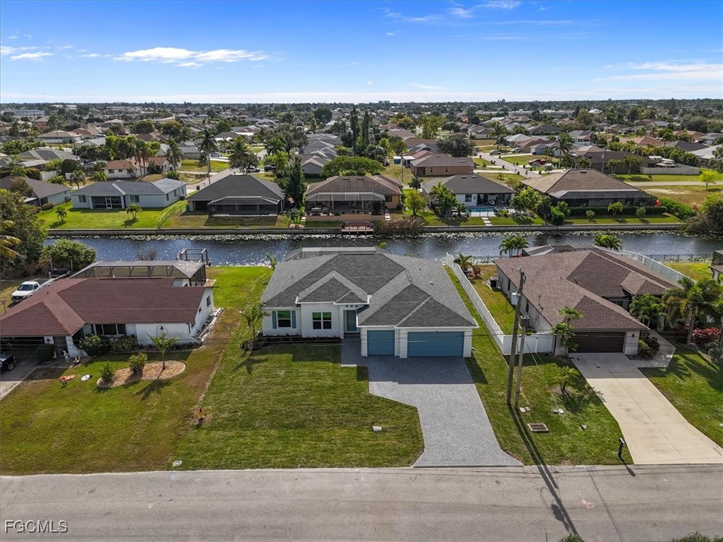 Brand-new waterfront construction in Cape Coral offering modern design, flexible living, and true Florida lifestyle appeal. This 4-bedroom, 3-bath home features 2,265 square feet of bright, open living space with soaring ceilings, porcelain tile throughout, and a seamless open-concept layout ideal for everyday living and entertaining. The chef-inspired kitchen includes quartz countertops, stainless steel appliances, a large island, soft-close all-wood cabinetry, and a walk-in pantry. Oversized 24-foot sliding glass doors open to a spacious screened lanai with heated pool and spa, creating effortless indoor-outdoor living with peaceful canal views. The split floor plan offers two private primary suites with tray ceilings, walk-in closets, and en-suite baths—perfect for guests or multi-generational living. Impact-rated windows, upscale finishes, a 3-car garage, canal frontage, and no flood zone complete this exceptional opportunity to own a move-in-ready waterfront home in one of Southwest Florida’s most desirable areas. This is the Coral Haven Plan