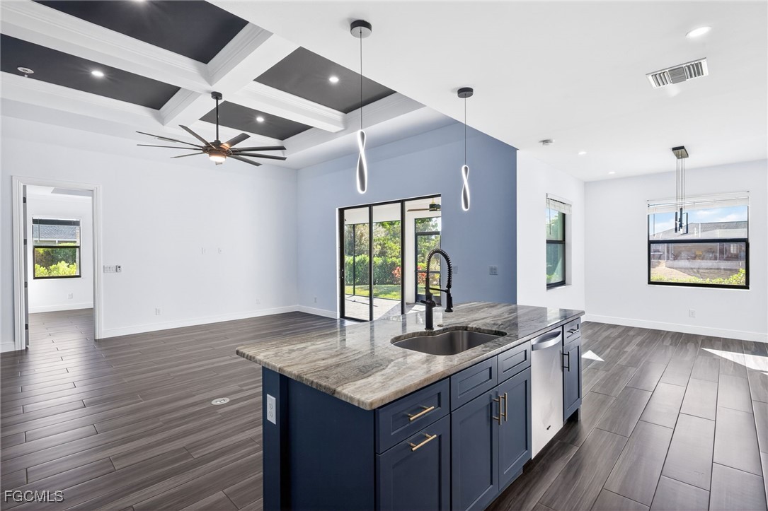 The home welcomes you with a MAGNIFICENT FRENCH DOOR ENTRY and a STONE PAVER DRIVEWAY. Inside, you will immediately notice the attention to detail, including COFFERED CEILINGS WITH RECESSED LIGHTING, along with DESIGNER LIGHT FIXTURES AND FANS THROUGHOUT. The den features a CUSTOM BARN DOOR adding a unique touch.