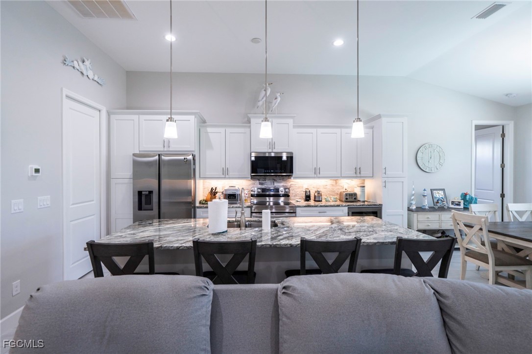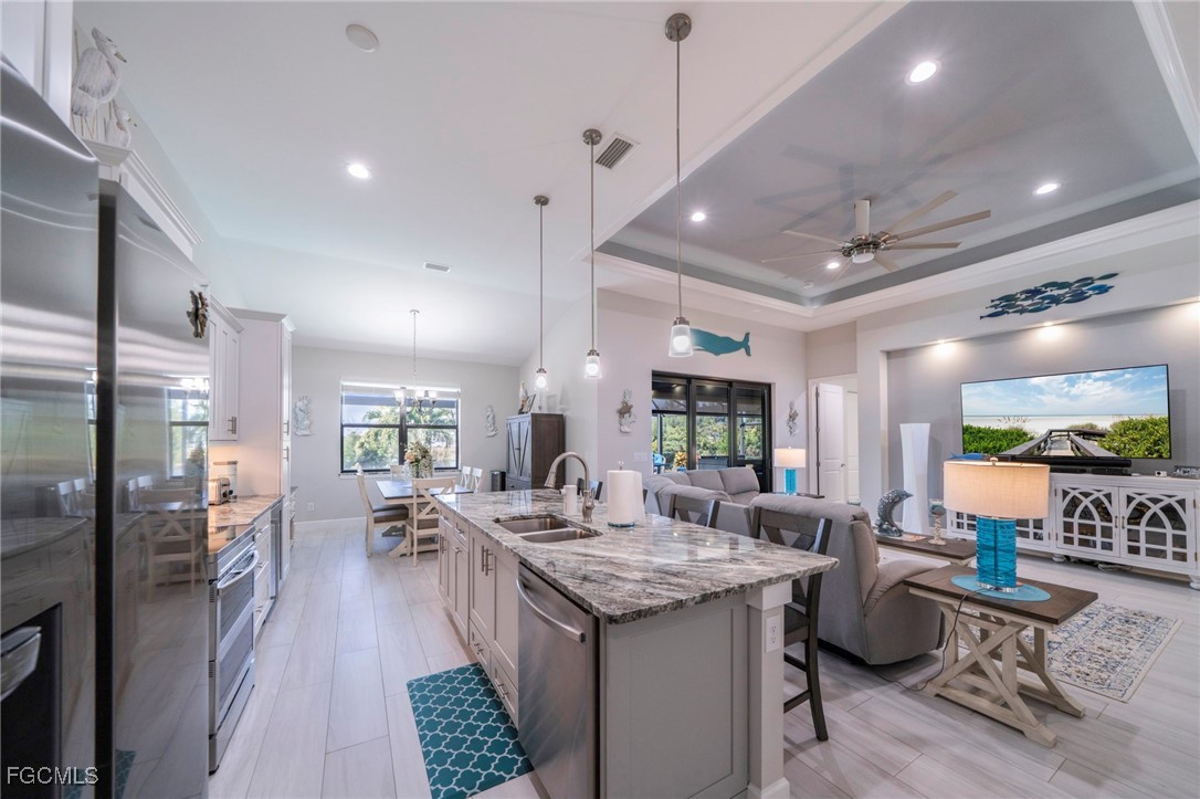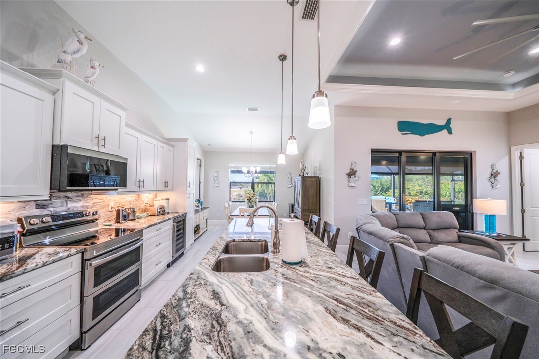 **NO FLOOD ZONE** This 4 bedroom spec (fresh water canal) home is 4 years young, being sold FURNISHED and is in IMMACULATE condition! ALL city utilities are IN and ASSESSMENTS are PAID! Located in a desirable SW Cape Coral location, close to Trafalgar Middle, Grade school(s) and the New Christian Life Academy. The home was built in 2021, with only one owner who put so many upgrades into it, that it is a MUST SEE! Between Kevlar roll down shutters, custom shades and window treatments; Generac generator (with transferable warranty) plus a Sonos surround system. Updated landscaping (high end palms) (with irrigation) plus curbs were installed. As you enter the grand double doors, you have a sense of this modern beauty with it's amazing high tray ceilings which provide an open feel to the living room and kitchen; ceramic tile, high end furnishings and lighting throughout. Gorgeous light and bright custom “soft close” cabinetry in the kitchen with granite counters and glass mosaic back splash. Upgraded Samsung Stainless Steel appliances (including convection oven and wine fridge) washer and dryer. The main bedroom is spacious and outfitted with walk-in closets; the main bath has a large walk-in shower featuring separate vanities. The opposite side of the home has (3) spacious bedrooms connecting to a gorgeous guest bathroom which features a porcelain tub, granite counter and access to the pool / lanai area. Your outdoor oasis faces west and has paver decking with plenty of room for a kitchen (new in-ground propane tank) plus room to sun and entertain. Custom paver driveway, lanai and walk-ways plus 3 car garage w/Husky shelving unit(s). Pool is heated. Great for a family, retirees or as an investment - schedule your appointment today- it's a beauty!!