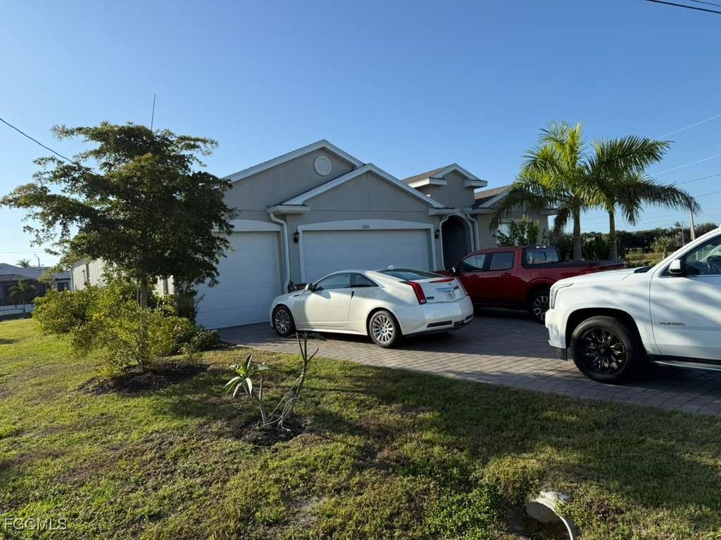 Beautiful and spacious like-new home with nearly 2,400 sq. ft. under air, located on a corner lot in one of the most desirable neighborhoods of Southwest Cape Coral. This residence features a triple garage, brick paved driveway, and freshwater canal access, perfect for enjoying the relaxed Florida outdoor lifestyle. All city assessments for water, sewer, and irrigation are paid in full, offering peace of mind and exceptional value. The open-concept floor plan showcases a modern island kitchen with granite countertops and stainless-steel appliances, generous living areas filled with natural light, and a screened lanai ideal for entertaining or relaxing. The great room and master bedroom both feature elegant tray ceilings. The owner's suite includes a separate shower and soaking tub, providing a spa-like retreat. Additional highlights include an indoor laundry room and high-quality finishes throughout. Ideally situated near top-rated schools, supermarkets, and restaurants, with easy access to Fort Myers via the Veterans Memorial Bridge. Experience the perfect combination of comfort, convenience, and quality living in this exceptional Cape Coral home.